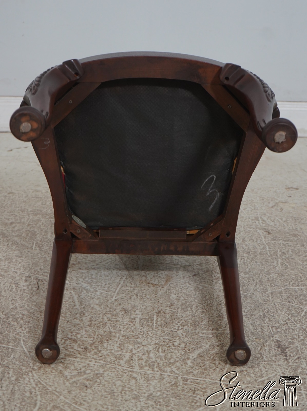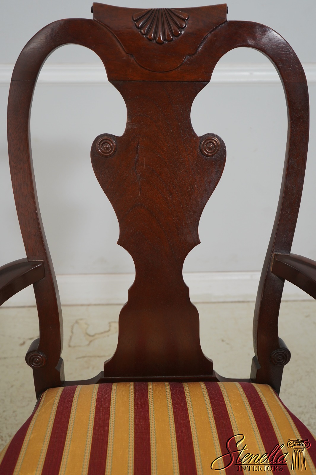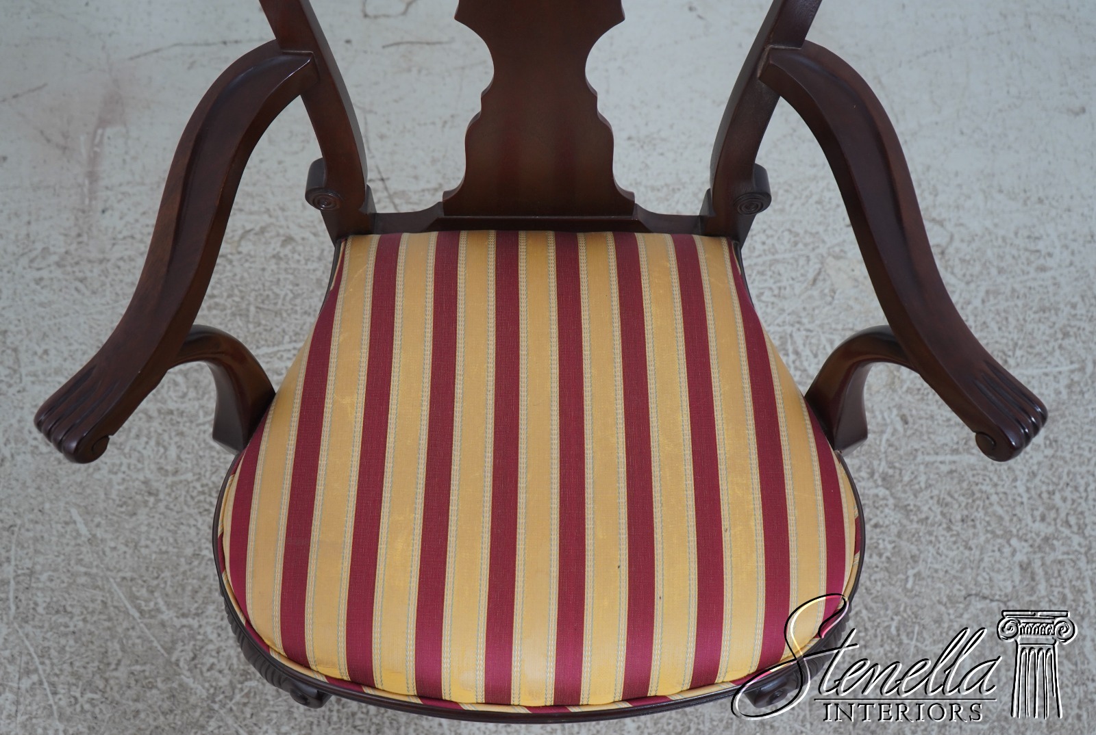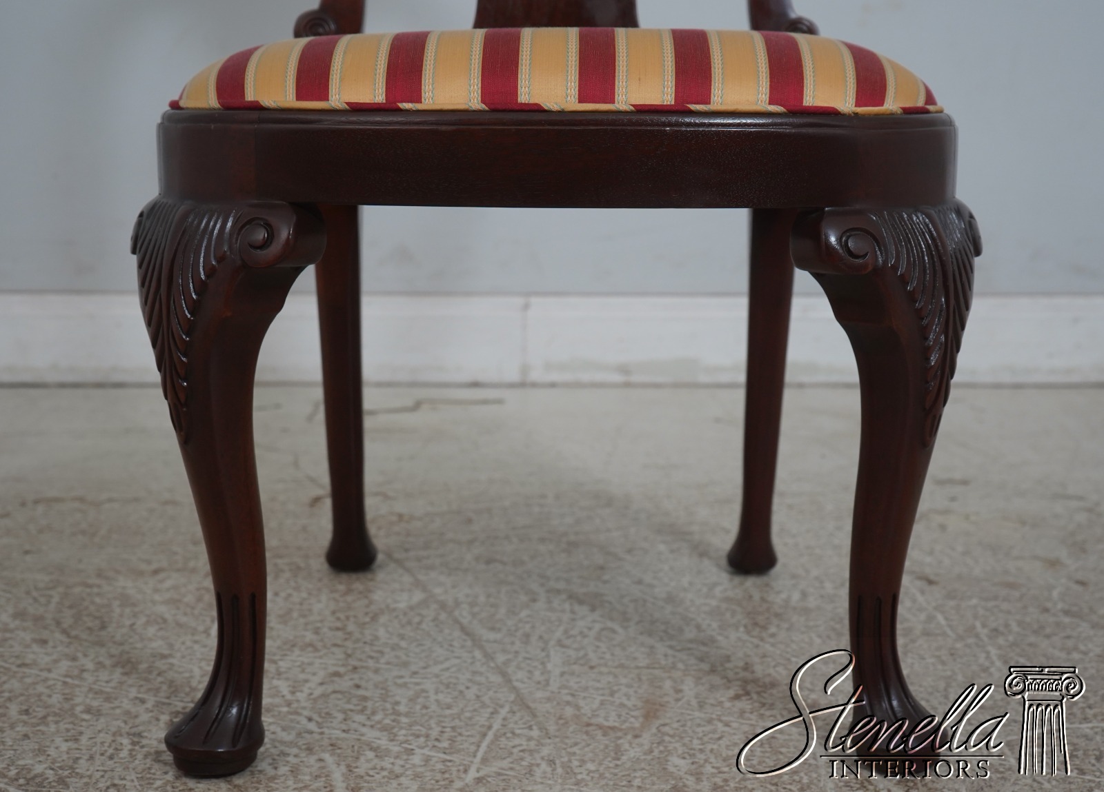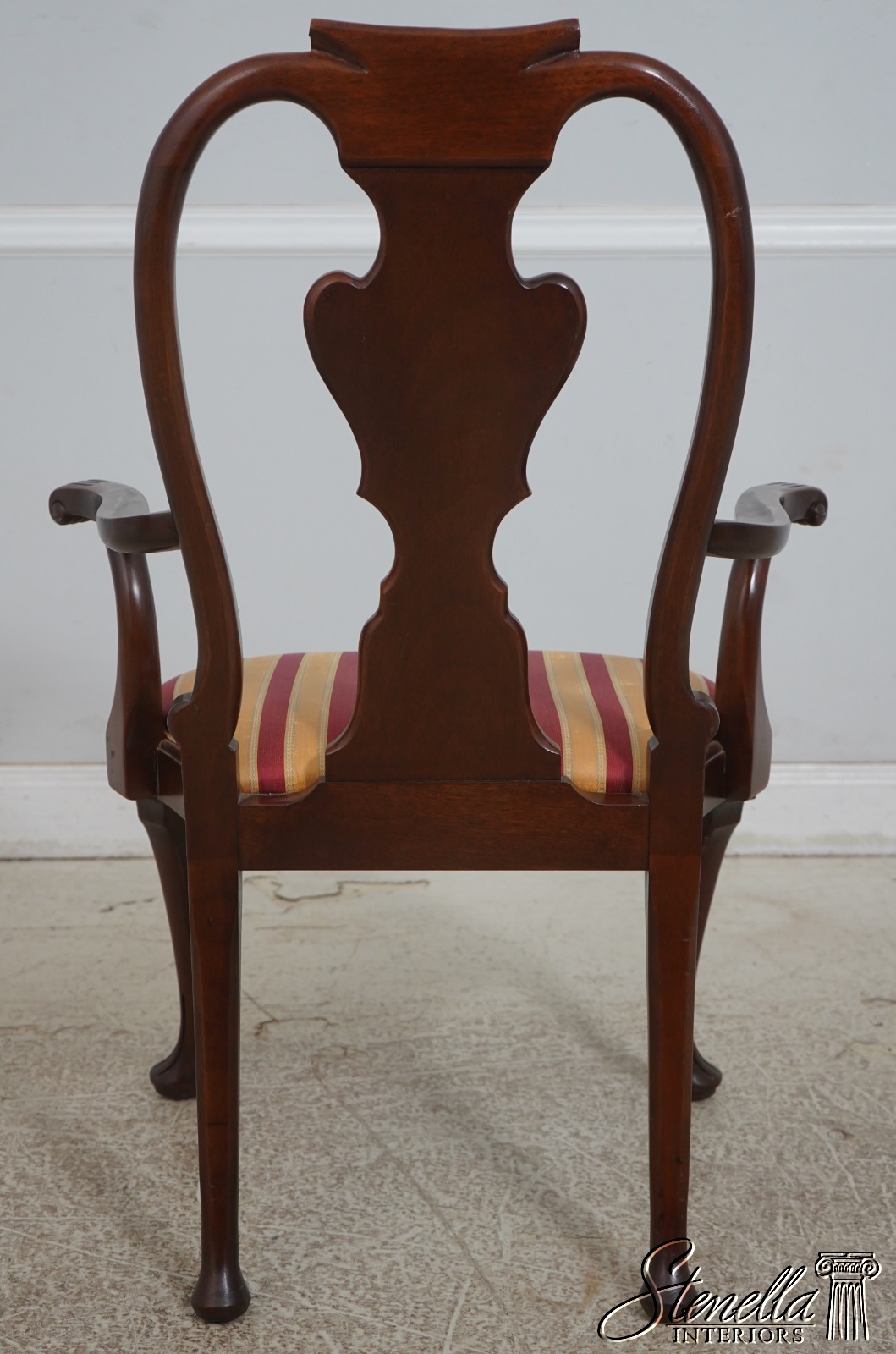 Details: Nice Striped Upholstery w. Minor Light Soiling Quality Construction Queen Anne Legs & Pad Feet Carved Knees Reddish Mahogany Finish Offered @ Fraction Original Retail Cost