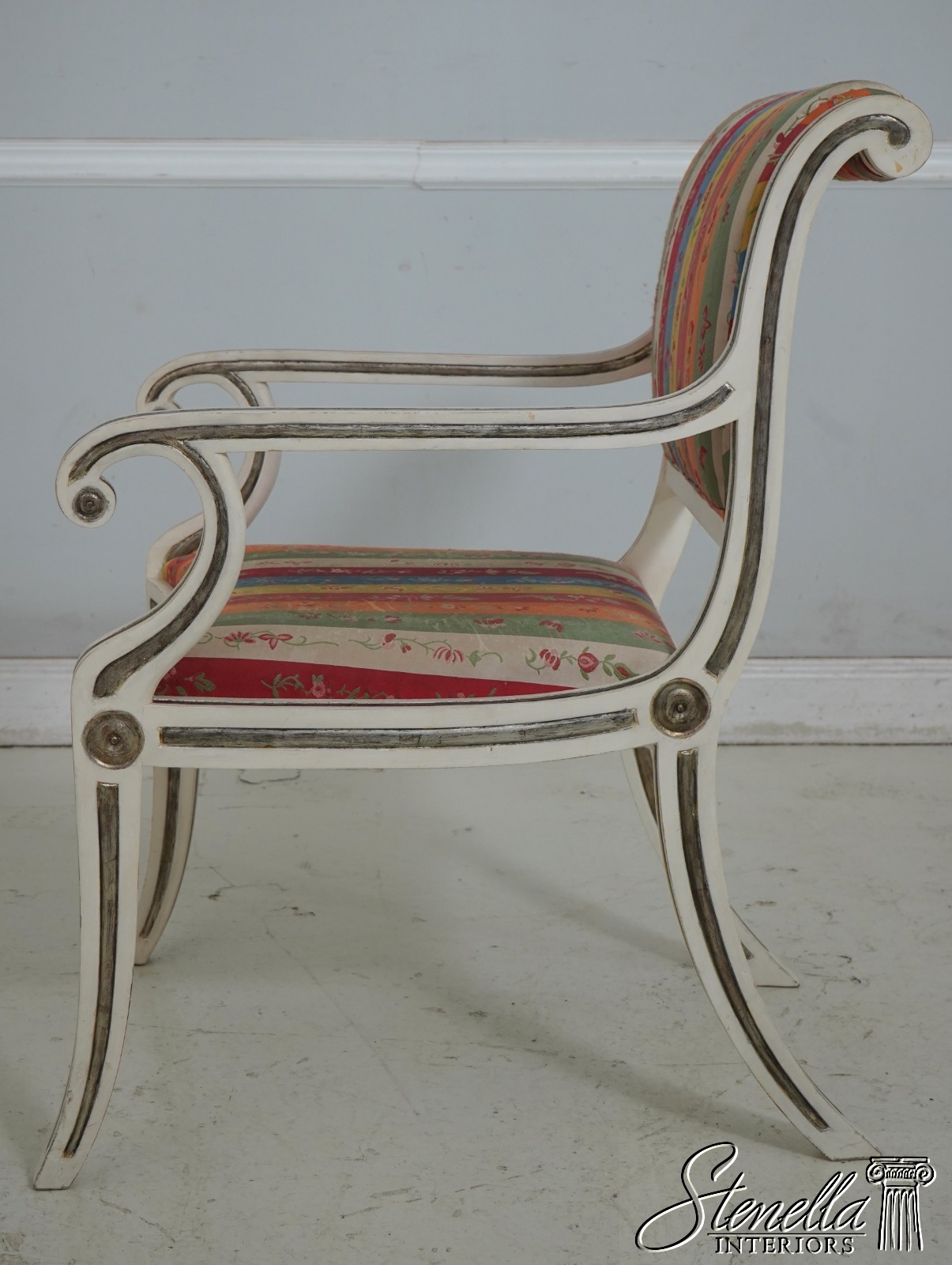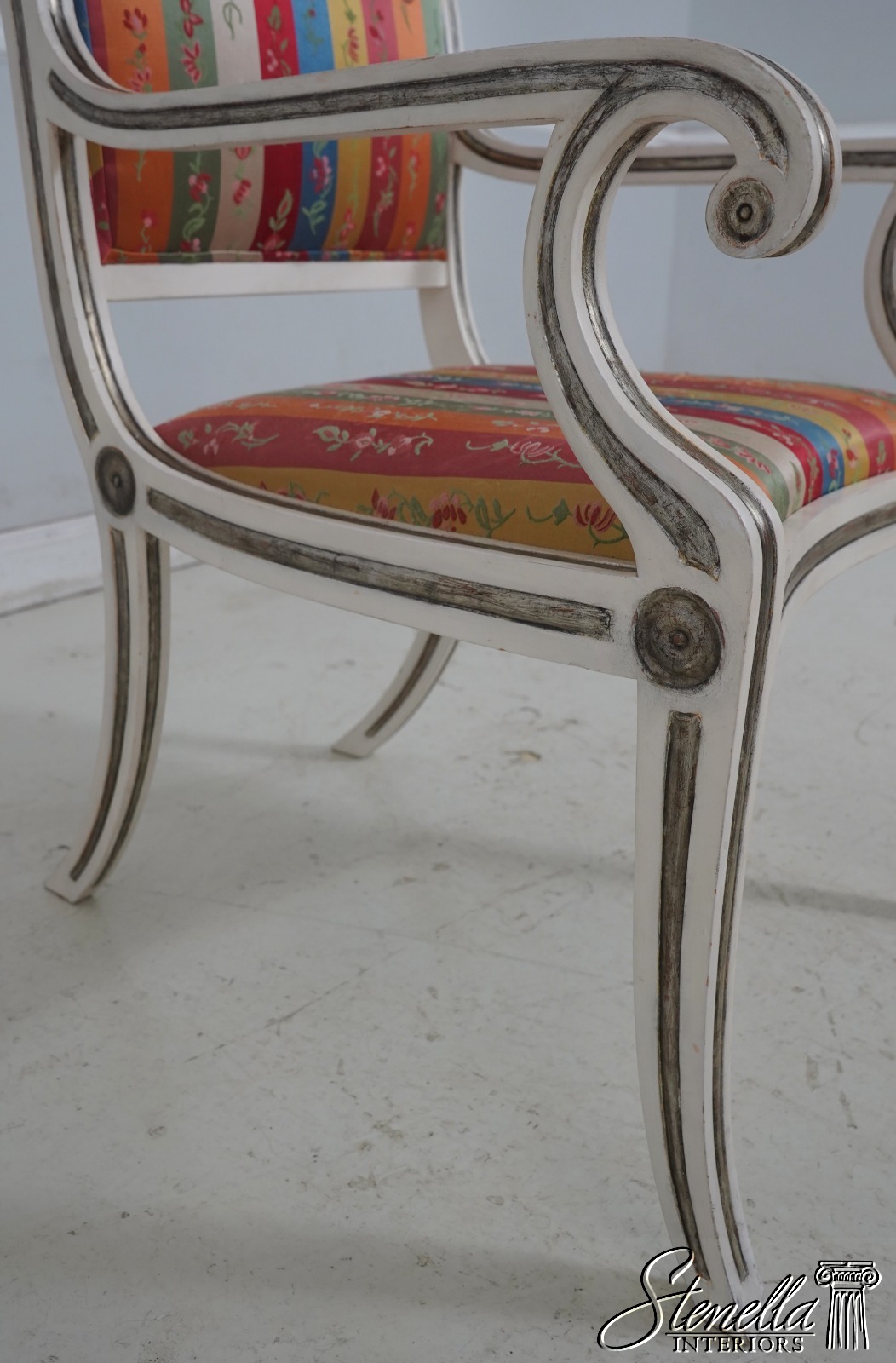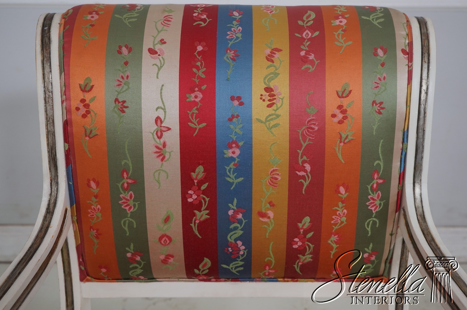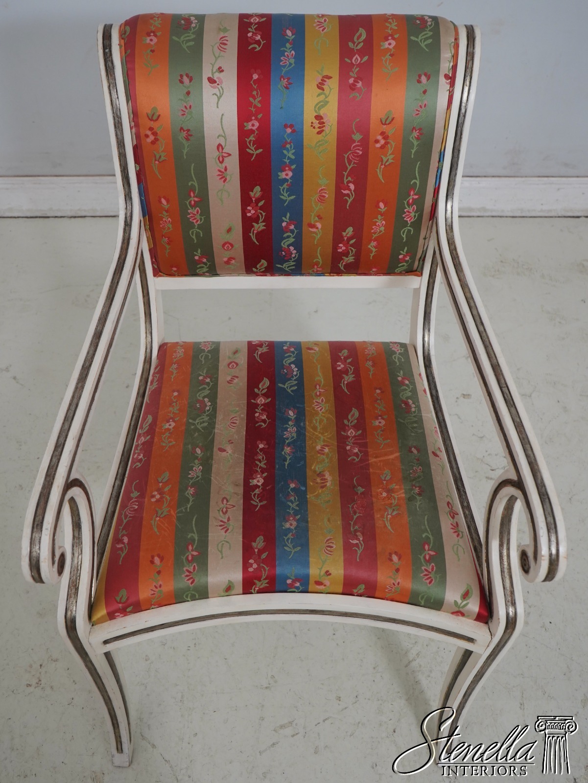 Details: Neoclassical Style Fine Carved Details High Quality Construction Curved Sabre Legs Off White & Silver Paint Scroll Arms & Back Un-Marked As To Manufacture Different Fabric On Arm vs. Side Chairs Offered @ Fraction Original Retail Cost