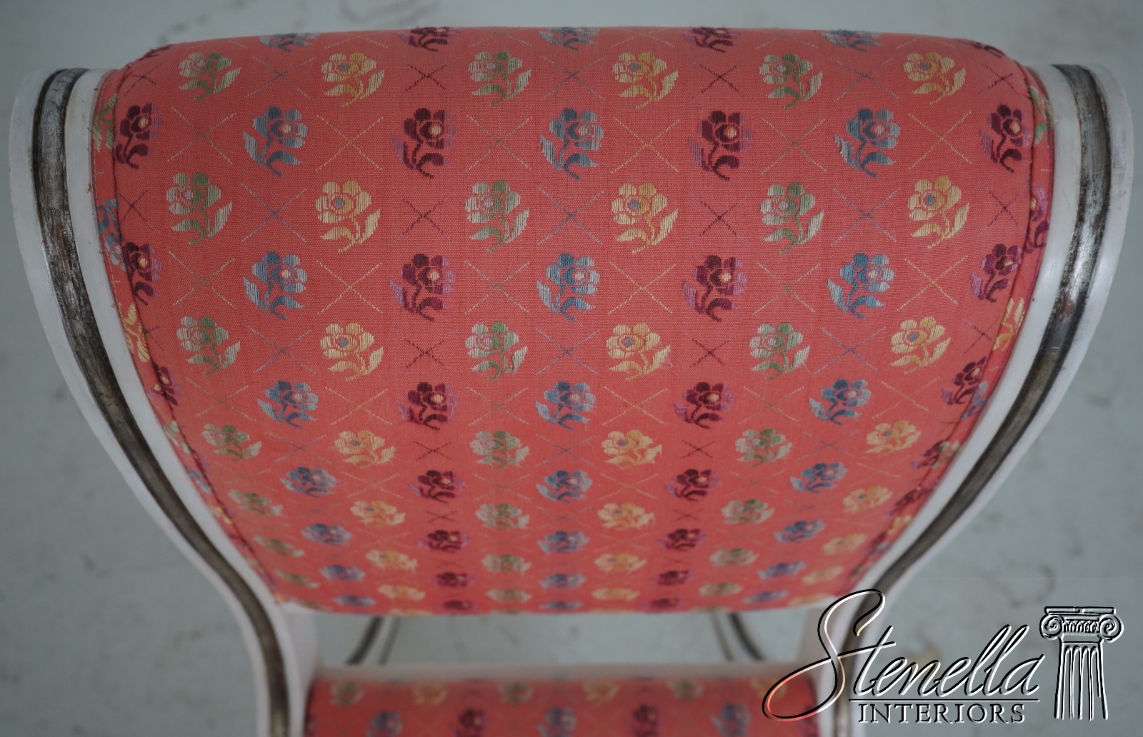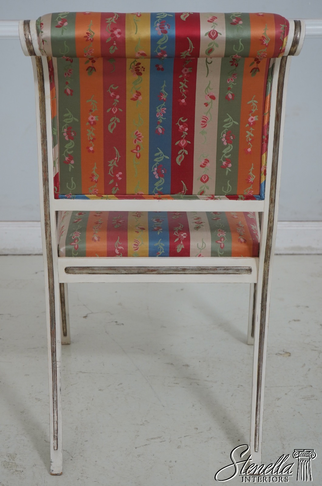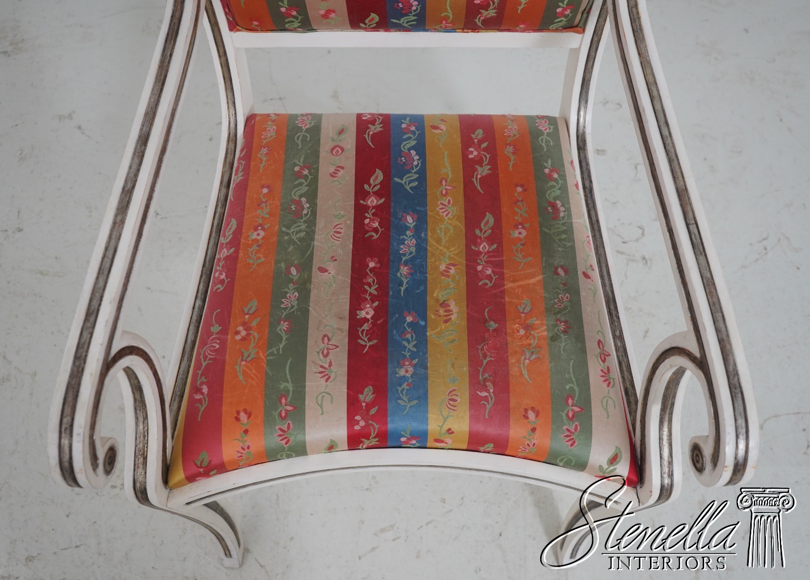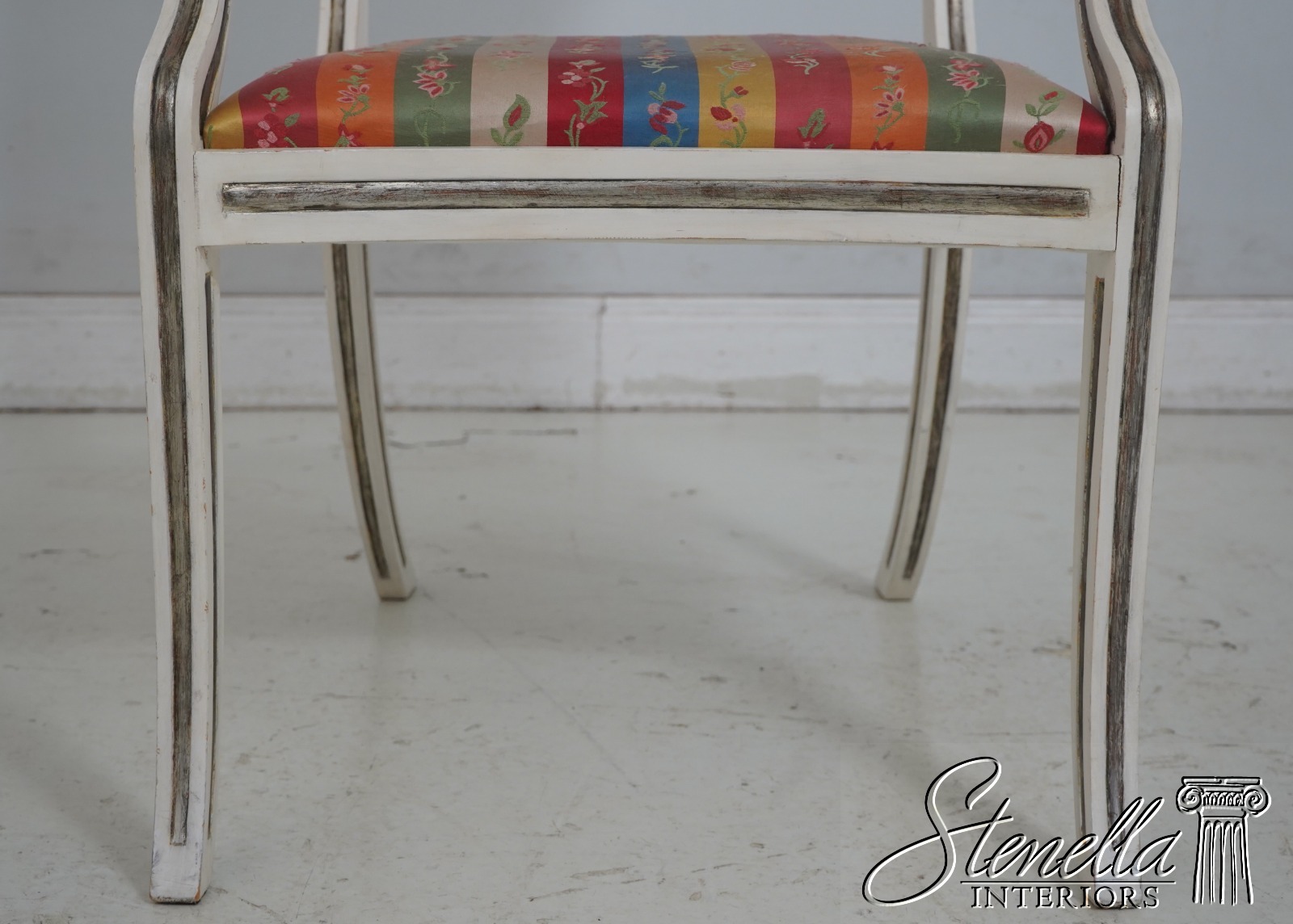 Details: Neoclassical Style Fine Carved Details High Quality Construction Curved Sabre Legs Off White & Silver Paint Scroll Arms & Back Un-Marked As To Manufacture Different Fabric On Arm vs. Side Chairs Offered @ Fraction Original Retail Cost