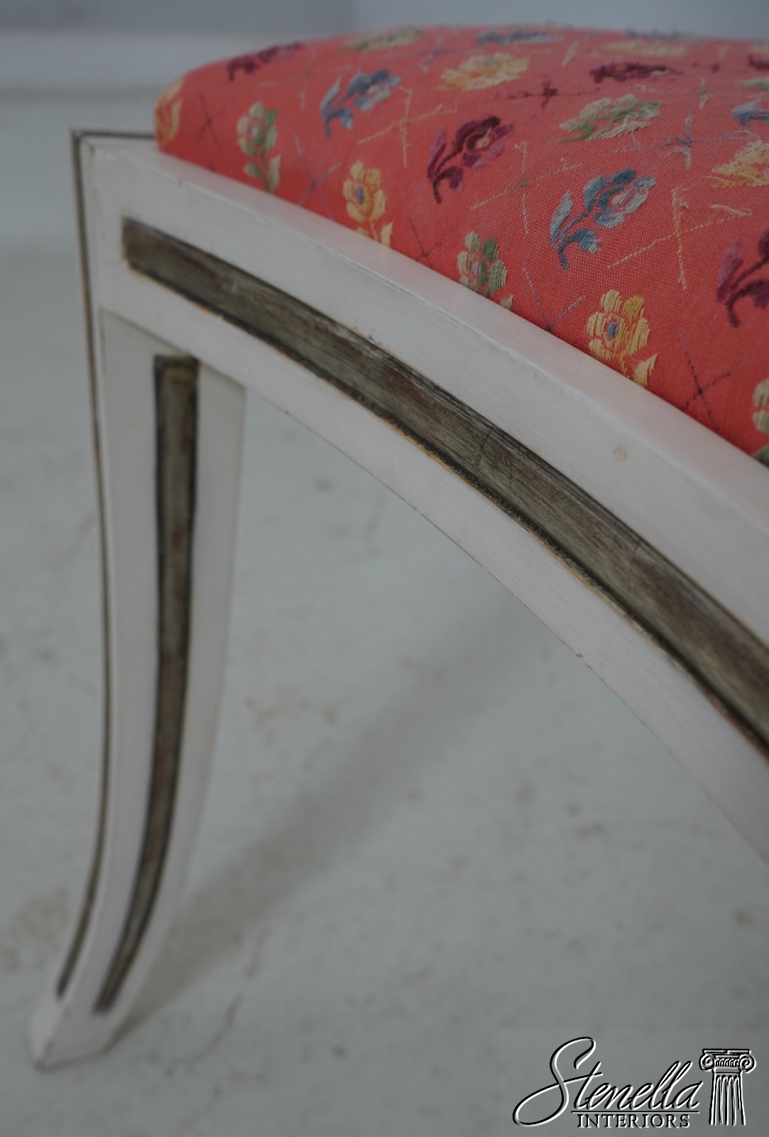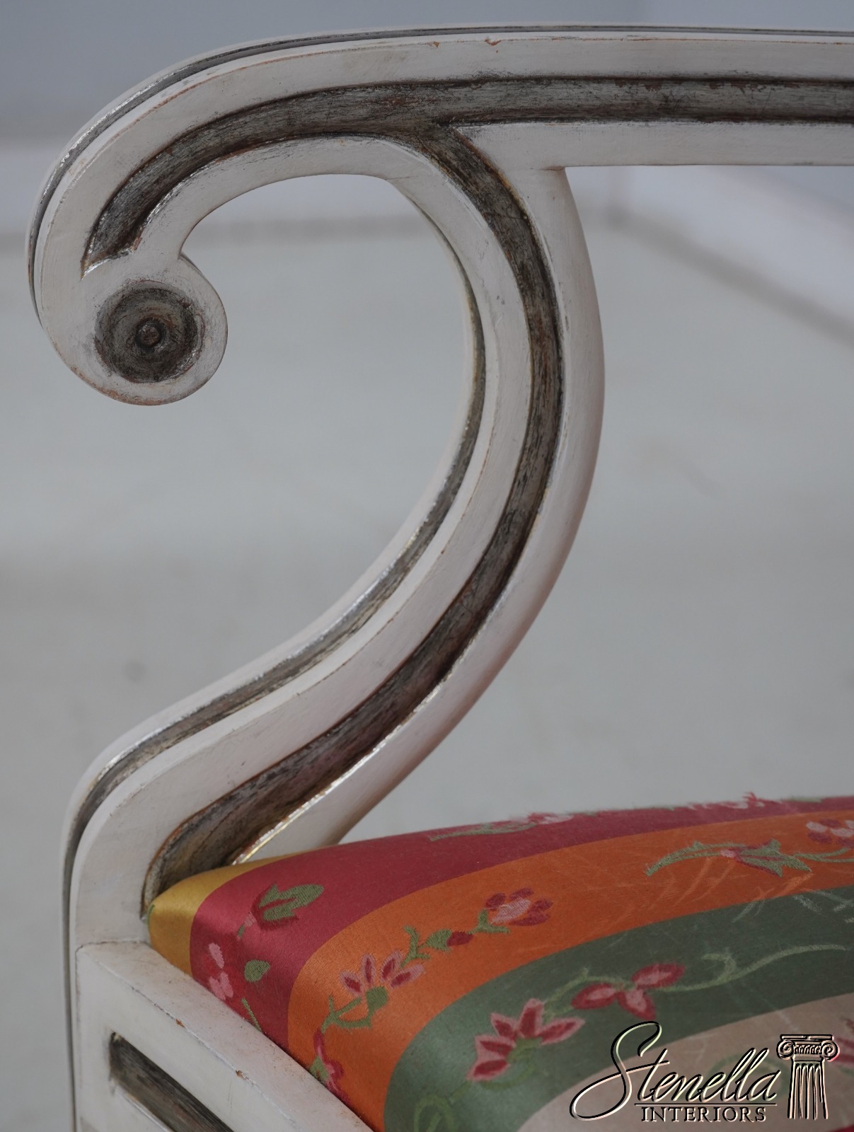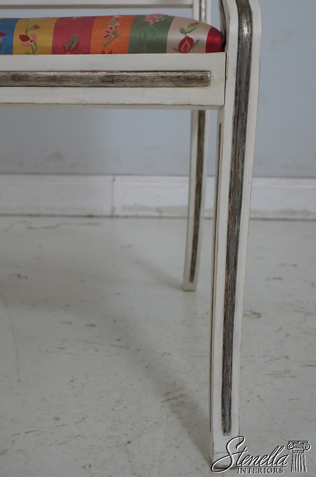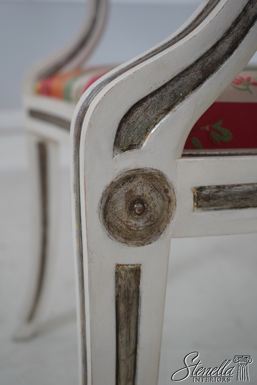 Details: Neoclassical Style Fine Carved Details High Quality Construction Curved Sabre Legs Off White & Silver Paint Scroll Arms & Back Un-Marked As To Manufacture Different Fabric On Arm vs. Side Chairs Offered @ Fraction Original Retail Cost