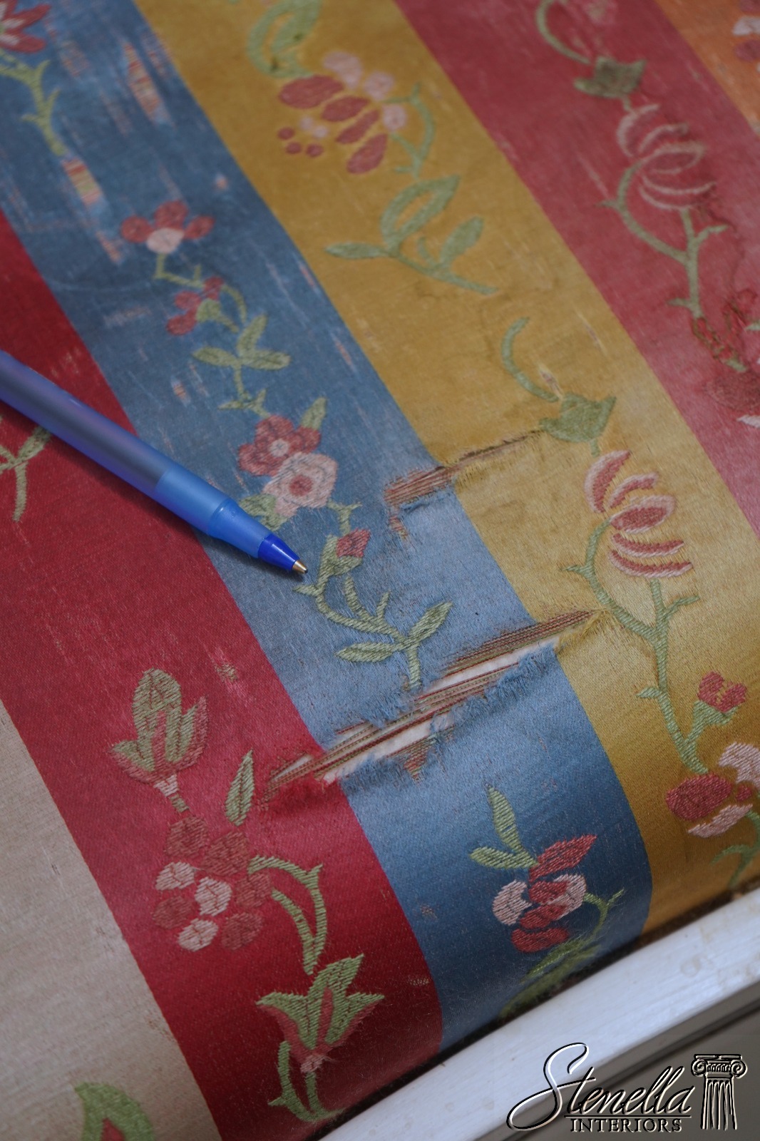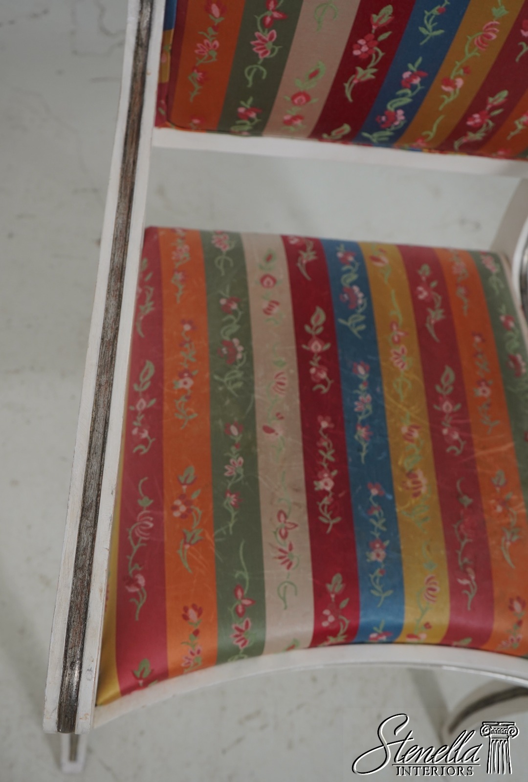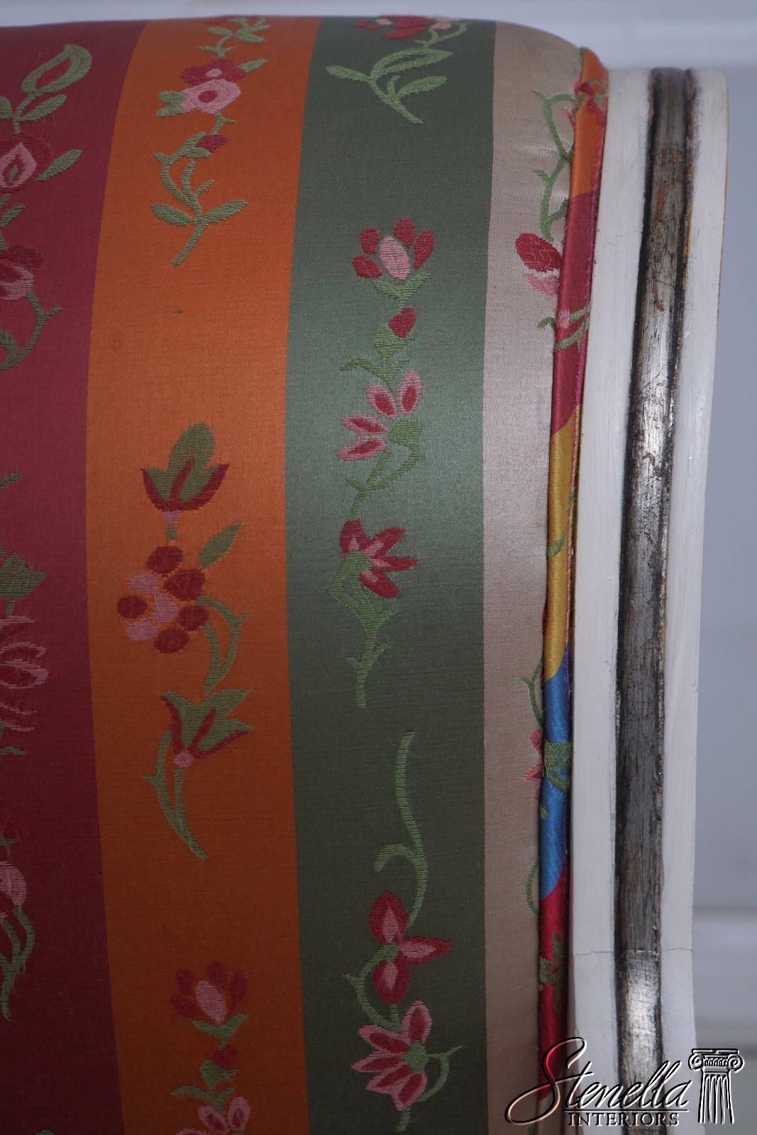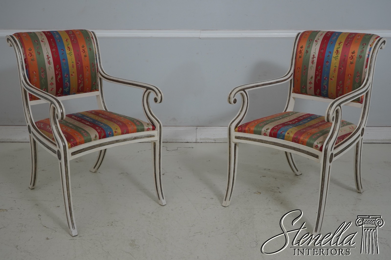 Details: Neoclassical Style Fine Carved Details High Quality Construction Curved Sabre Legs Off White & Silver Paint Scroll Arms & Back Un-Marked As To Manufacture Different Fabric On Arm vs. Side Chairs Offered @ Fraction Original Retail Cost