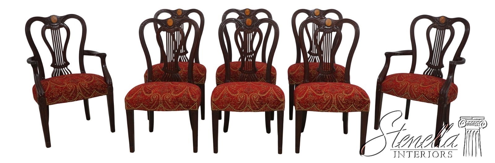 L70399: Set of 8 JOHN WIDDICOMB Mahogany Inlaid Lyre Back Dining Chairs w. New Upholstery