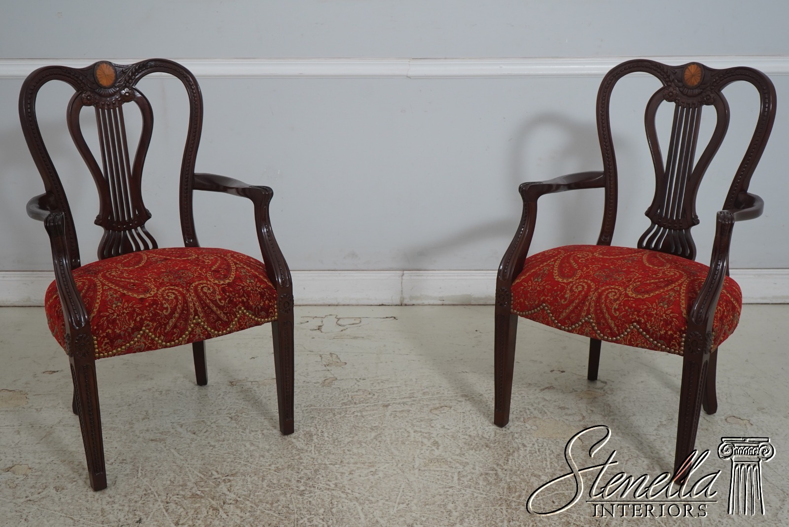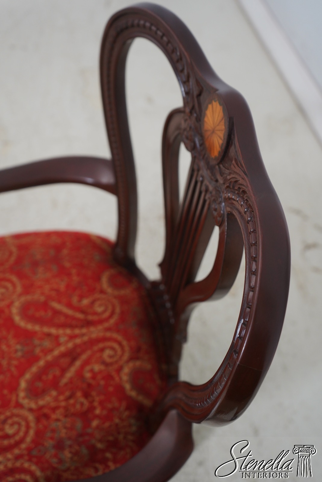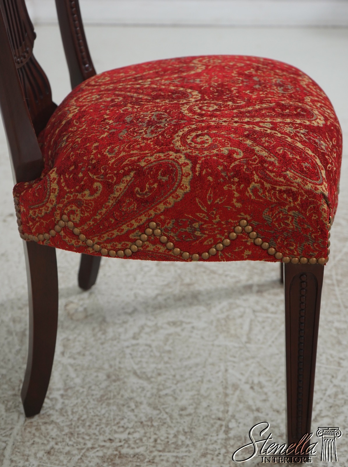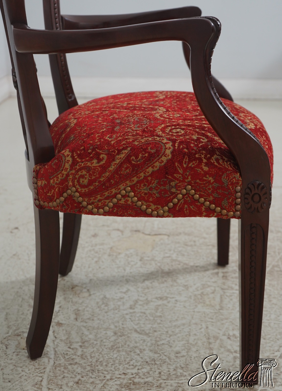 Details: Regency Style Mahogany High Quality Construction Gorgeous Chairs Ready For Your Home Nice Inlay Work Throughout New Upholstery Carved Beads & Rosettes Professionally Reupholstered Seats w. Drape Tack Trimwork Tack Head Trim Knuckle Arms Offered @ Fraction Original Retail Cost