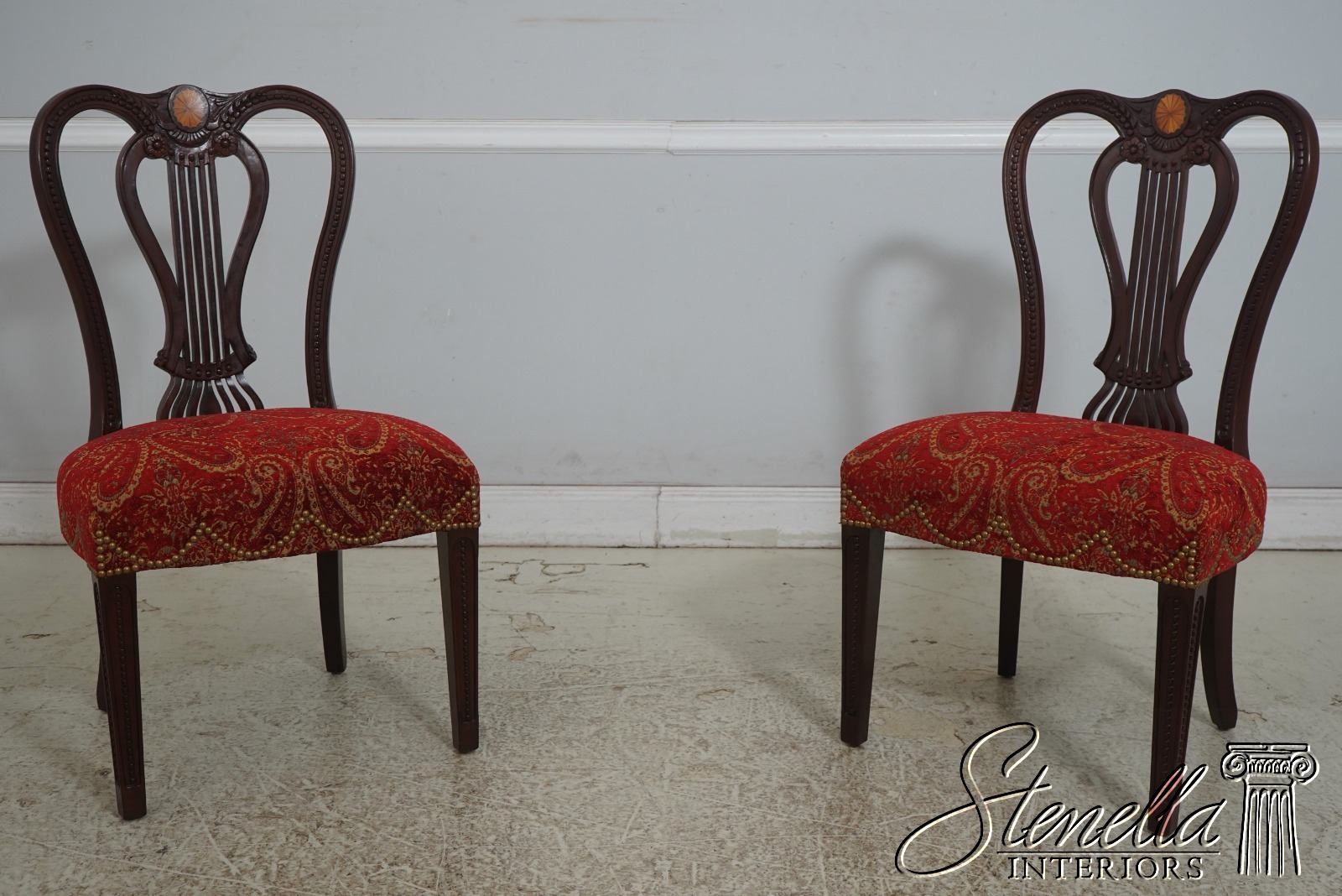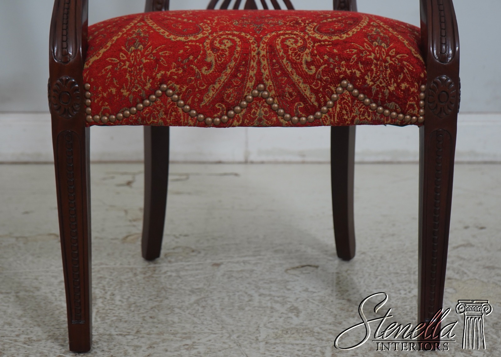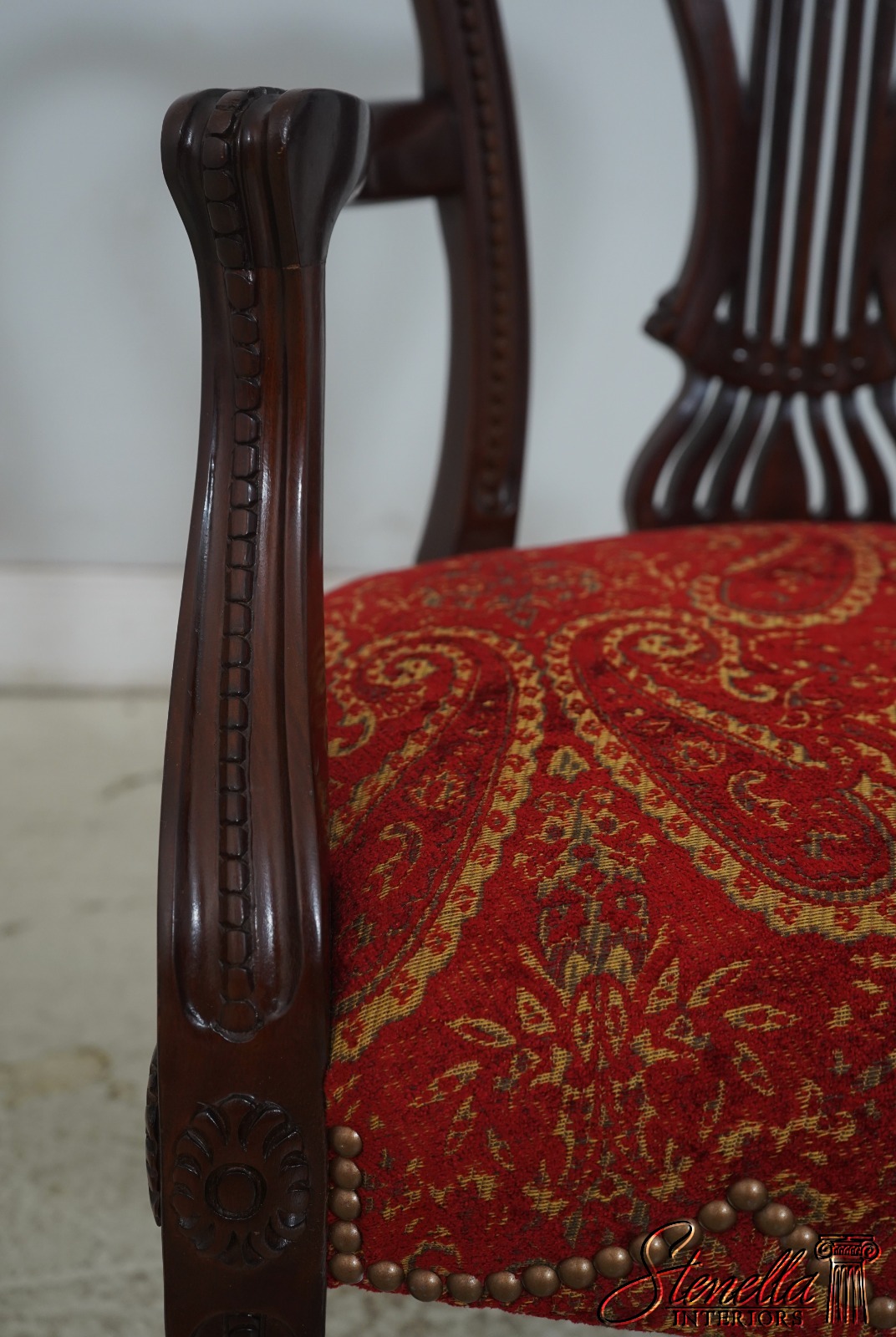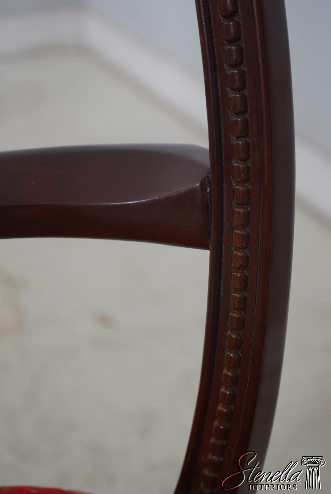 Details: Regency Style Mahogany High Quality Construction Gorgeous Chairs Ready For Your Home Nice Inlay Work Throughout New Upholstery Carved Beads & Rosettes Professionally Reupholstered Seats w. Drape Tack Trimwork Tack Head Trim Knuckle Arms Offered @ Fraction Original Retail Cost