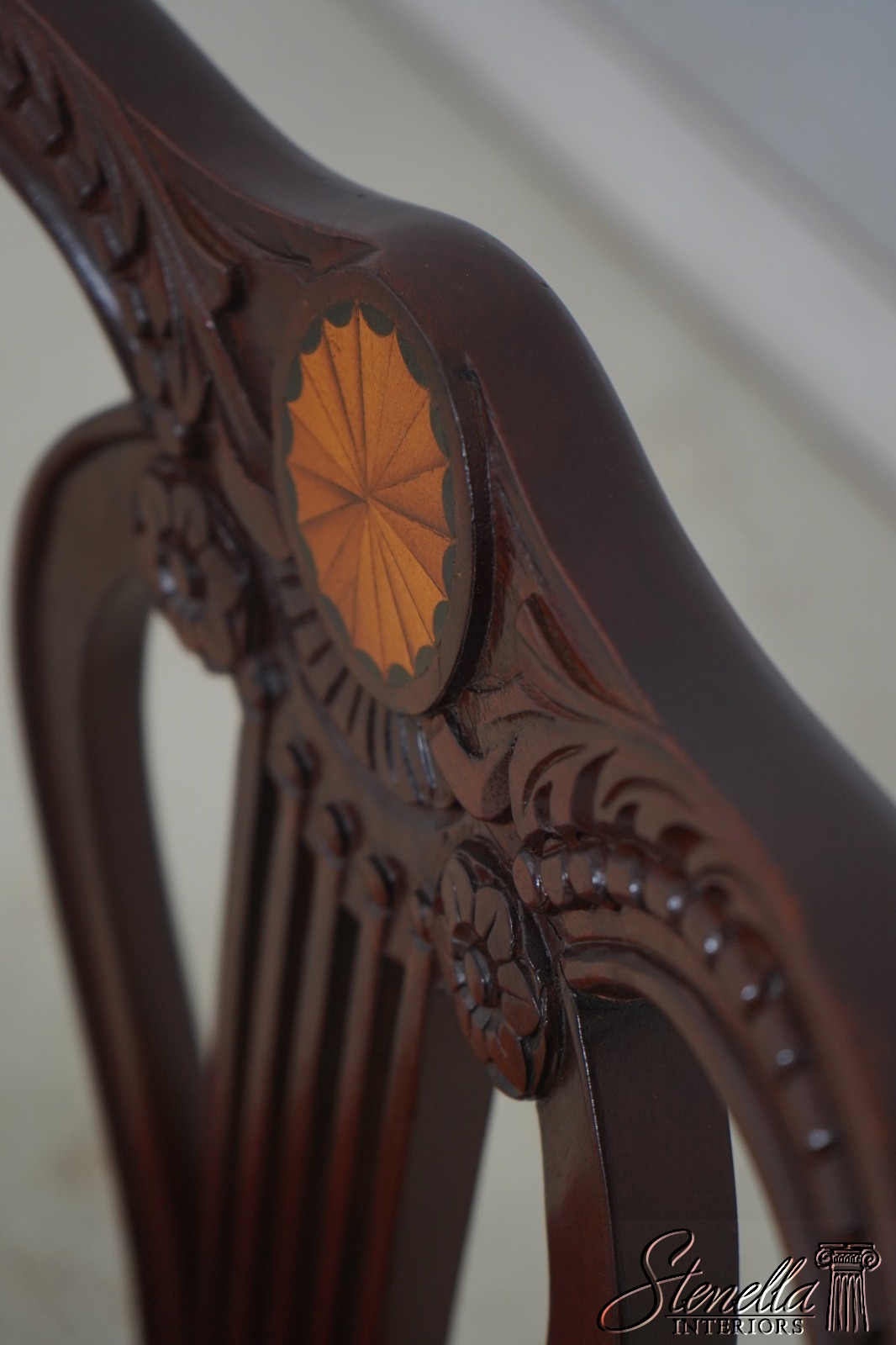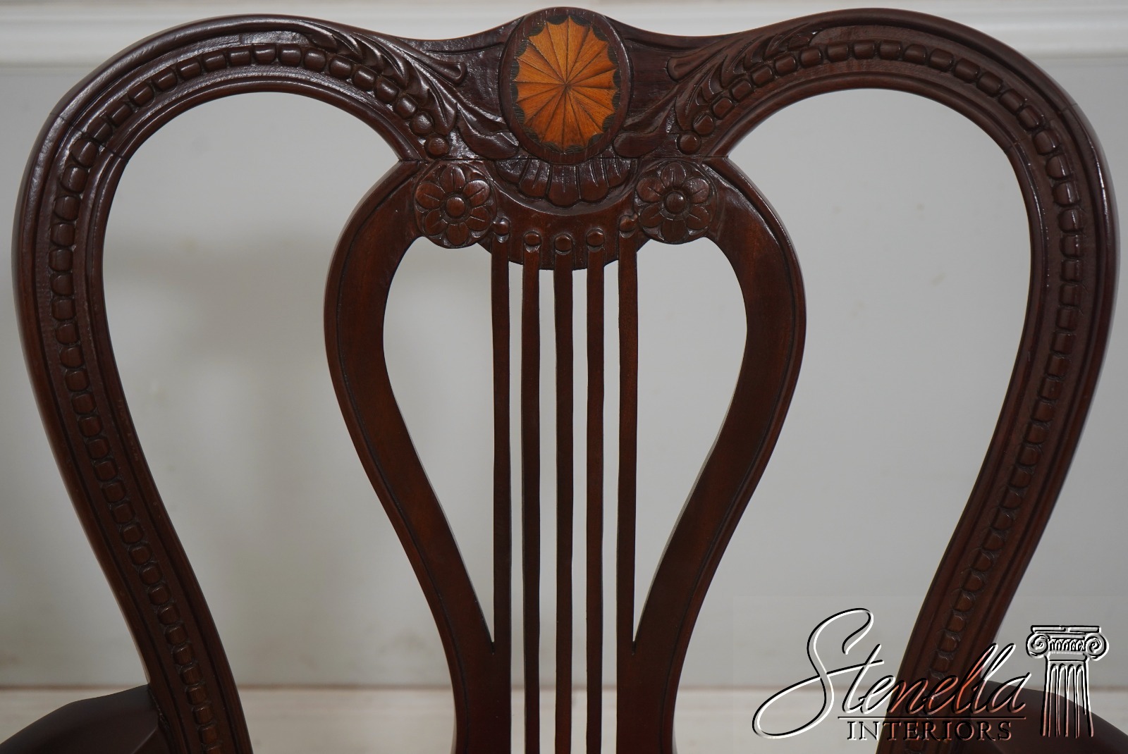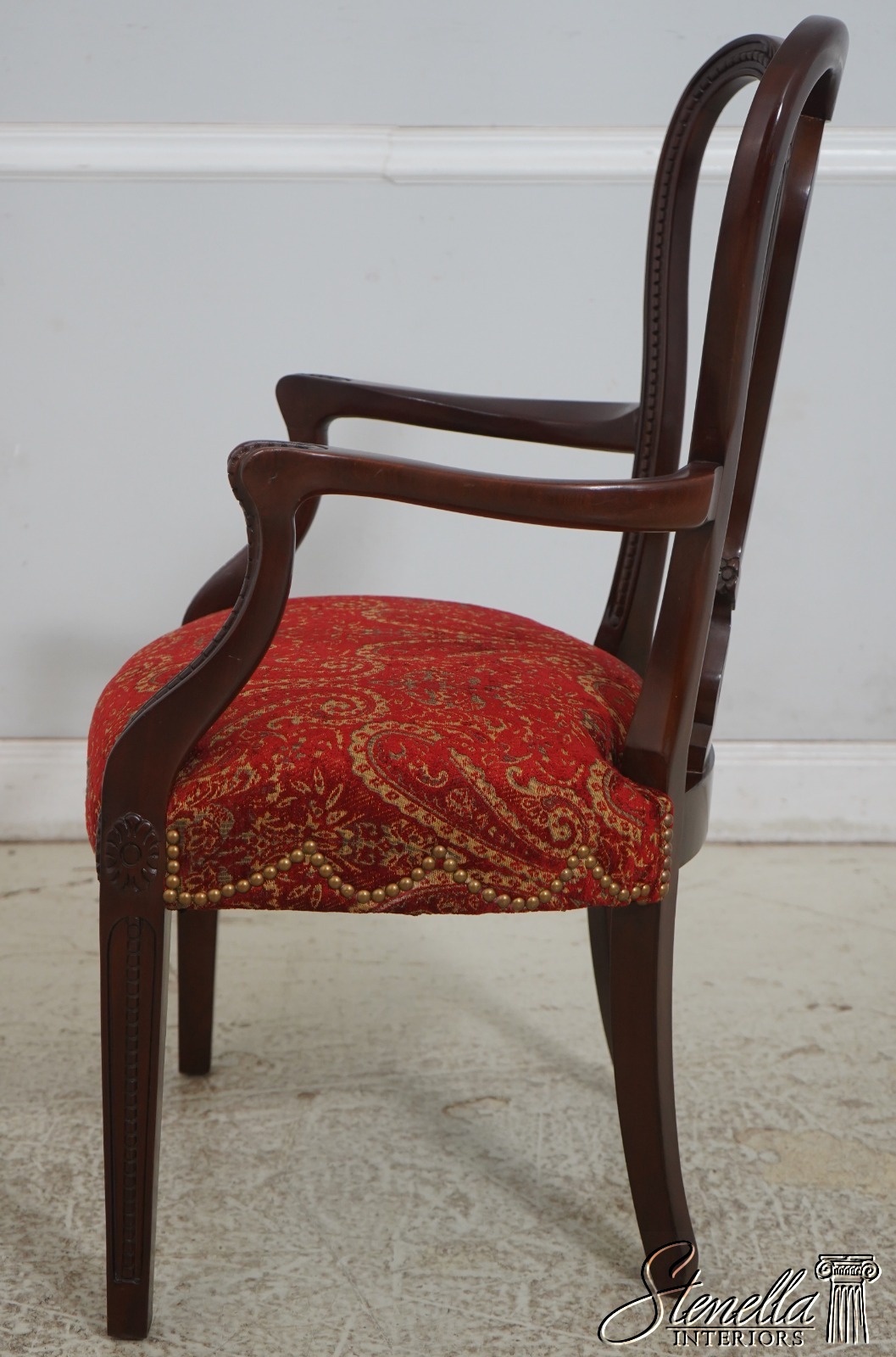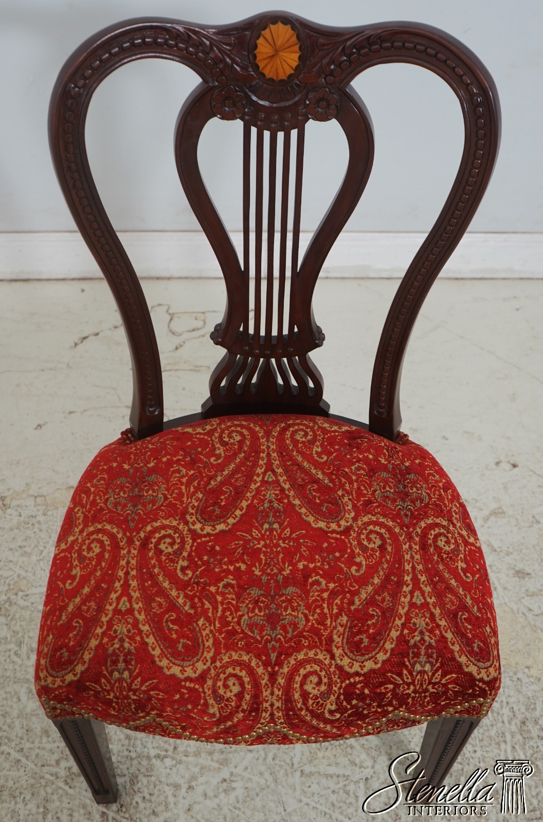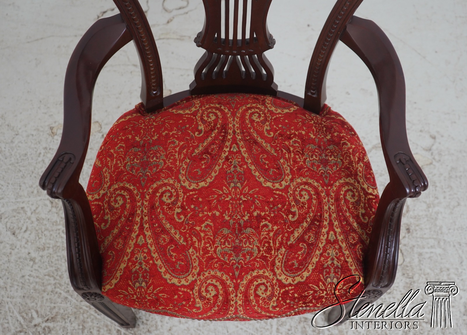 Details: Regency Style Mahogany High Quality Construction Gorgeous Chairs Ready For Your Home Nice Inlay Work Throughout New Upholstery Carved Beads & Rosettes Professionally Reupholstered Seats w. Drape Tack Trimwork Tack Head Trim Knuckle Arms Offered @ Fraction Original Retail Cost