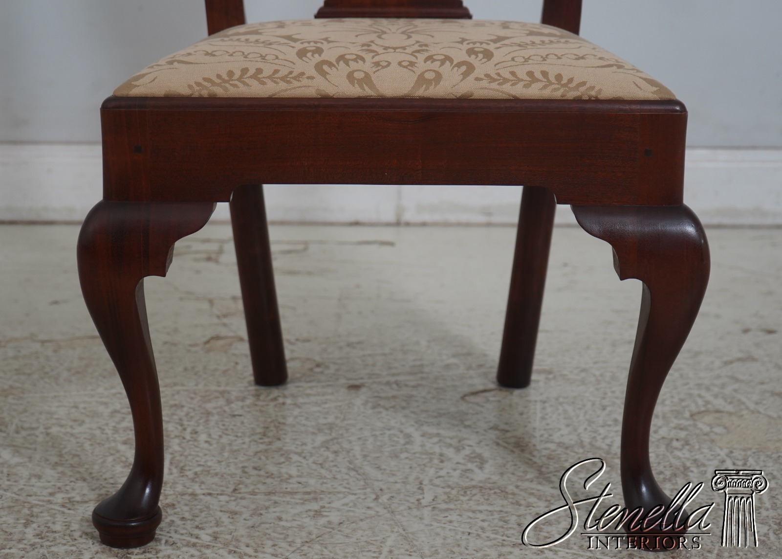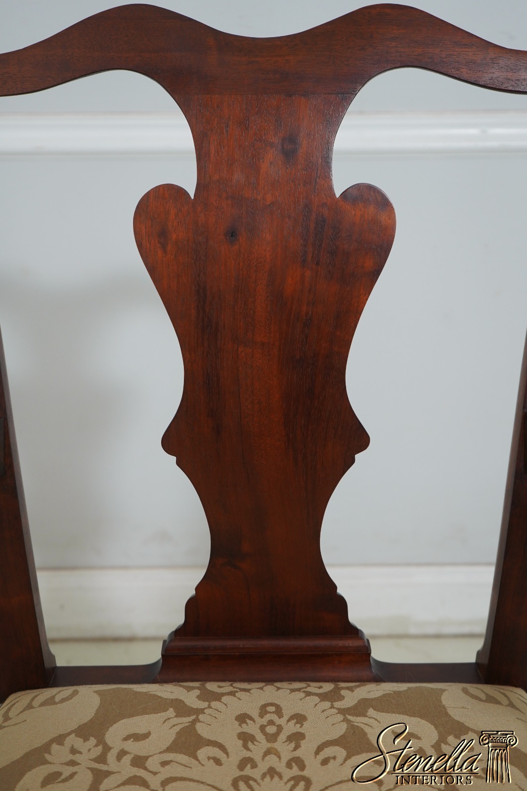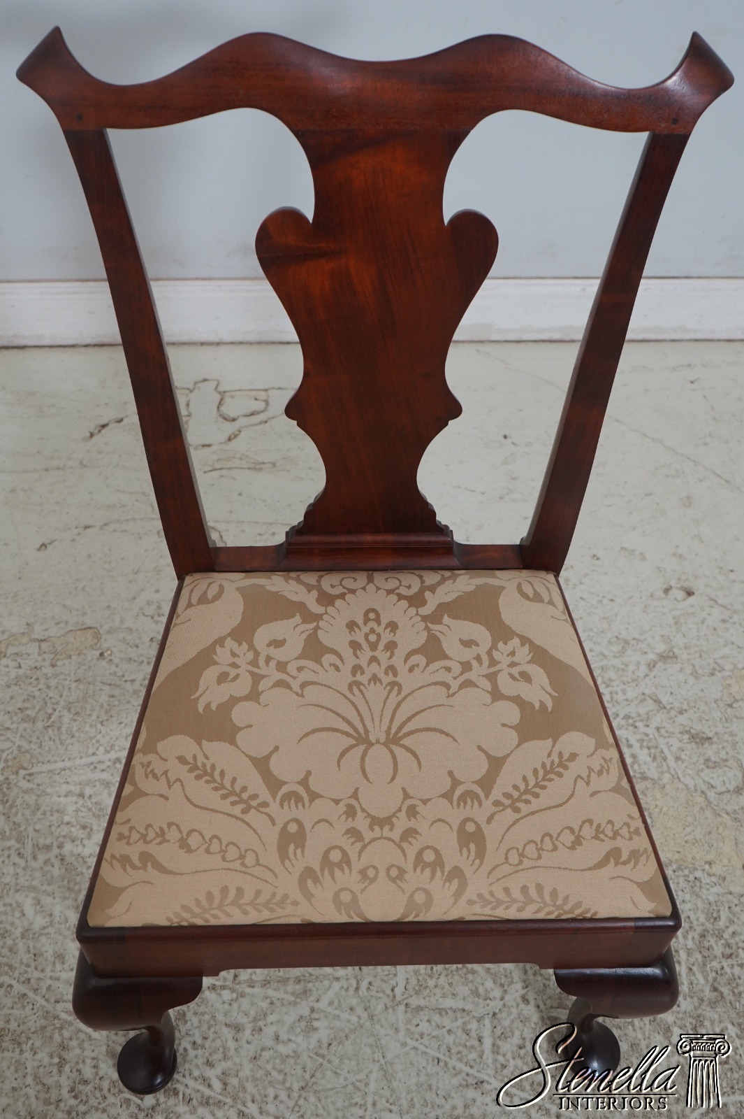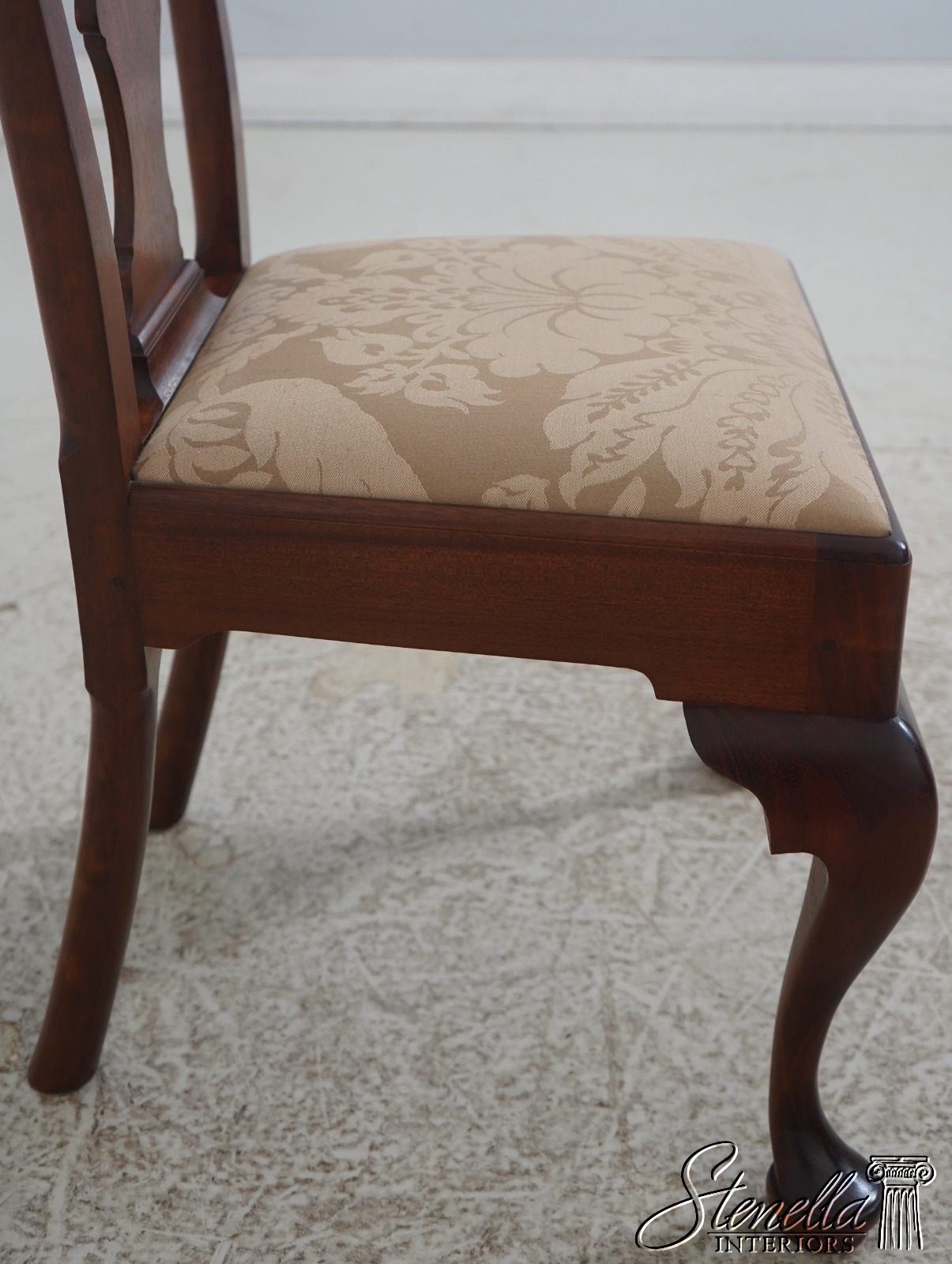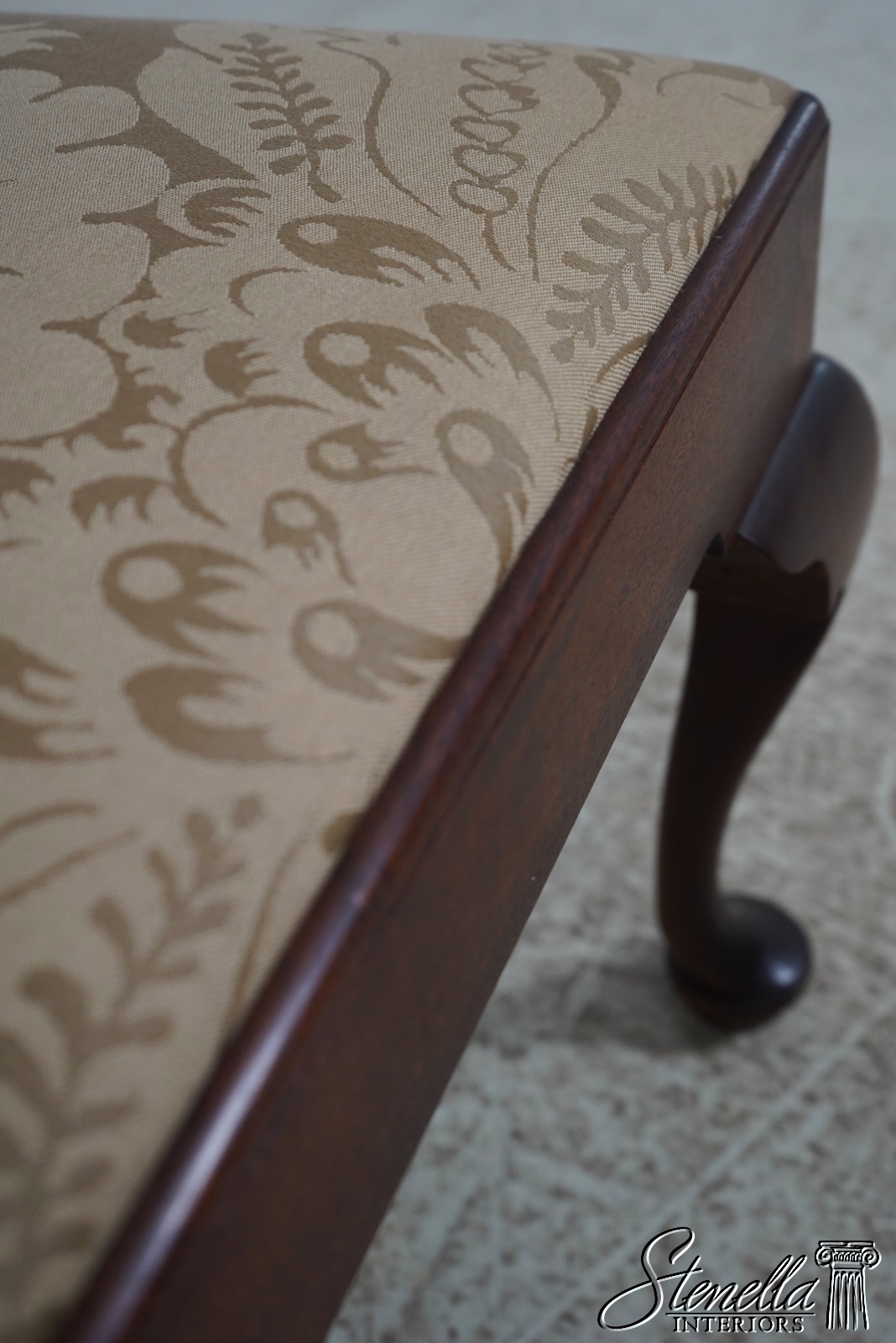 Details: Solid Mahogany Damask Upholstered Slip Seats High Quality Construction Queen Anne Legs & Pad Feet 18 C. Design Chippendale Style Traditional Style Bench Made Hand Crafted Chairs Pennsylvania Craftsman Clean Well Cared For Chairs