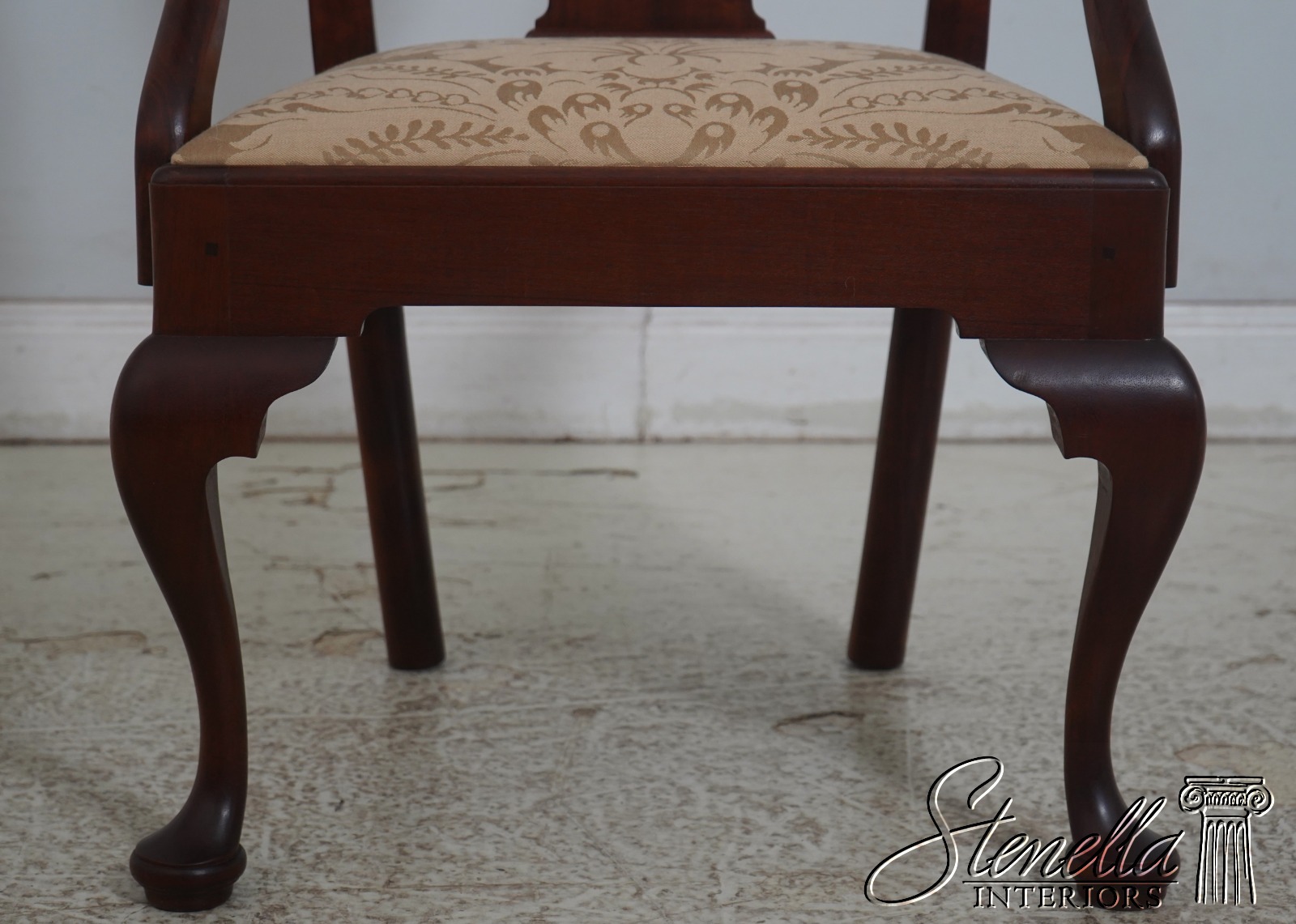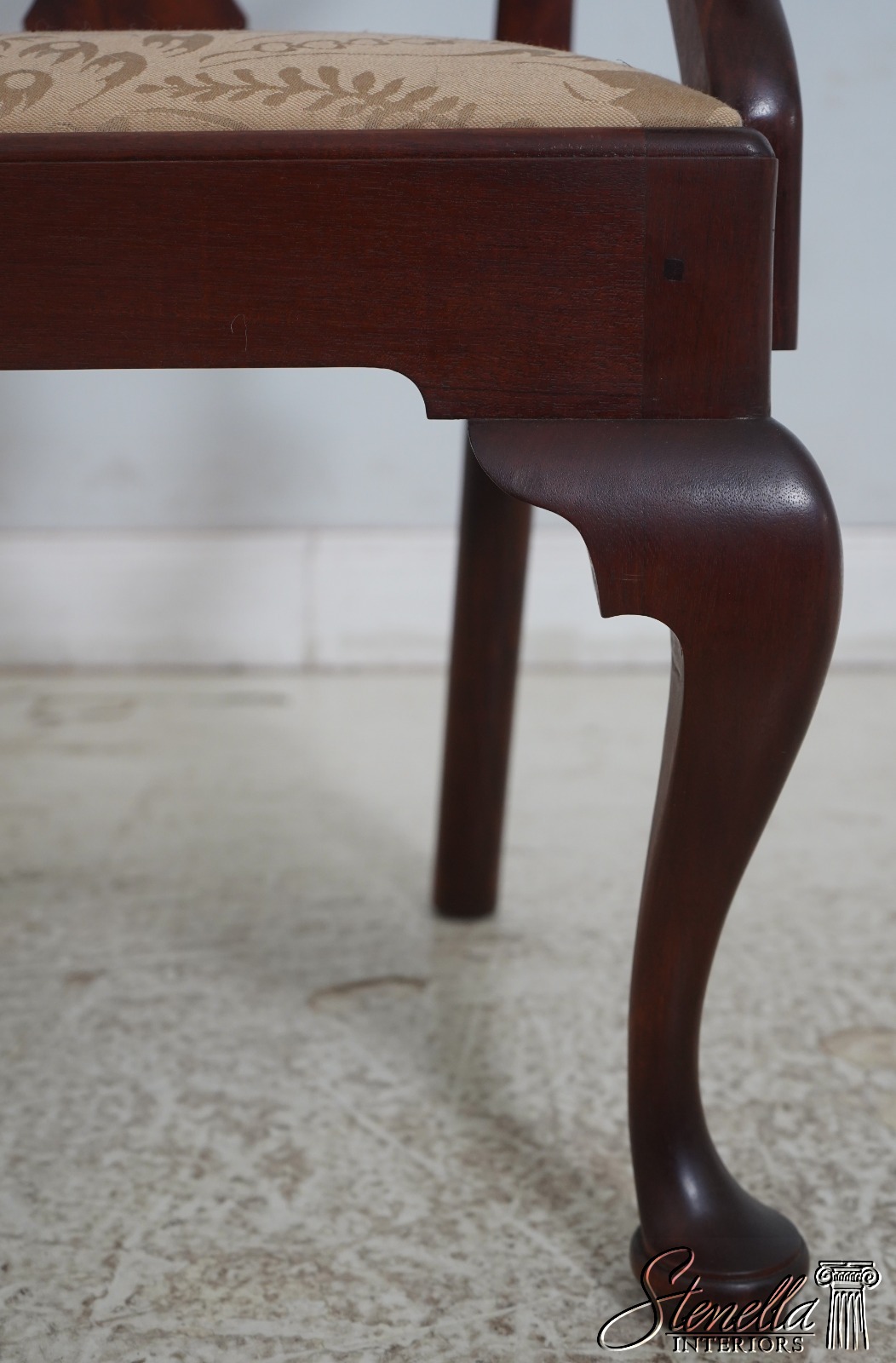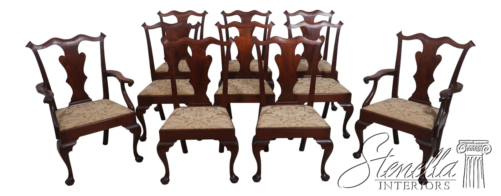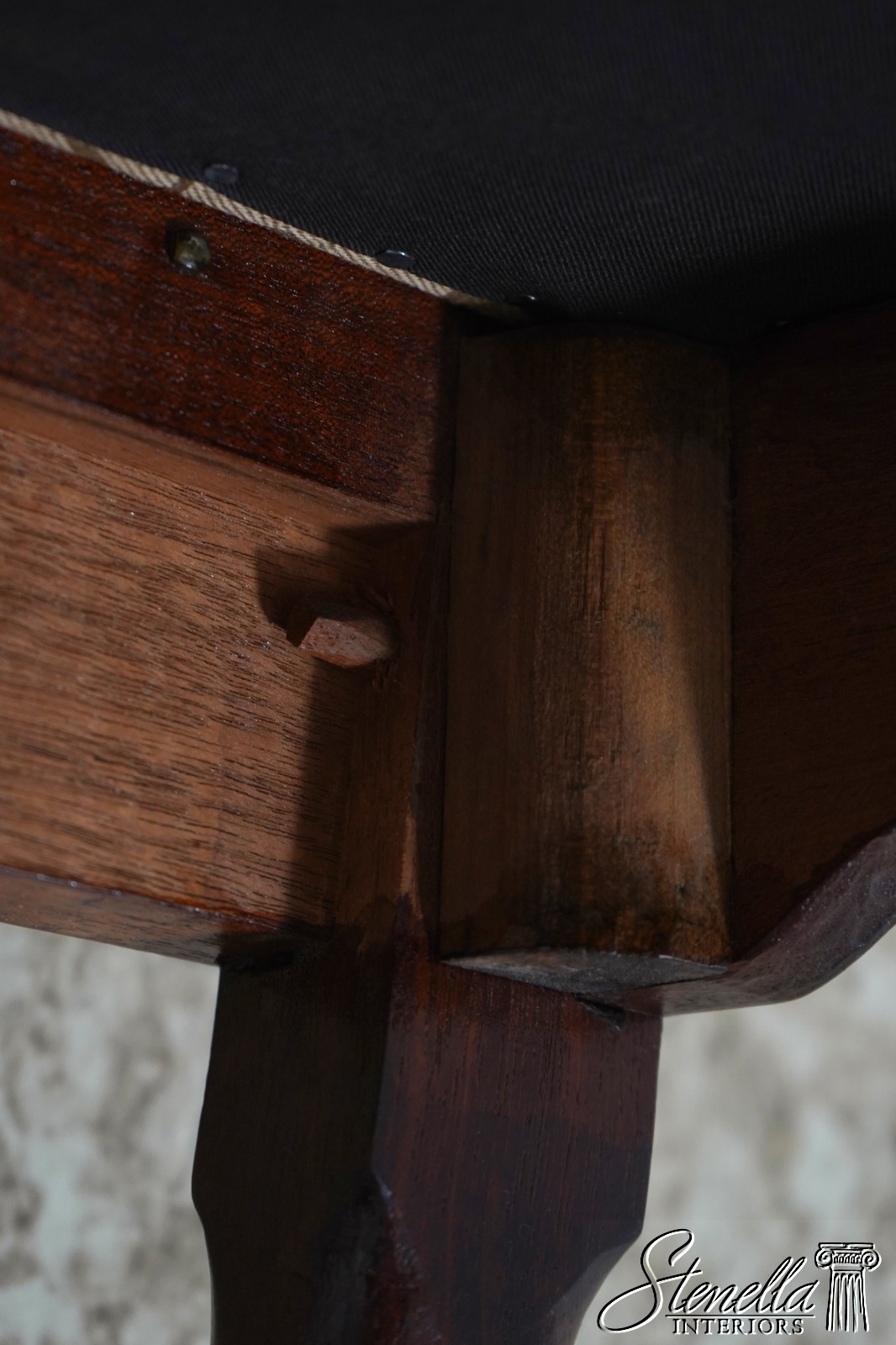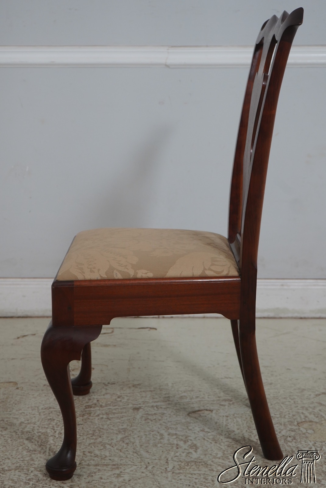 Details: Solid Mahogany Damask Upholstered Slip Seats High Quality Construction Queen Anne Legs & Pad Feet 18 C. Design Chippendale Style Traditional Style Bench Made Hand Crafted Chairs Pennsylvania Craftsman Clean Well Cared For Chairs