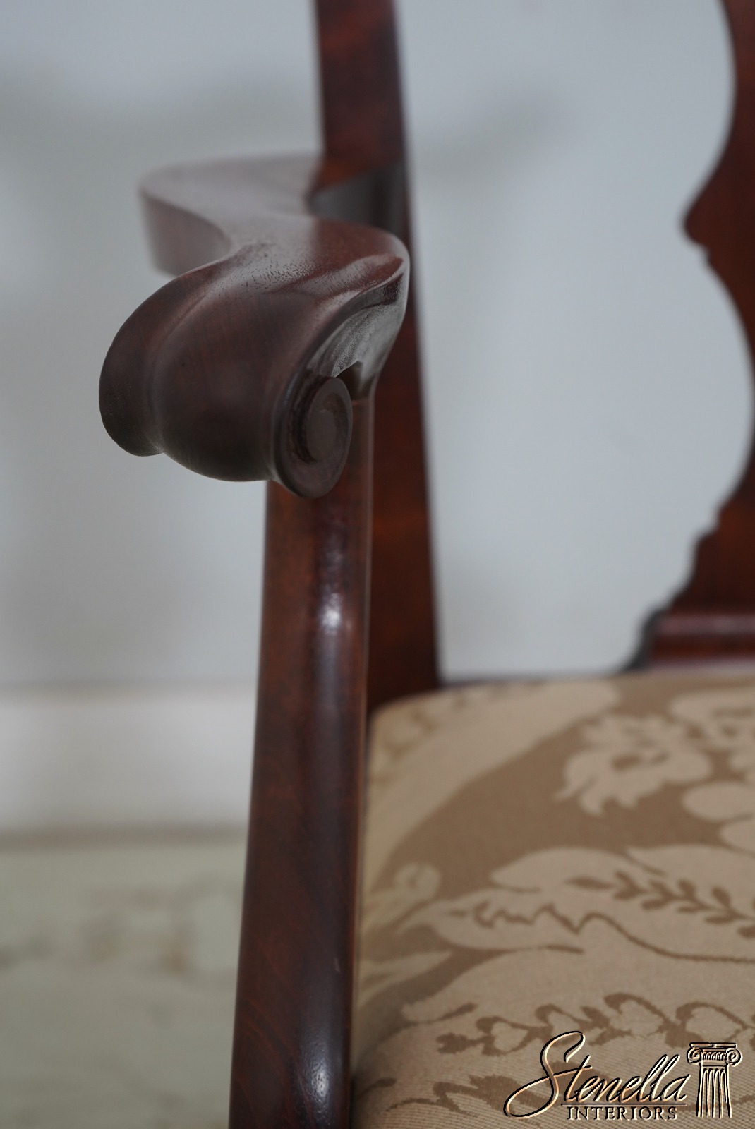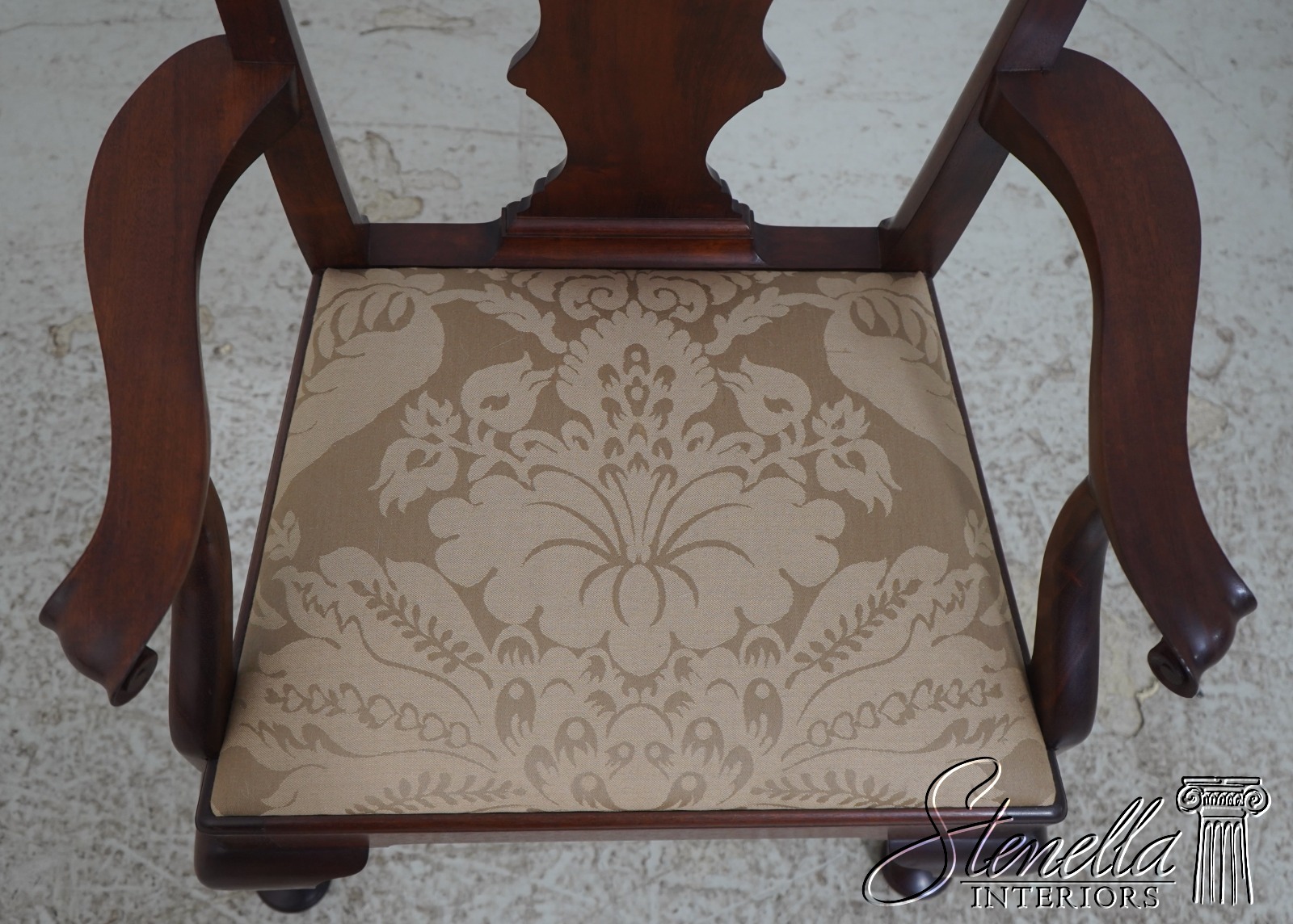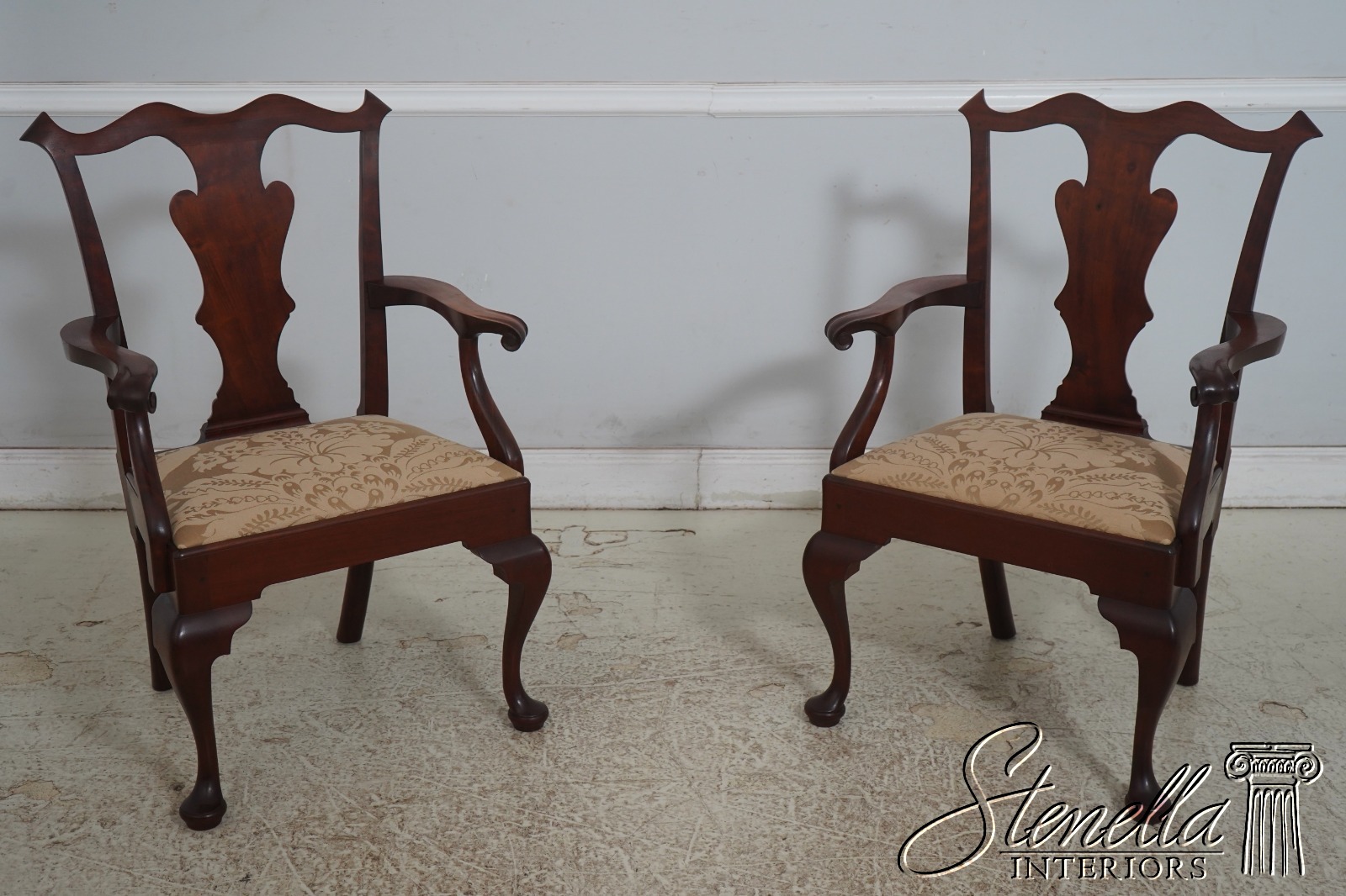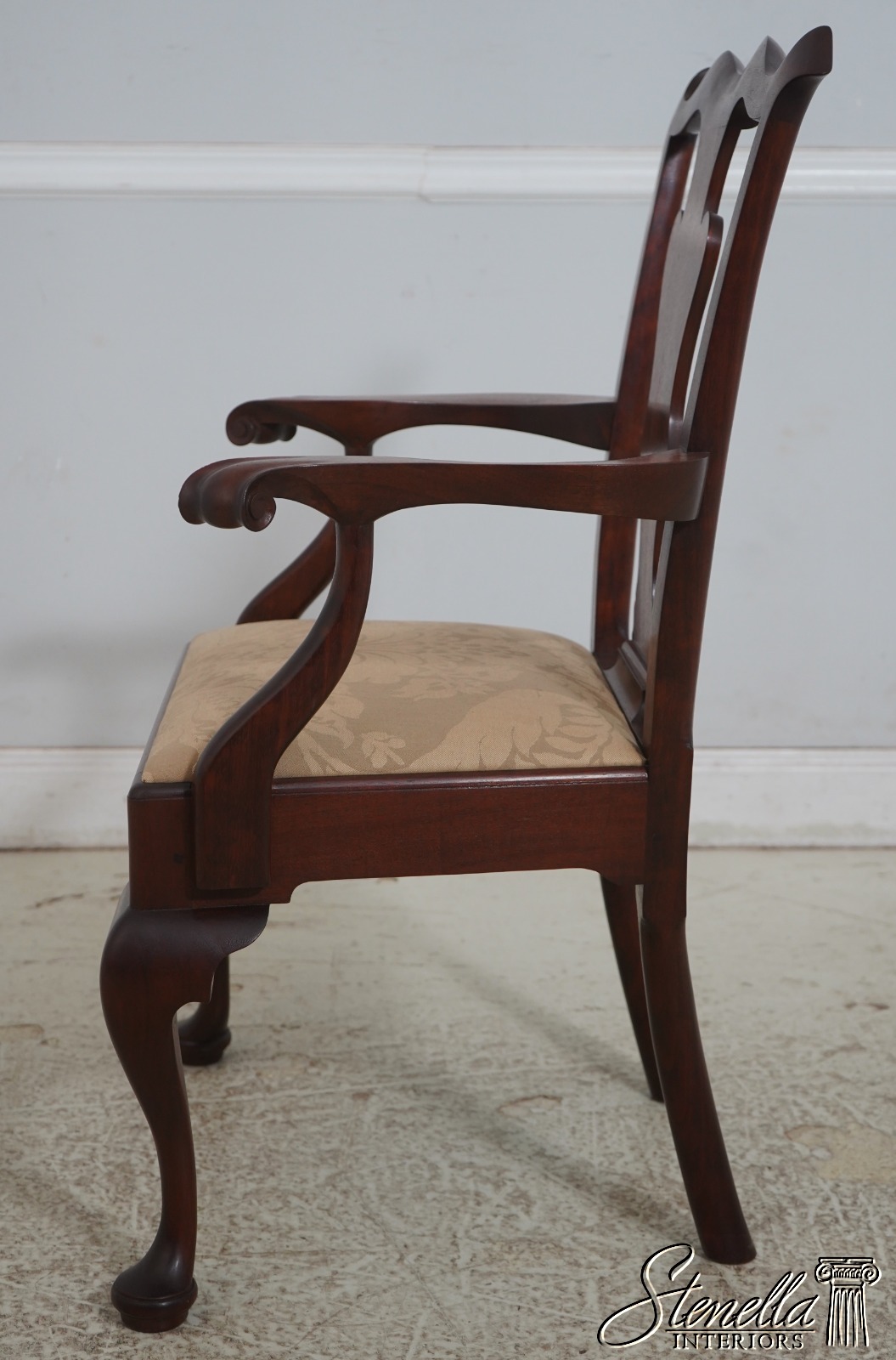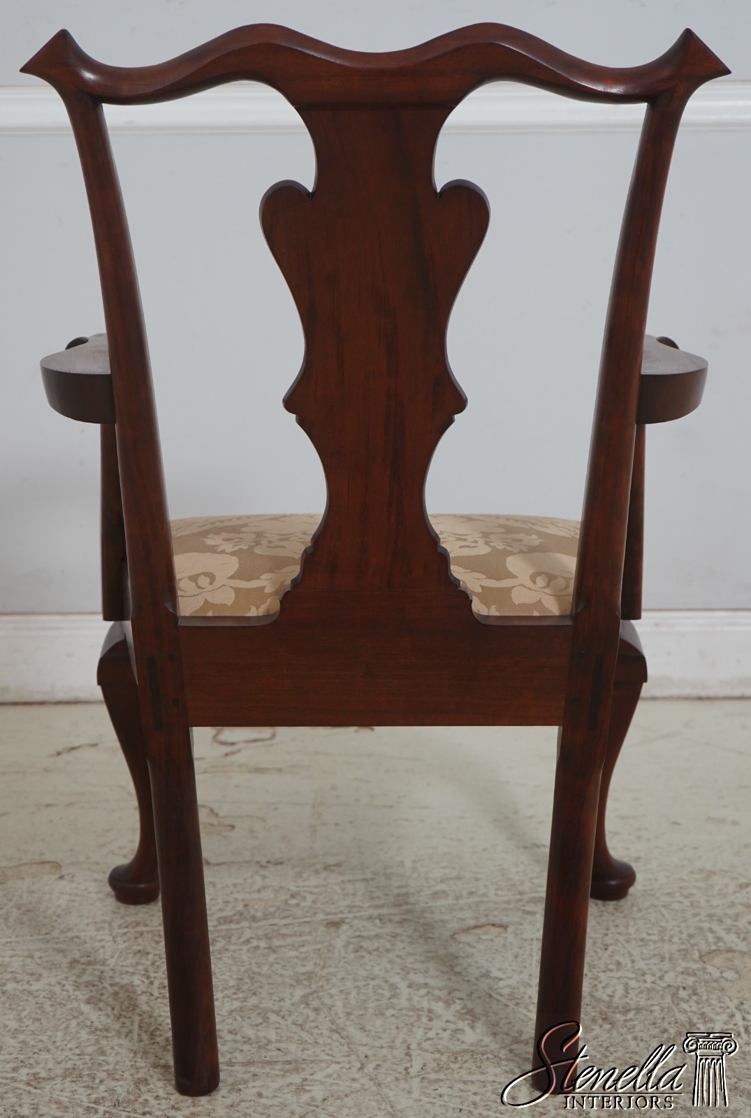 Details: Solid Mahogany Damask Upholstered Slip Seats High Quality Construction Queen Anne Legs & Pad Feet 18 C. Design Chippendale Style Traditional Style Bench Made Hand Crafted Chairs Pennsylvania Craftsman Clean Well Cared For Chairs