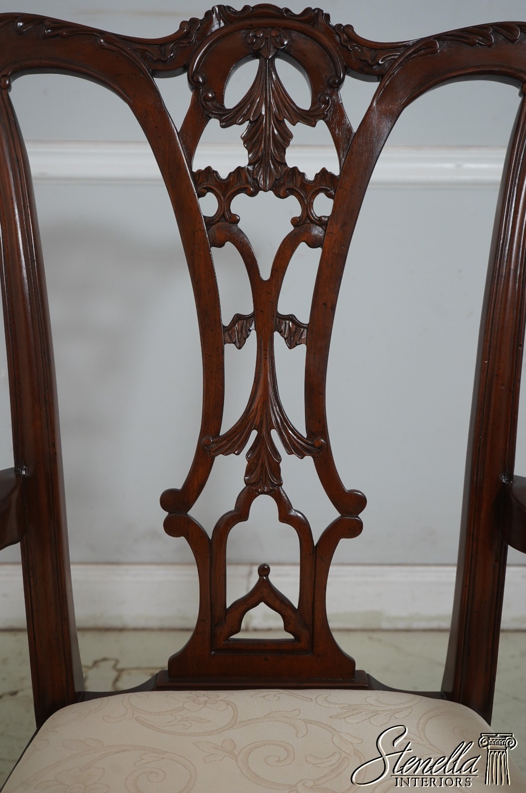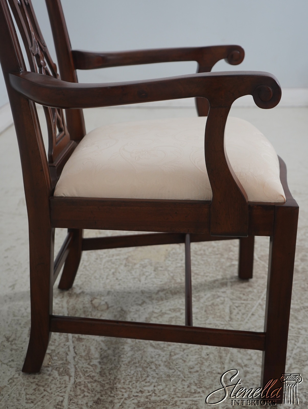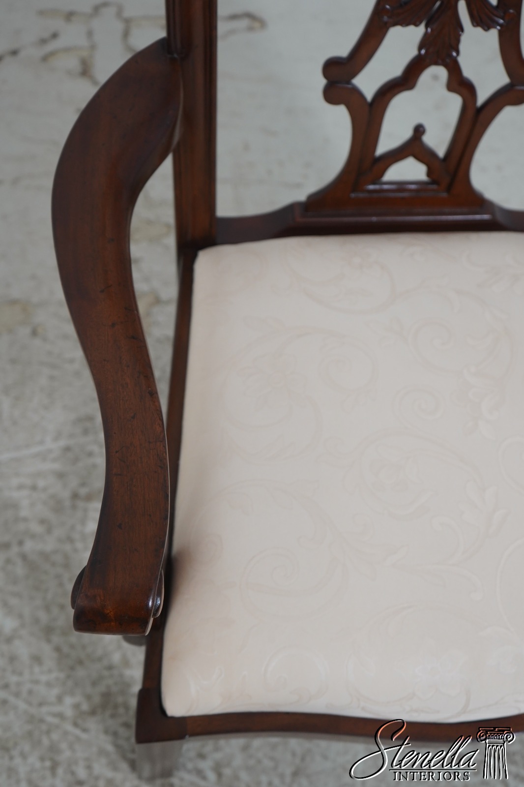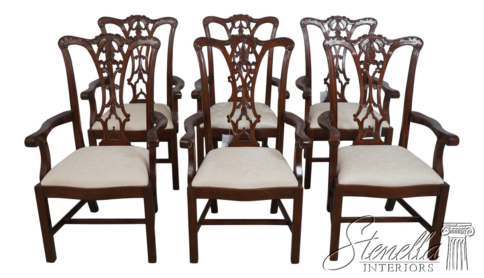 Details: Fine Carved Details High Quality Construction Set of 6 Armchairs 18 C. Design Chippendale Style New Floor Models Never Actually Used Traditional Style Stretcher Base Frame One Seat Covered In Different Upholstery Offered @ Fraction Original Retail Cost
