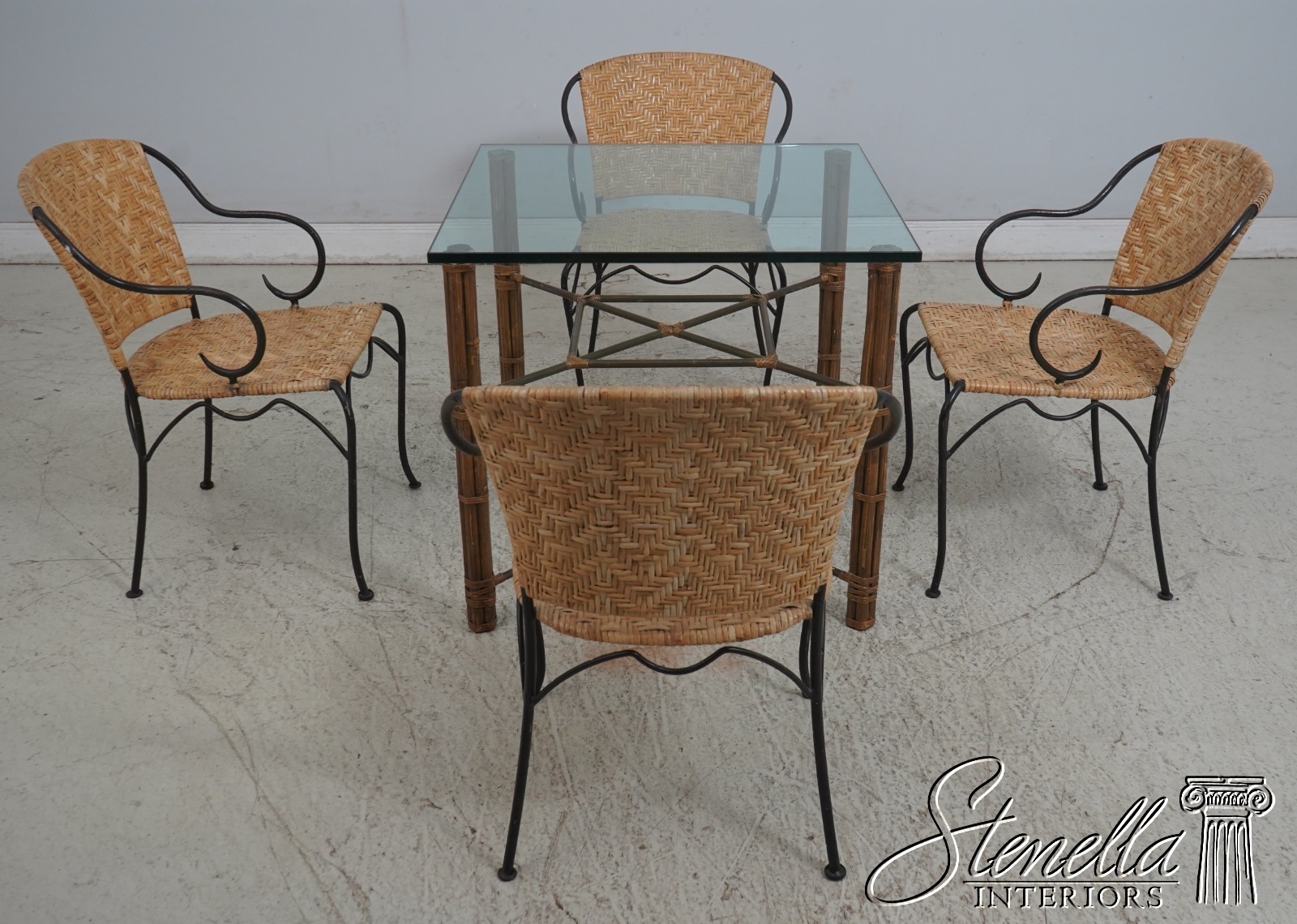 LF70031: Glass Top Bamboo Table + 4 Iron Wicker Chairs