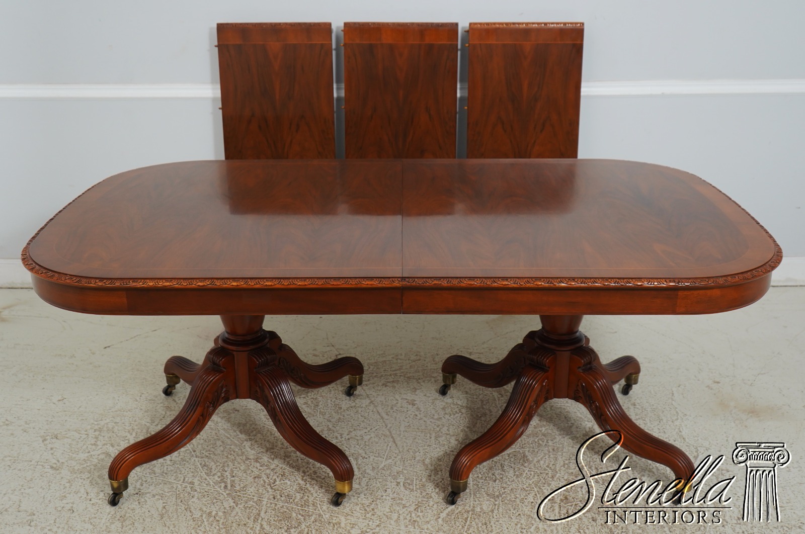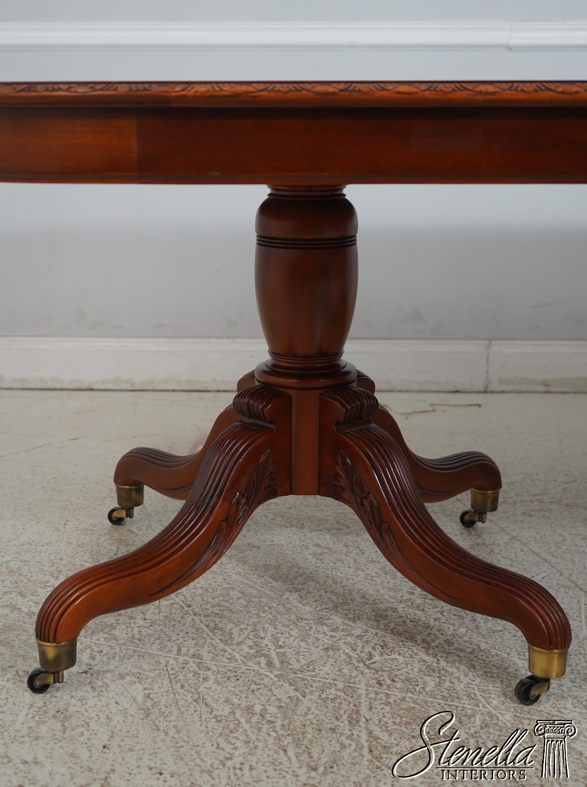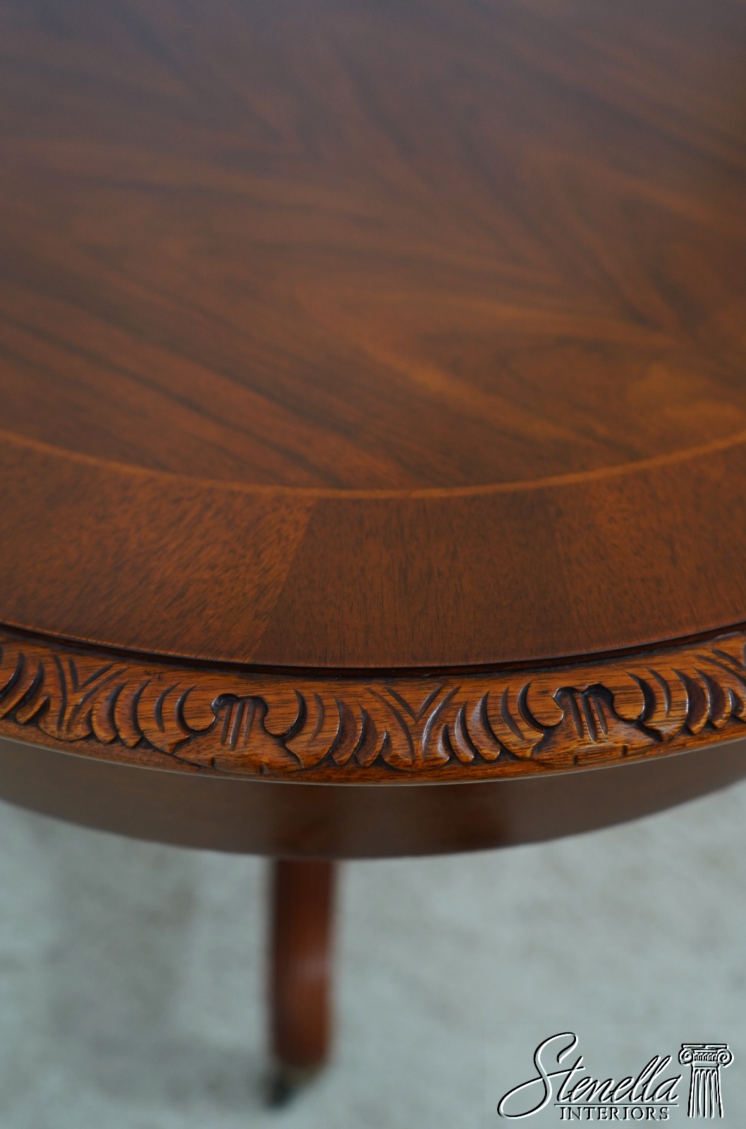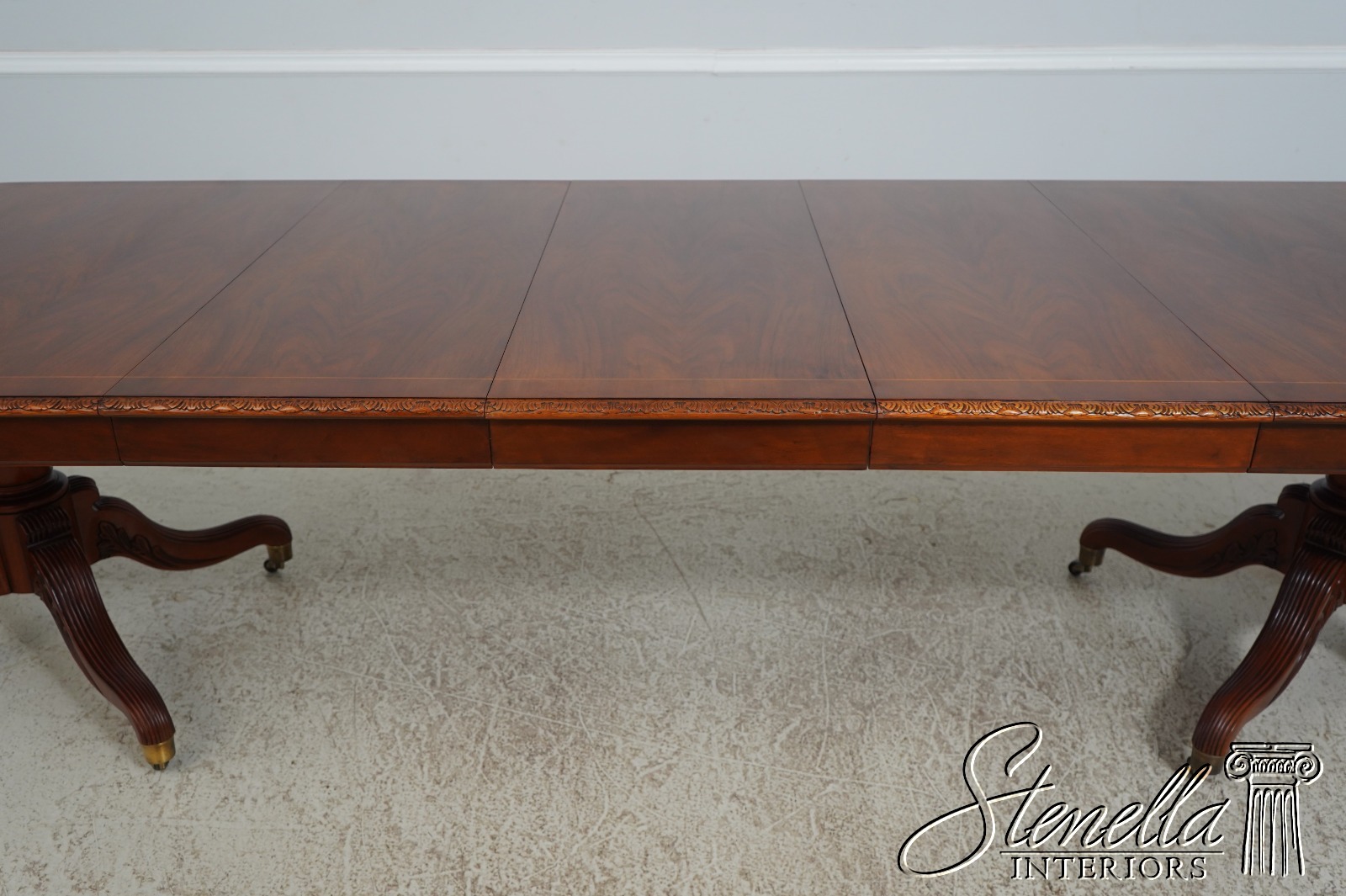 Details: Walnut Brass Capped Feet Fine Carved Details High Quality Construction Nicely Carved Edge Rich High Sheen Finish Nice Inlay Work Throughout Regency Style Brass Casters Double Pedestals Stunning Figural Walnut Top Offered @ Fraction Original Retail Cost
