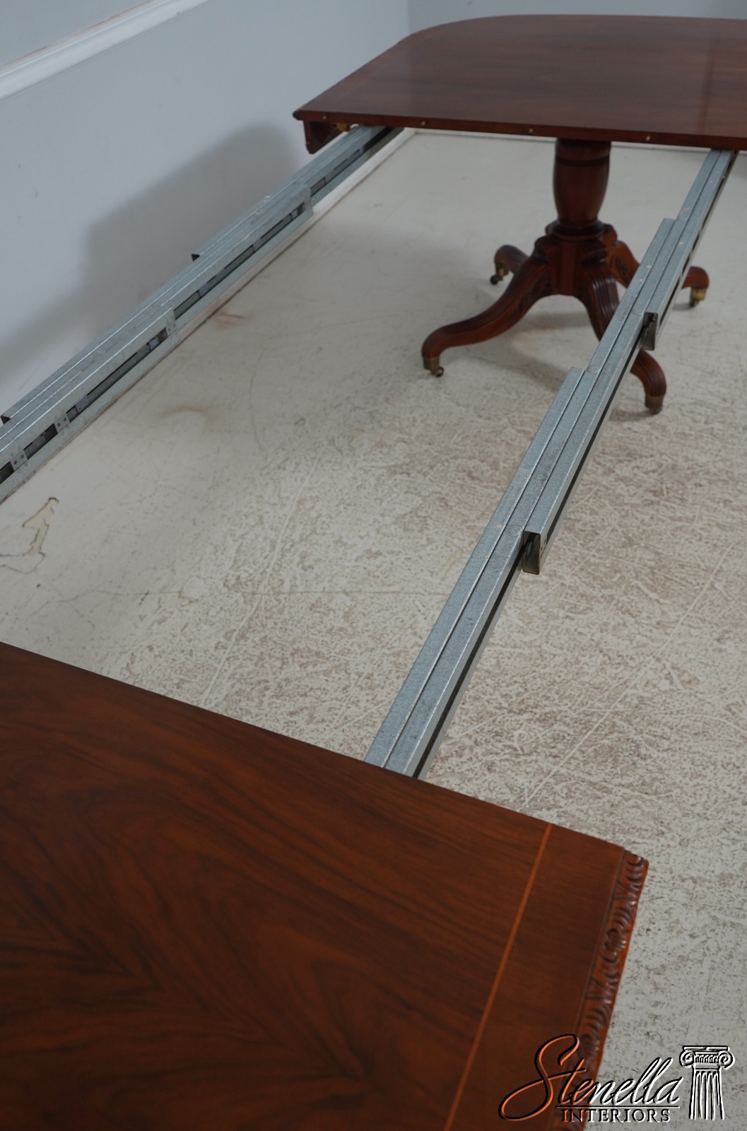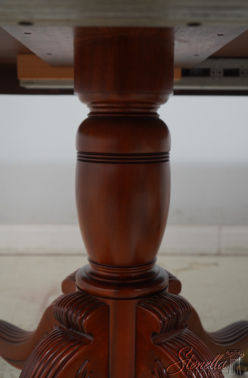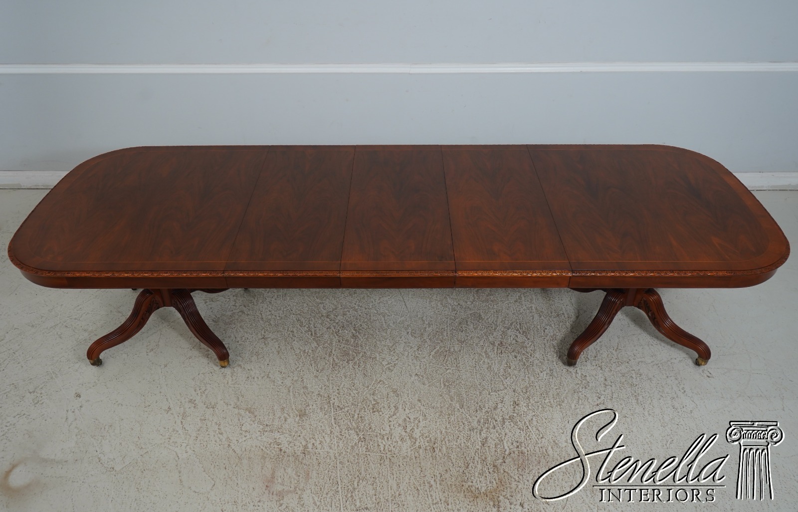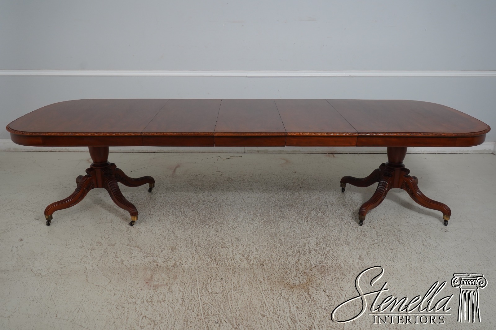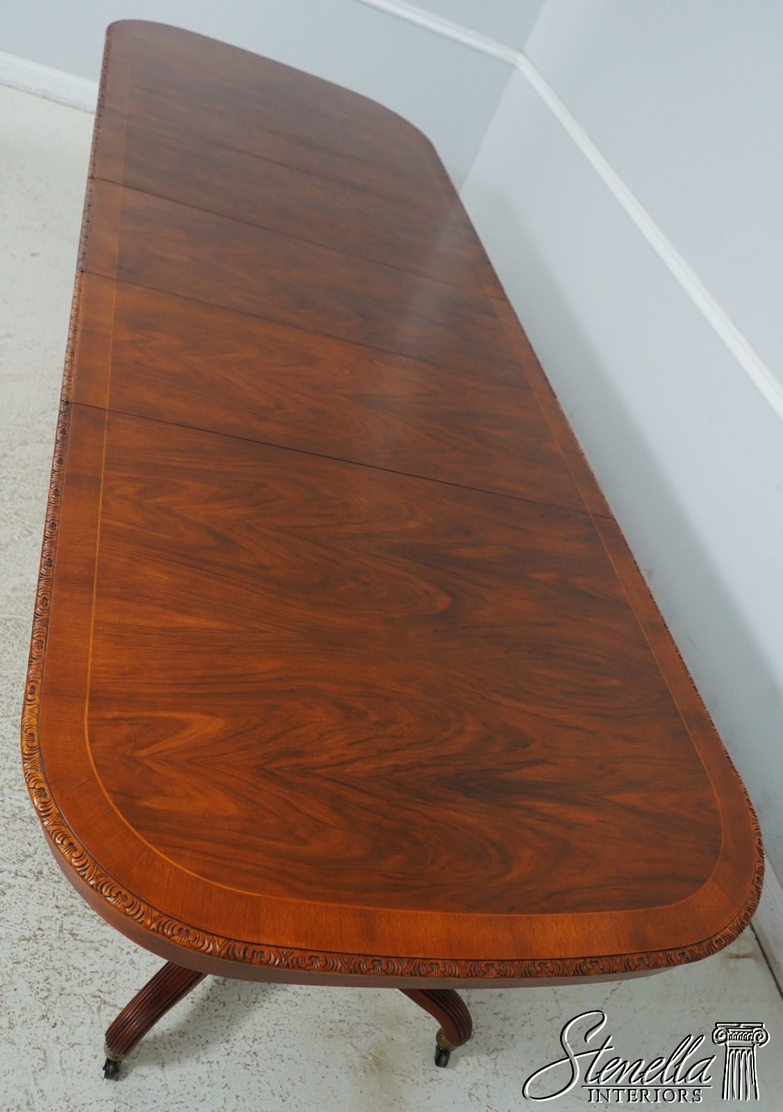 Details: Walnut Brass Capped Feet Fine Carved Details High Quality Construction Nicely Carved Edge Rich High Sheen Finish Nice Inlay Work Throughout Regency Style Brass Casters Double Pedestals Stunning Figural Walnut Top Offered @ Fraction Original Retail Cost