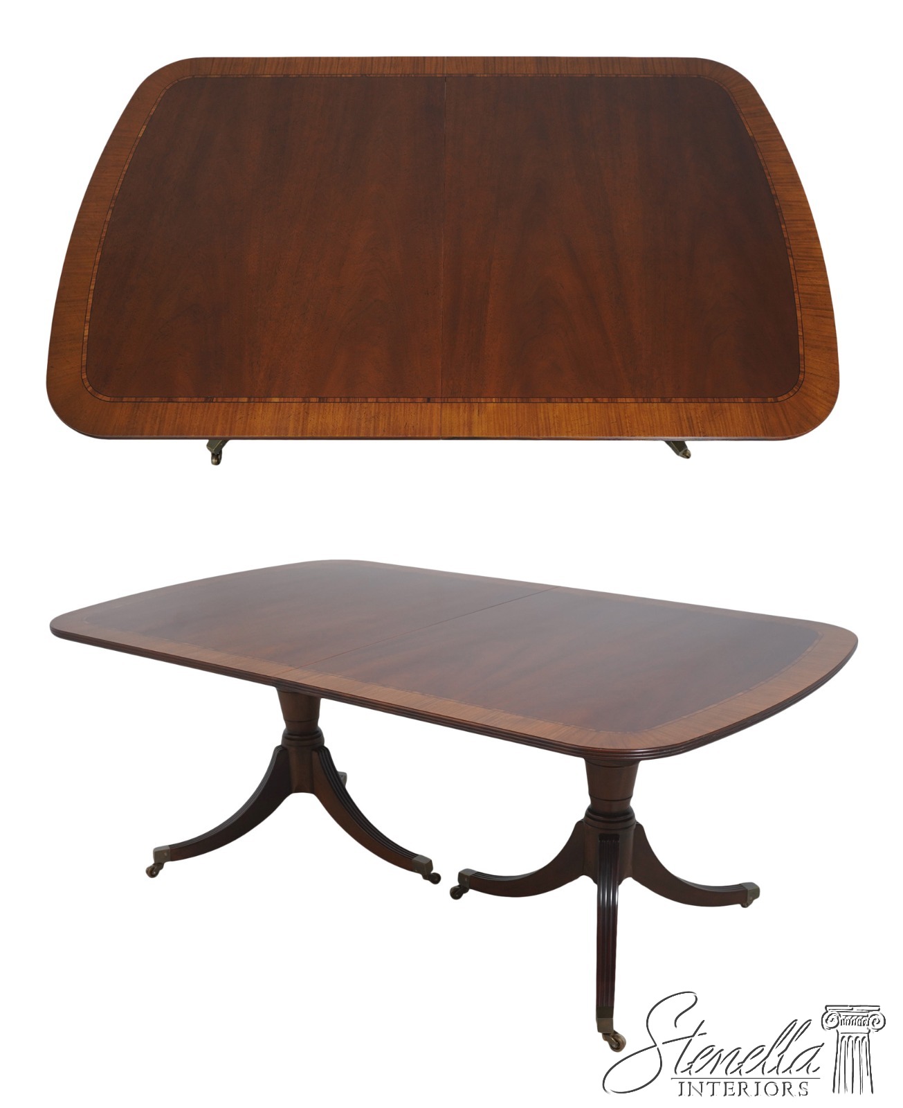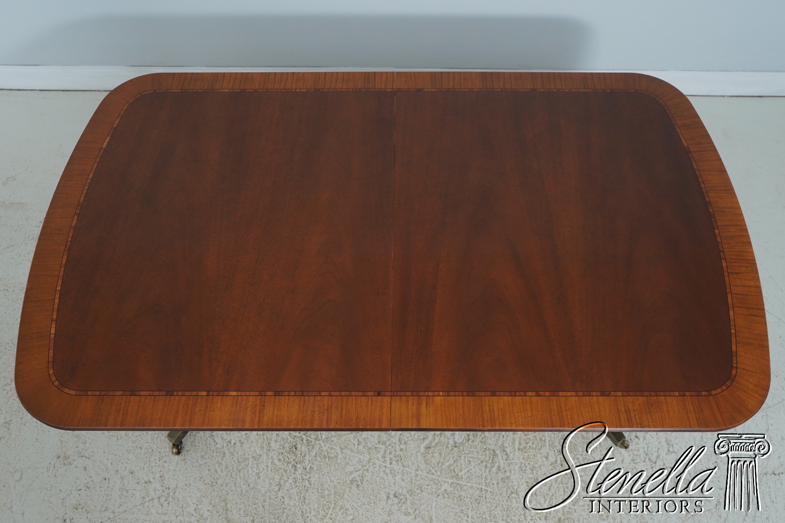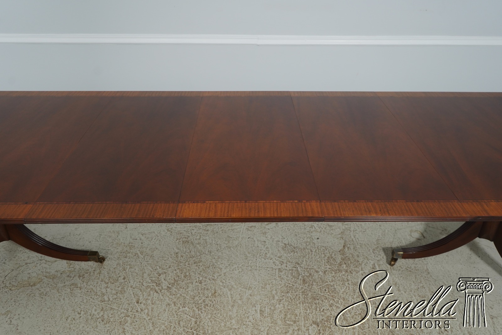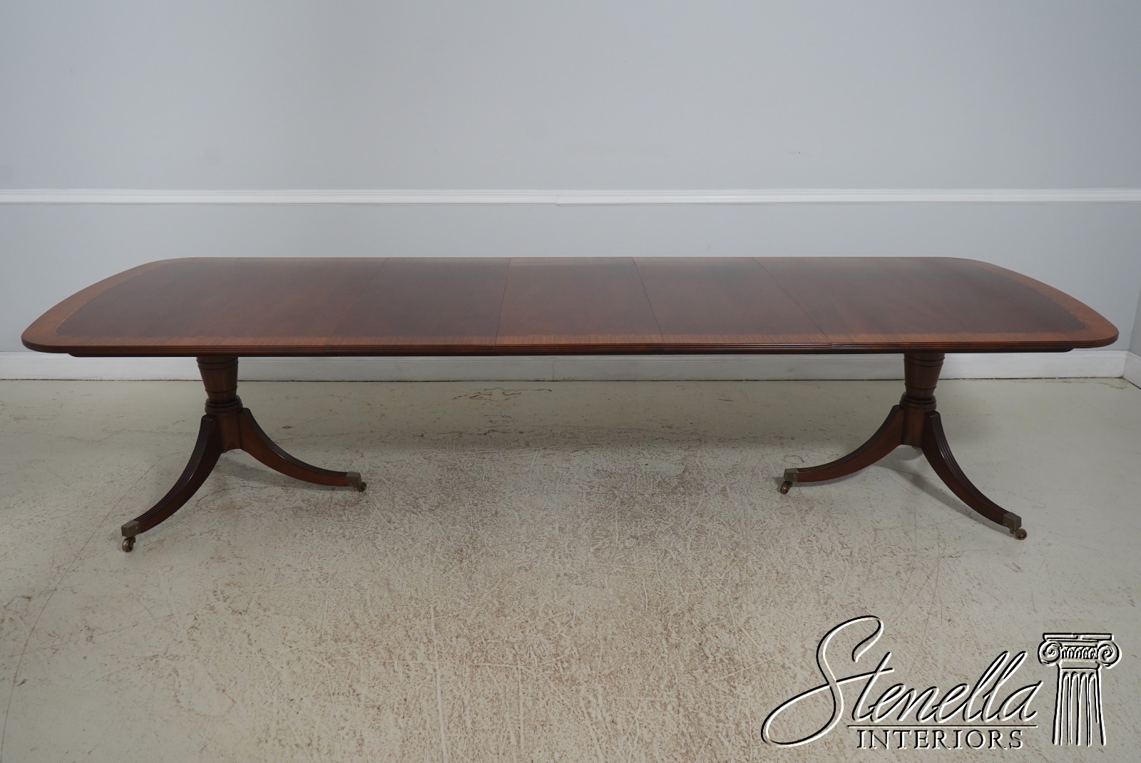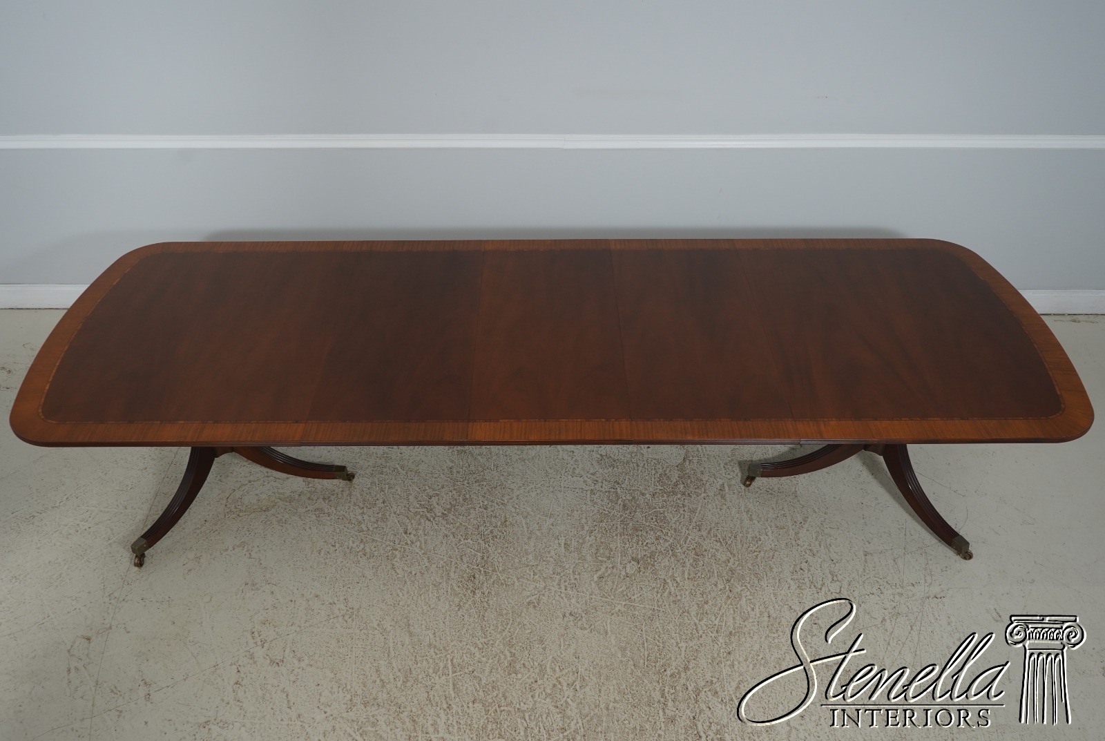 Details: Bill Scofield Collection Georgian Style Mahogany Brass Capped Feet & Casters High Quality Construction Large Impressive Table Nice Inlay Work Throughout Traditional Style Double Pedestal Reeded Edge Banded Line Inlay Satinwood Cross Banded Borders Offered @ Fraction Original Retail Cost