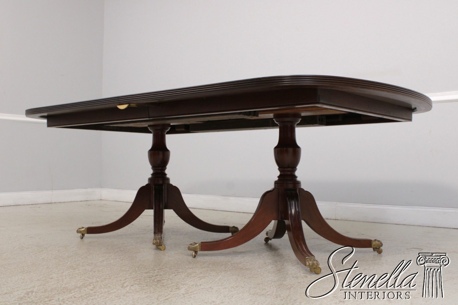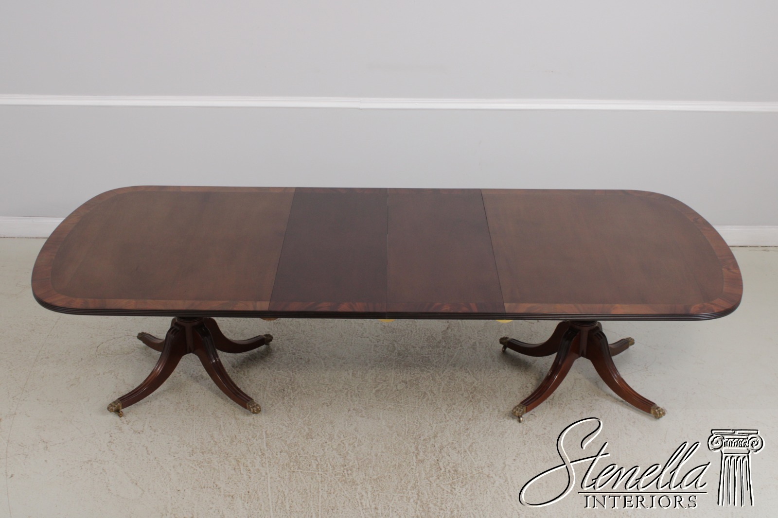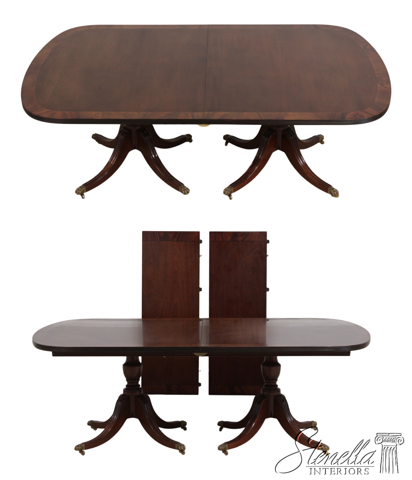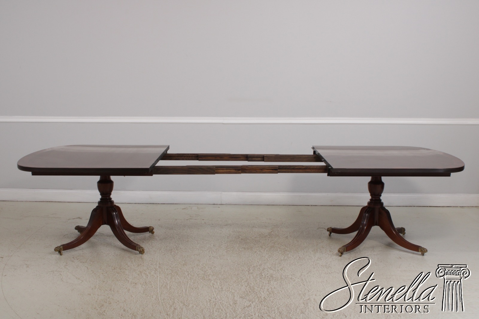 Details: Georgian Style Ball & Claw Feet Brass Capped Feet & Casters Fine Carved Details High Quality Construction Large Impressive Table See Other Offerings For Matching Chairs Traditional Style Leaves Slightly Darker Than Top Turned Pedestals Un-Marked As To Manufacture Offered @ Fraction Original Retail Cost