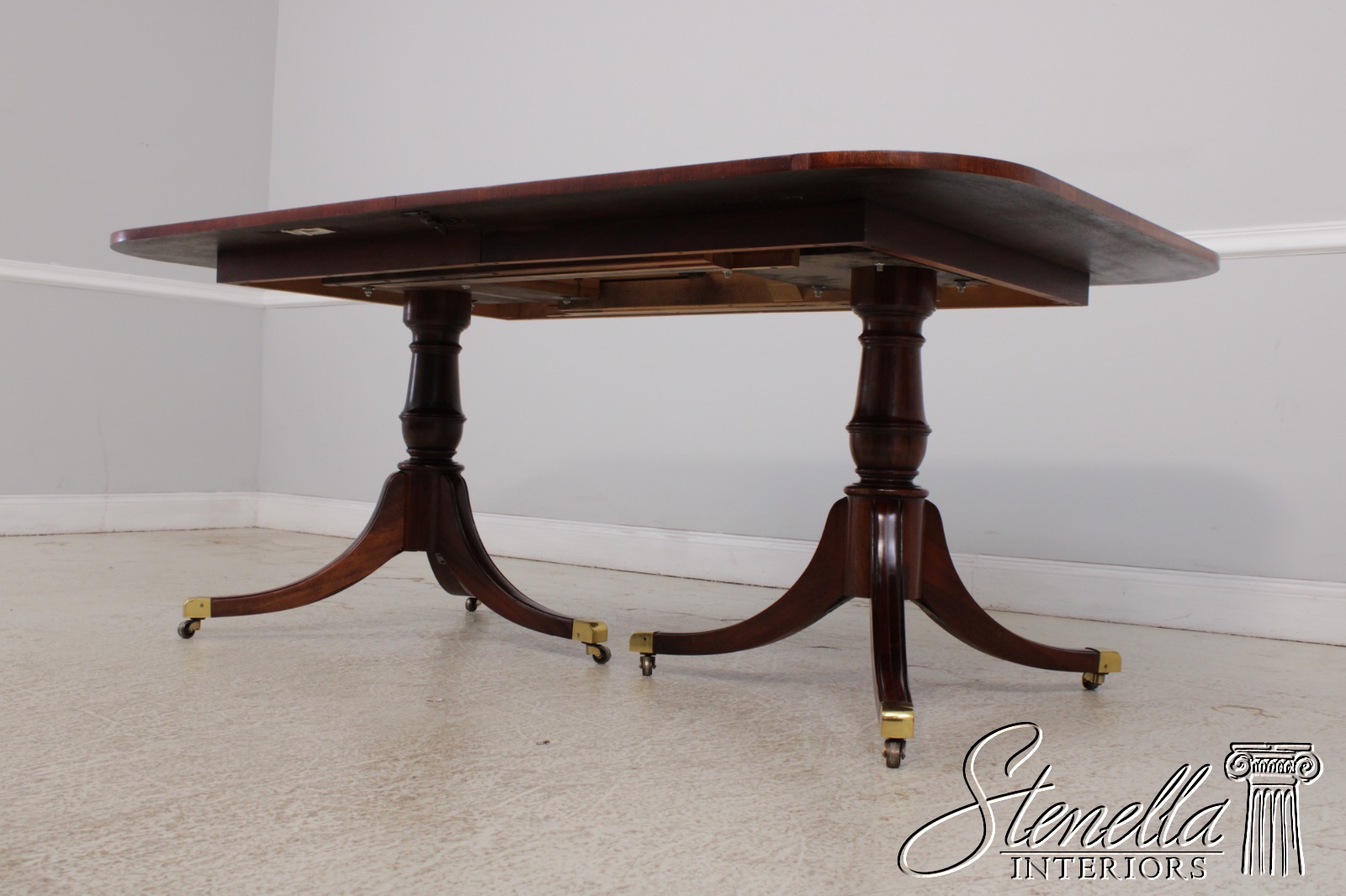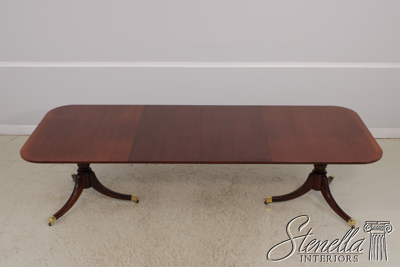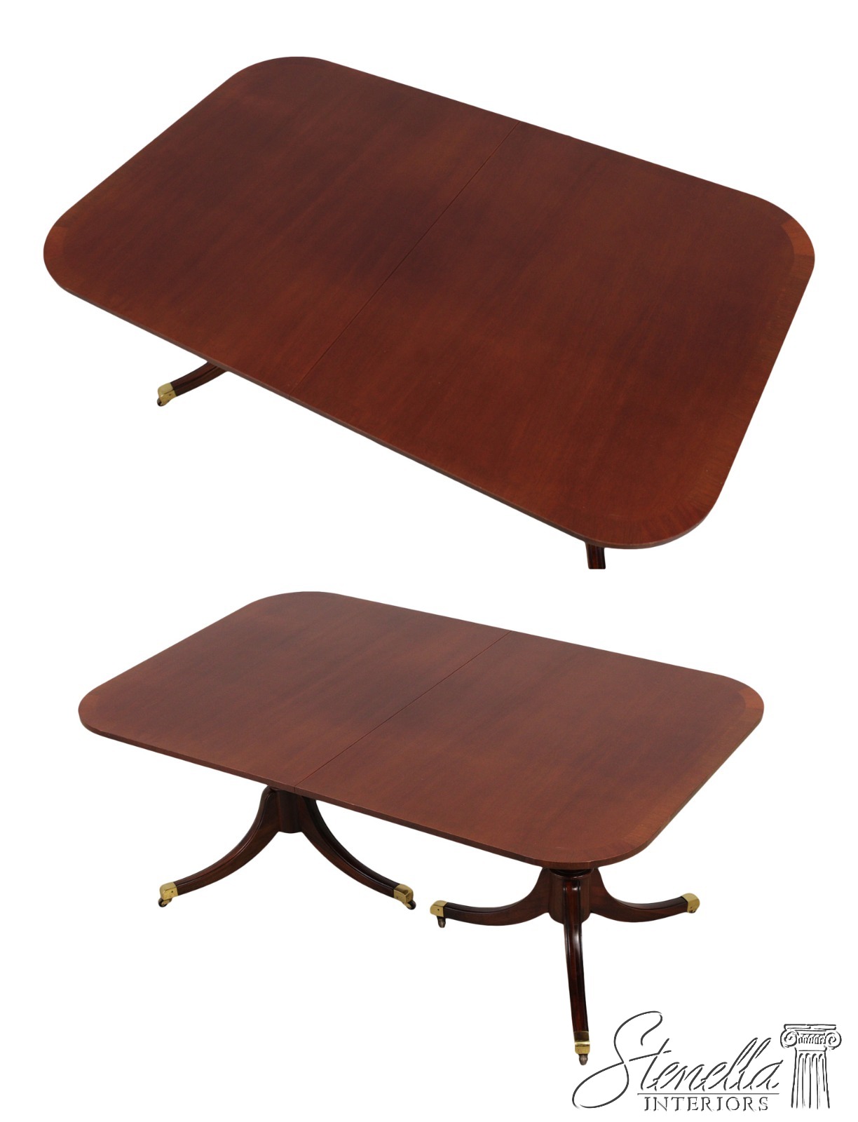 Details: Mahogany Brass Capped Feet & Casters High Quality Construction Nice Inlay Work Throughout Turned Double Pedestals Traditional Style Un-Marked As To Manufacture Possibly By Drexel, Hickory Chair Co or Similar Manufacture Offered @ Fraction Original Retail Cost