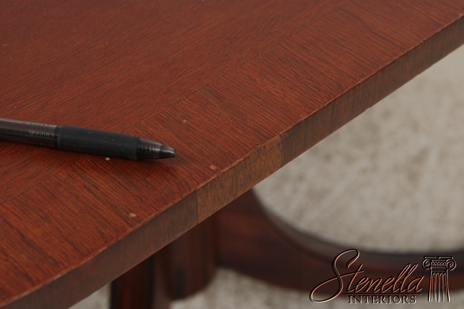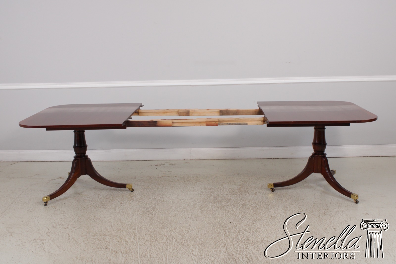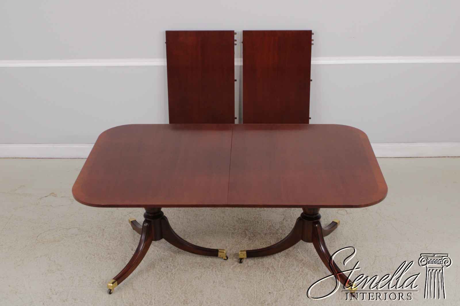 Details: Mahogany Brass Capped Feet & Casters High Quality Construction Nice Inlay Work Throughout Turned Double Pedestals Traditional Style Un-Marked As To Manufacture Possibly By Drexel, Hickory Chair Co or Similar Manufacture Offered @ Fraction Original Retail Cost