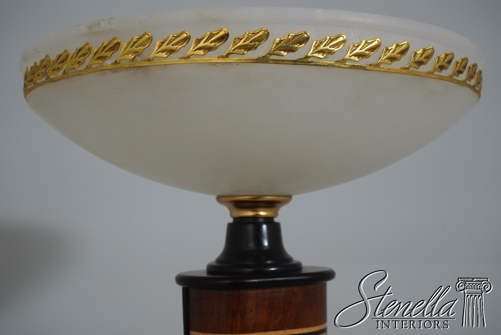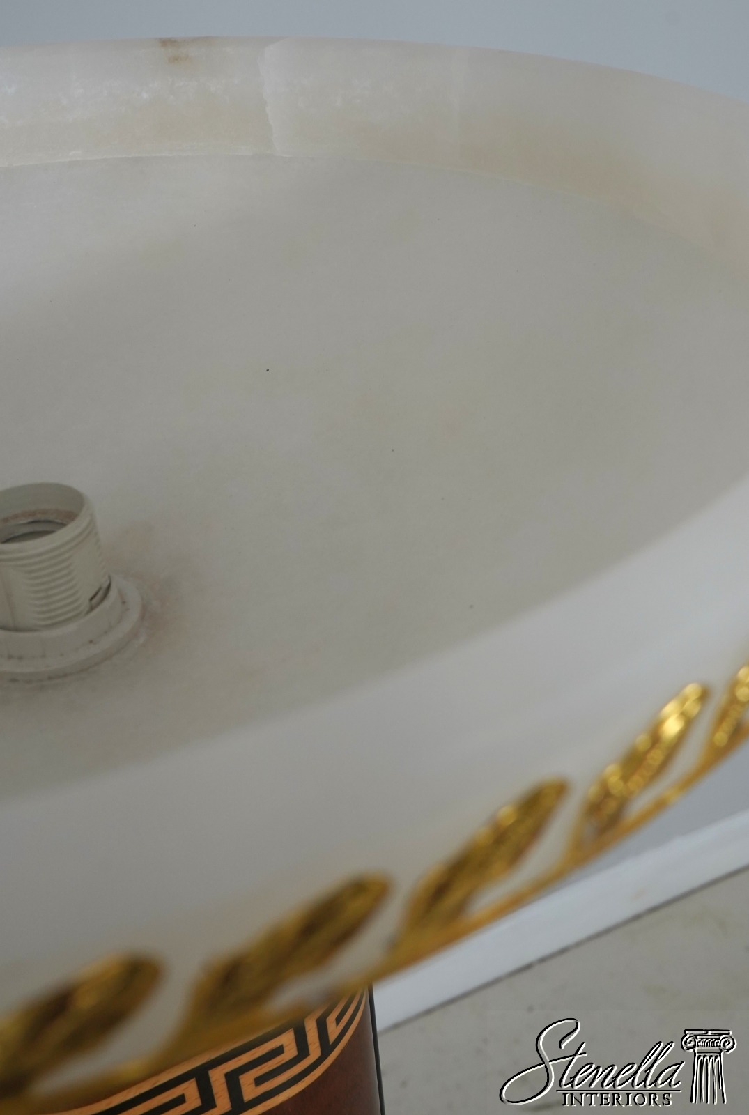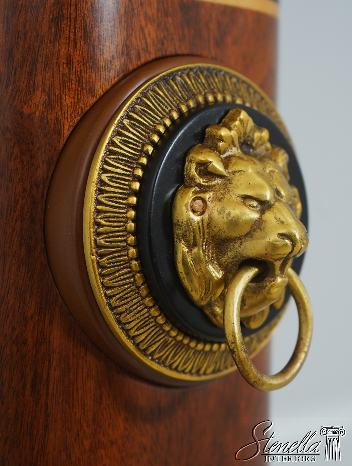 Details: Versace Collection Solid Mahogany High Quality Construction Iridescent Stone Shade w. Brass Trim Greek Key & Ebony Satinwood Inlays Brass Lion Head Hardware Un-Marked As To Manufacture Offered @ Fraction Original Retail Cost
