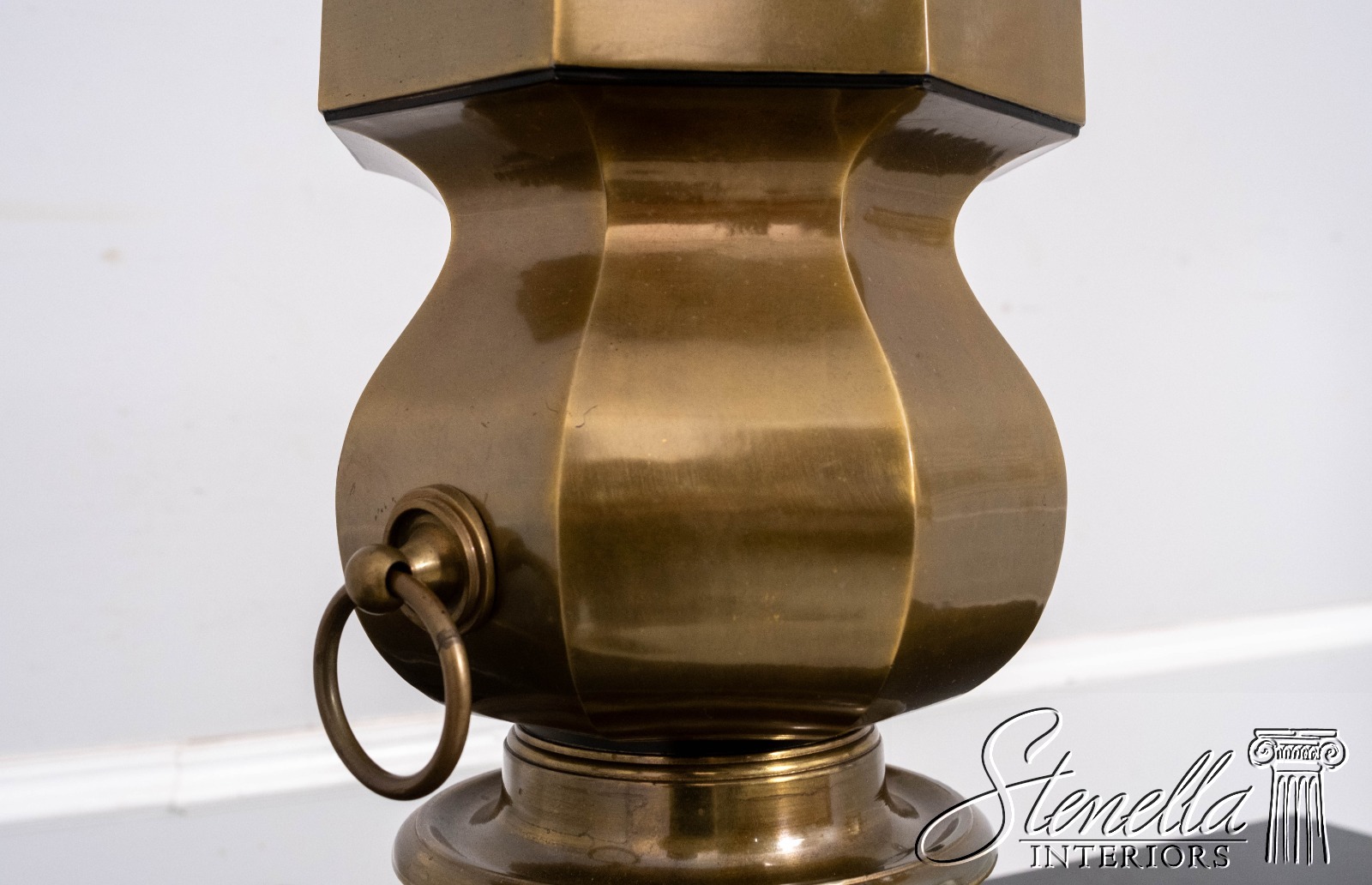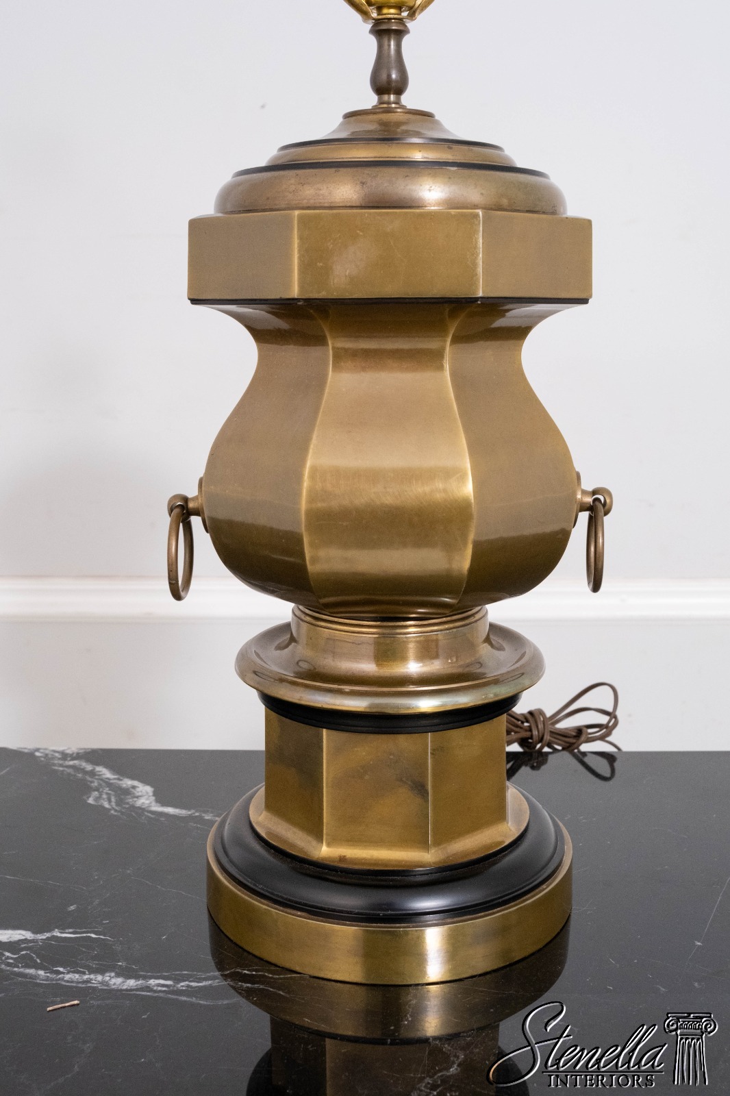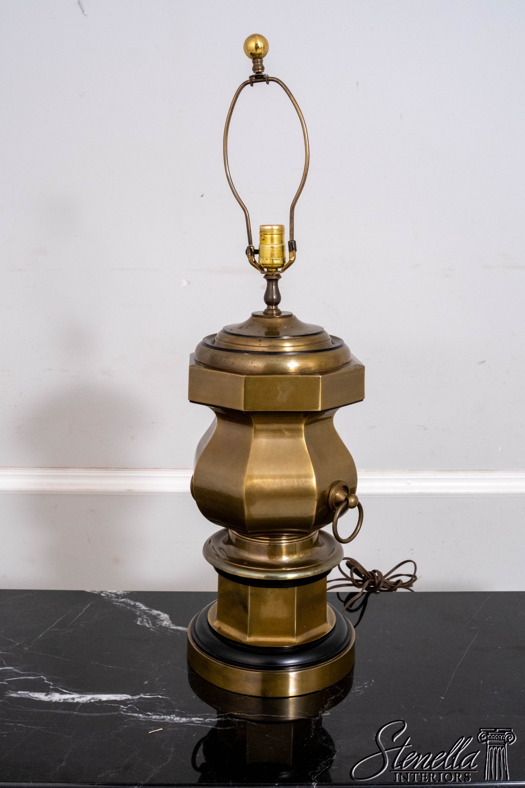 Details: Large impressive brass lamp that makes a statement. Octagonal body, ring handles, weighty base. Possibly by "Chapman" in late 1970s.
