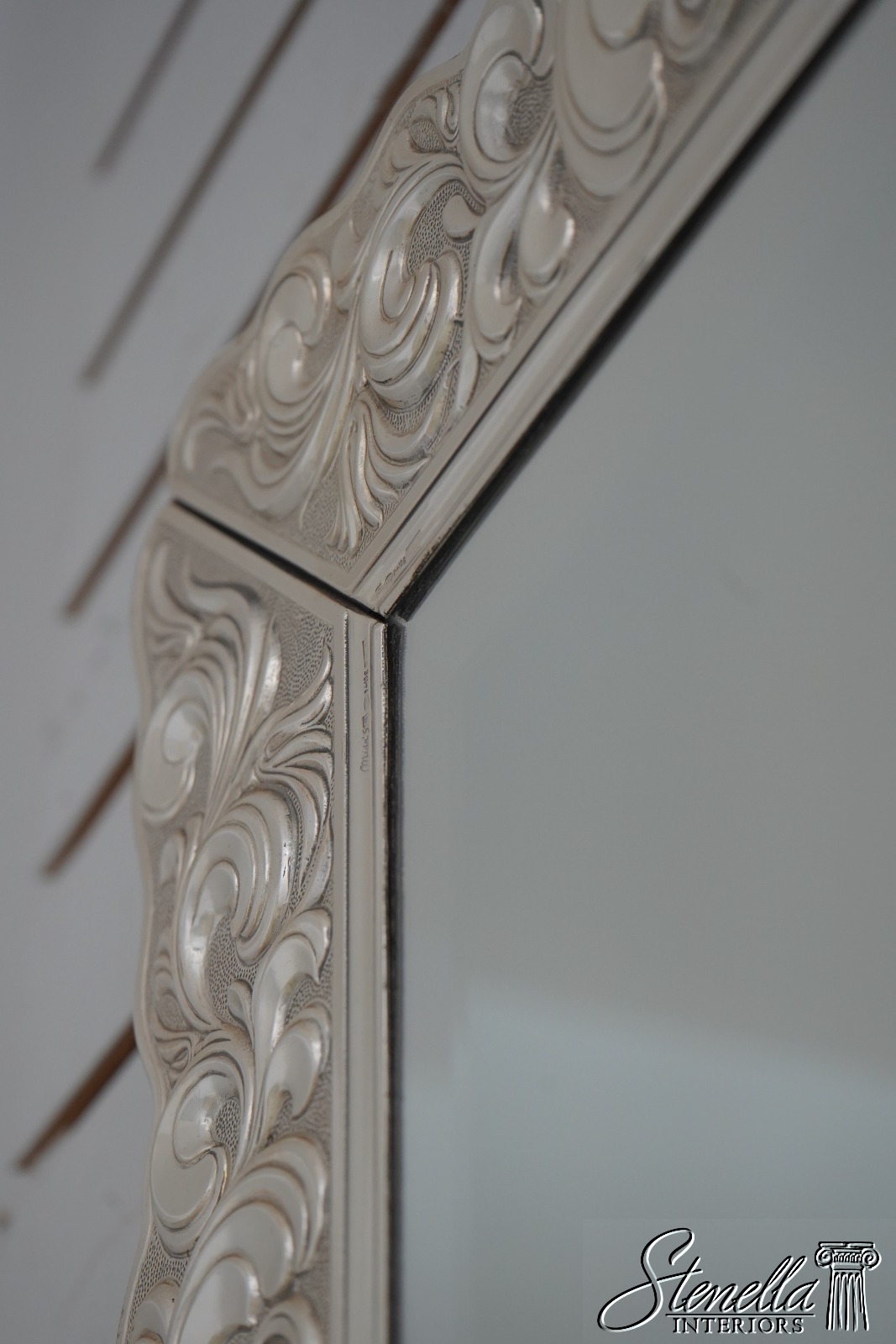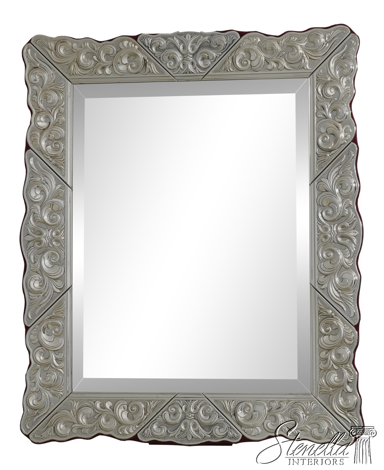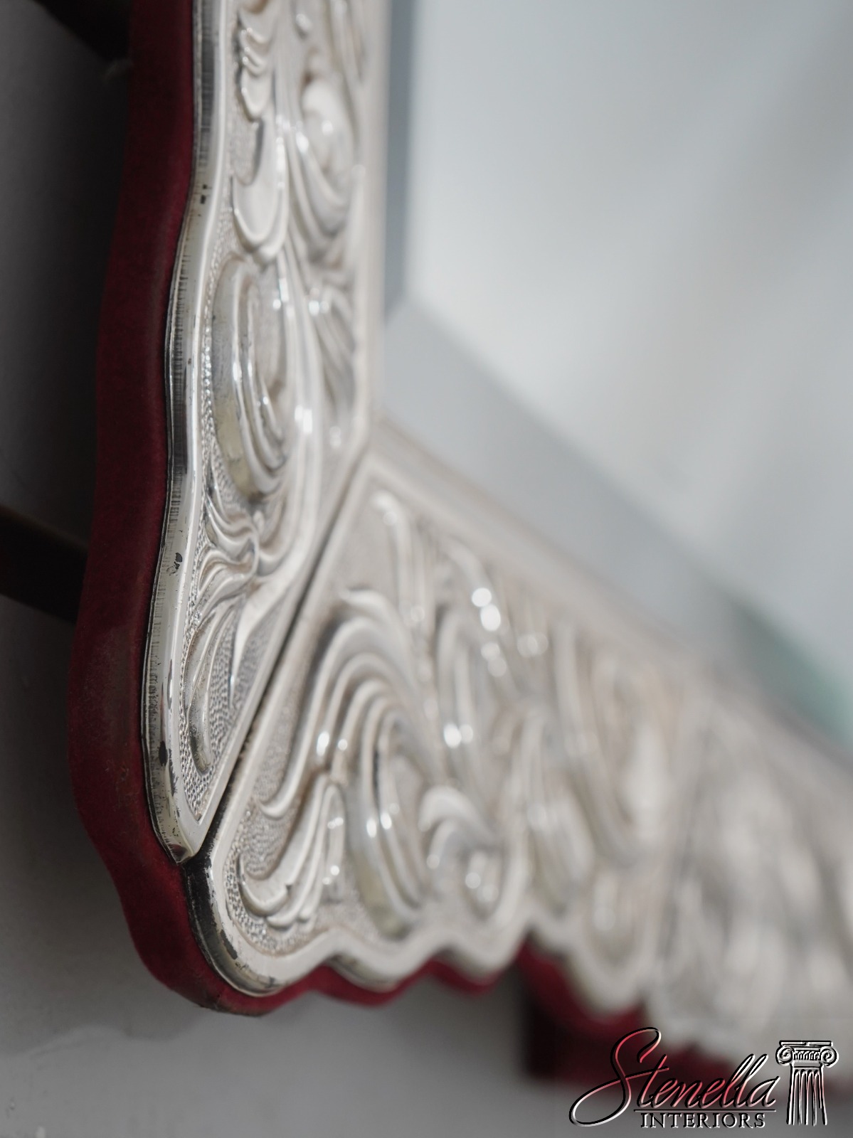 Details: Beveled Glass Mirror Large Dresser Top Mirror High Quality Construction Felt Back French Style Gorgeous Embossed Sterling Silver Metal Frame Signed On Bottom Left Floral Motif Frame w. Graceful Fluer-De-Lis