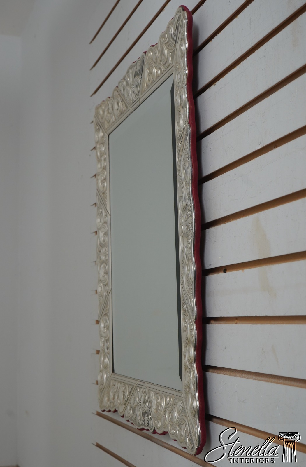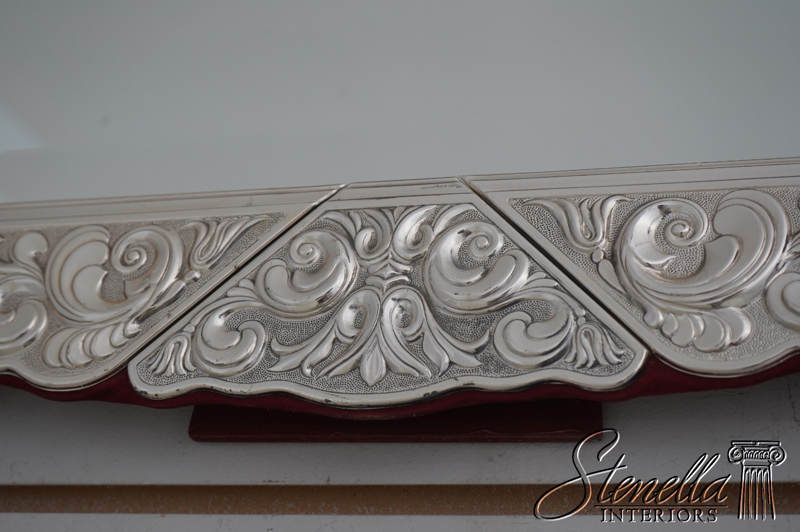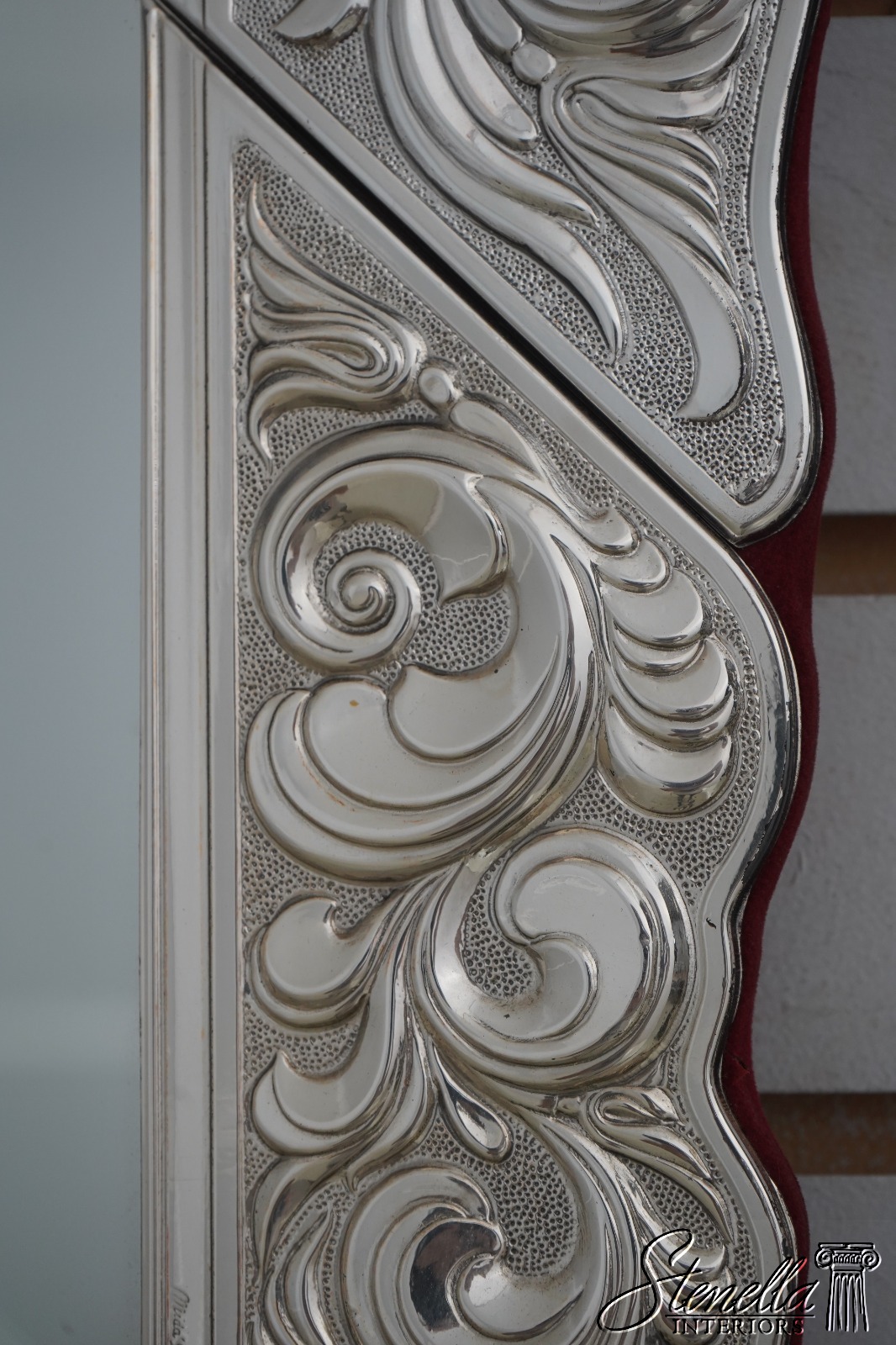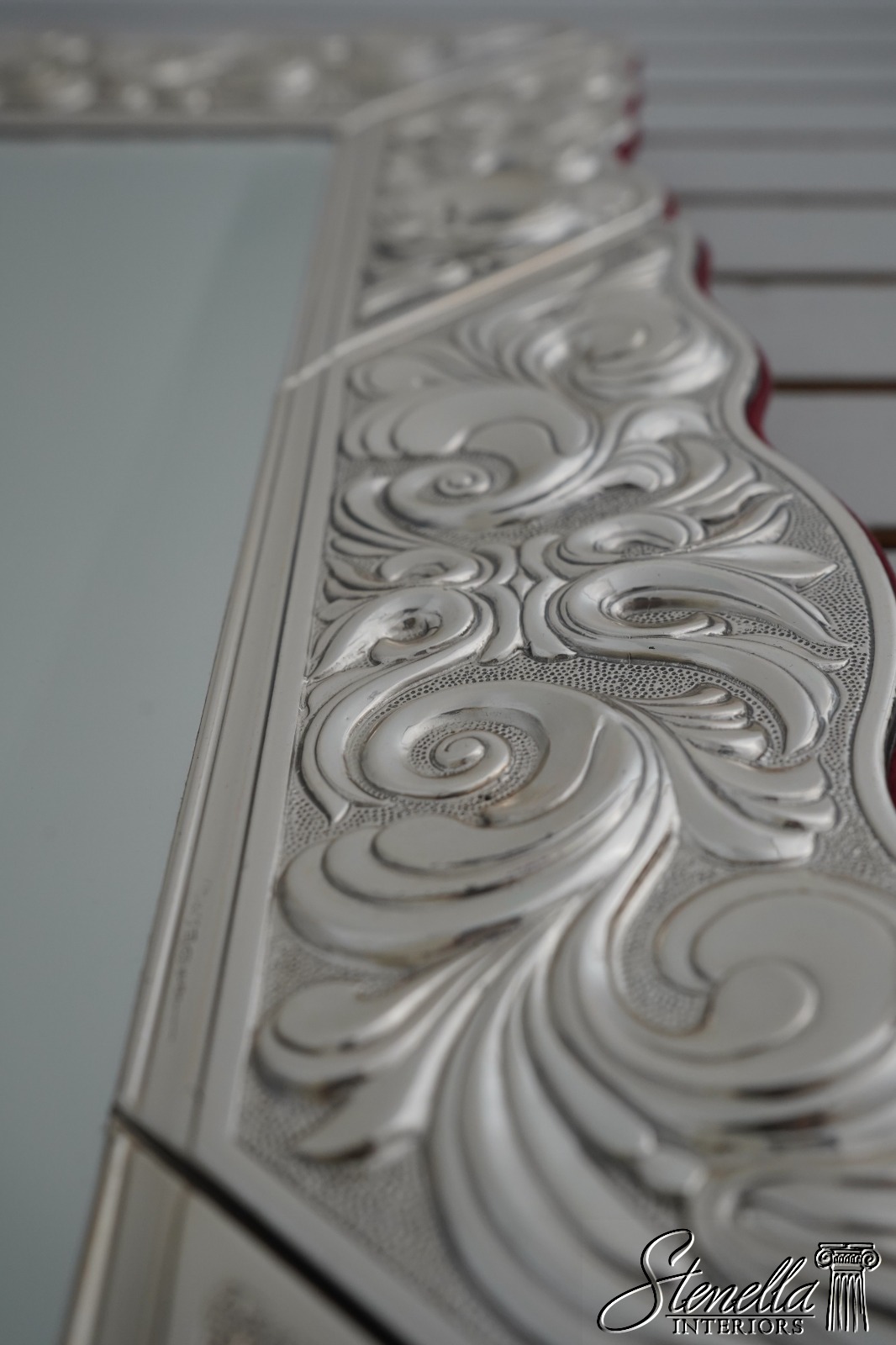 Details: Beveled Glass Mirror Large Dresser Top Mirror High Quality Construction Felt Back French Style Gorgeous Embossed Sterling Silver Metal Frame Signed On Bottom Left Floral Motif Frame w. Graceful Fluer-De-Lis