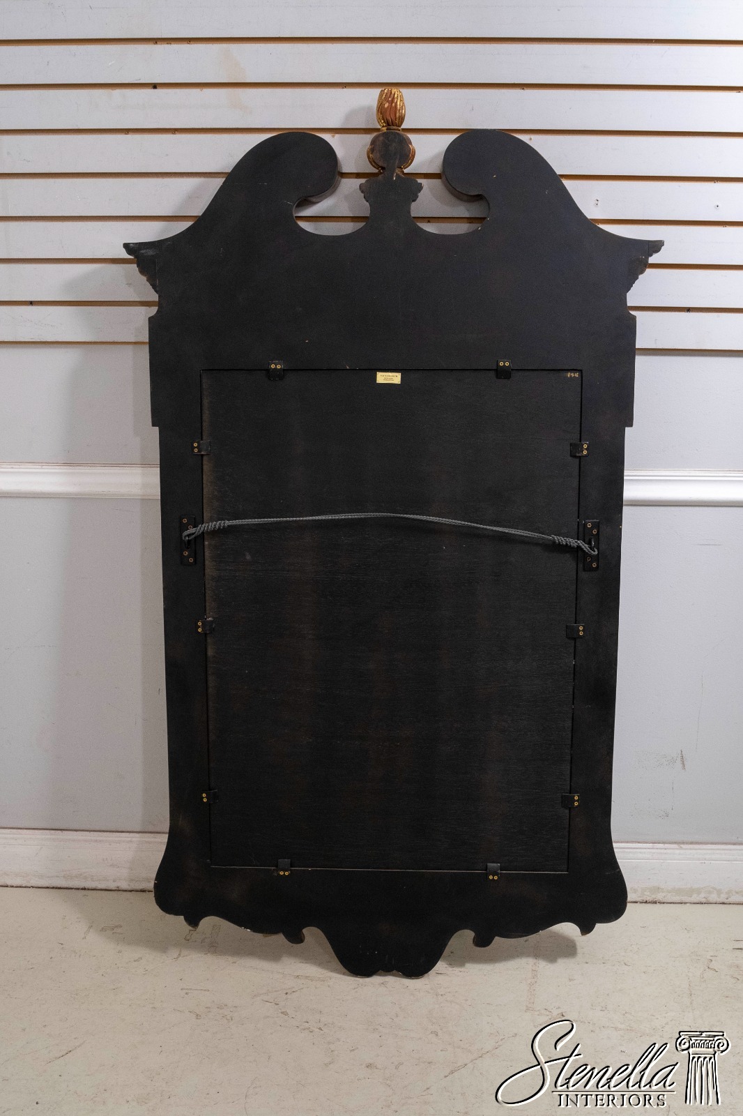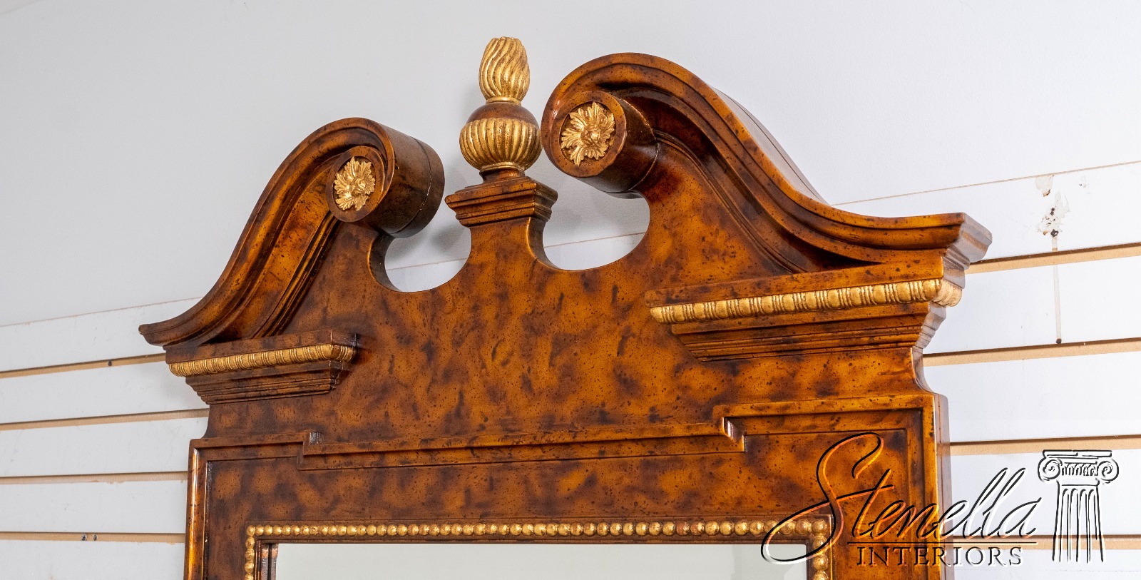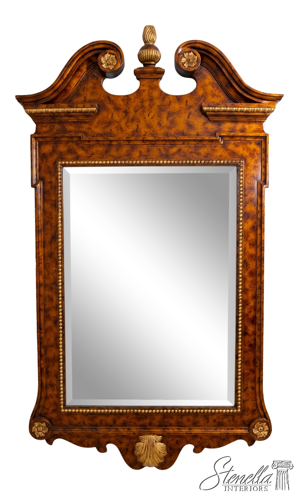Details: Beveled Glass Mirror High Quality Construction Large Impressive Mirror Pediment Top w. Finial Chippendale Style Traditional Style Faux Walnut Painted Finish Gold Accents Offered @ Fraction Original Retail Cost