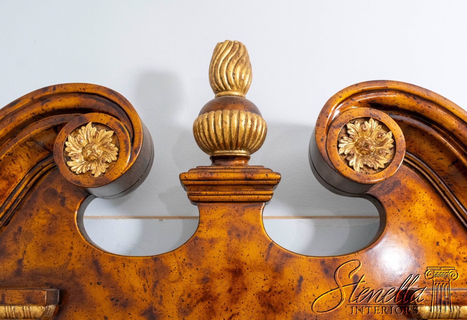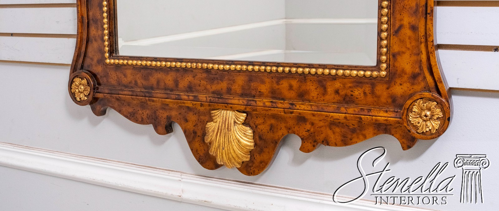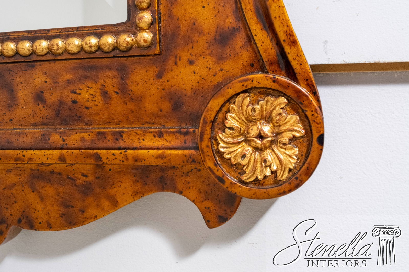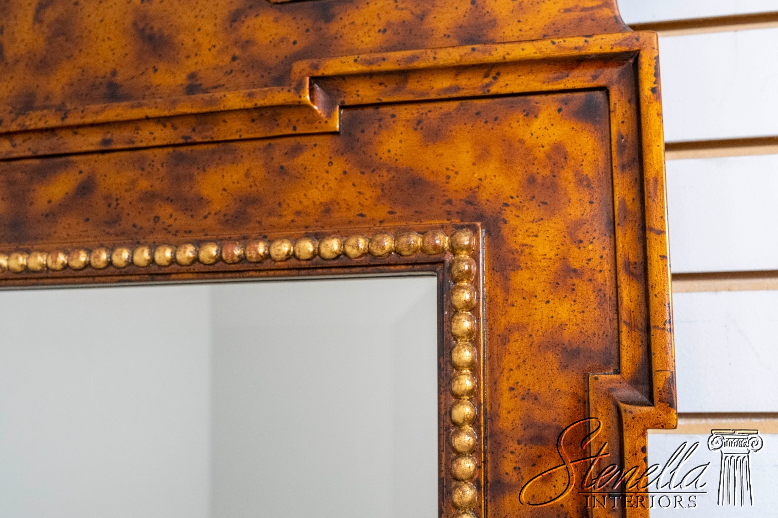 Details: Beveled Glass Mirror High Quality Construction Large Impressive Mirror Pediment Top w. Finial Chippendale Style Traditional Style Faux Walnut Painted Finish Gold Accents Offered @ Fraction Original Retail Cost