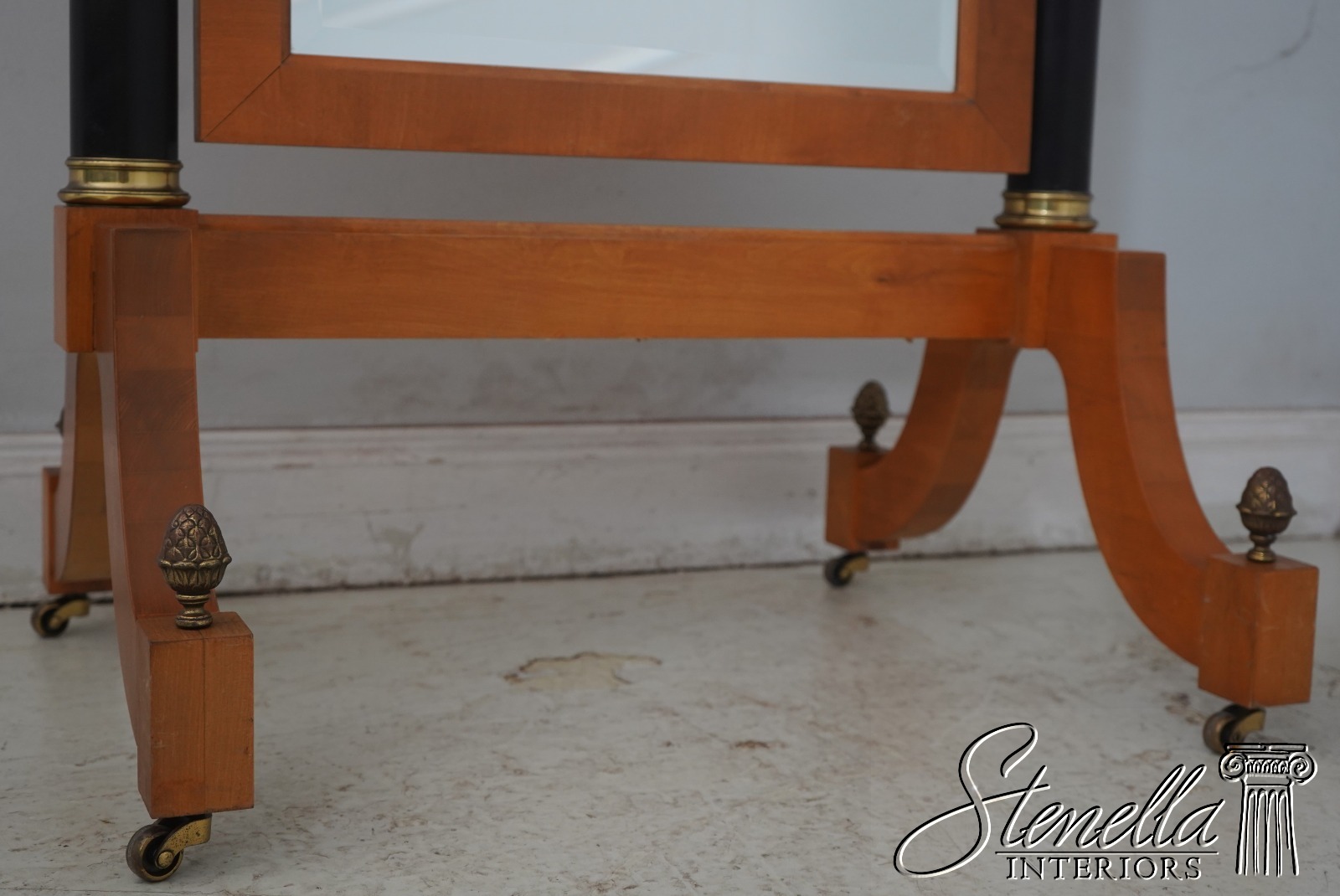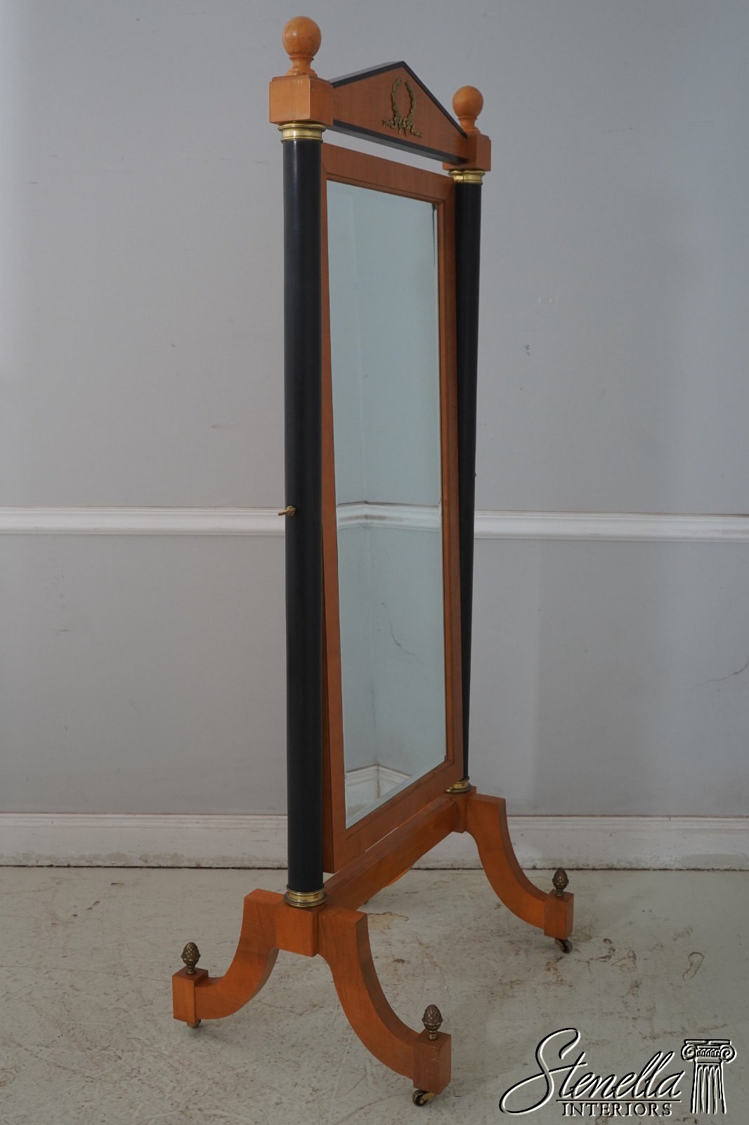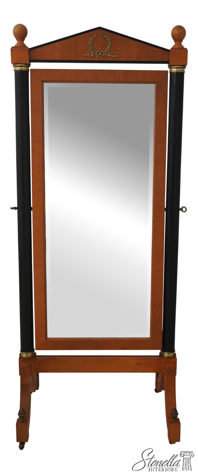 Details: Grand Classics Collection Satinwood w. Black Columns Beveled Glass Quality Construction Pediment Top Solid Brass Hardware & Casters Acorn/Pineapple Finials French Empire Style Tilt Adjustable Splayed Legs Un-Marked As To Manufacture Offered @ Fraction Original Retail Cost
