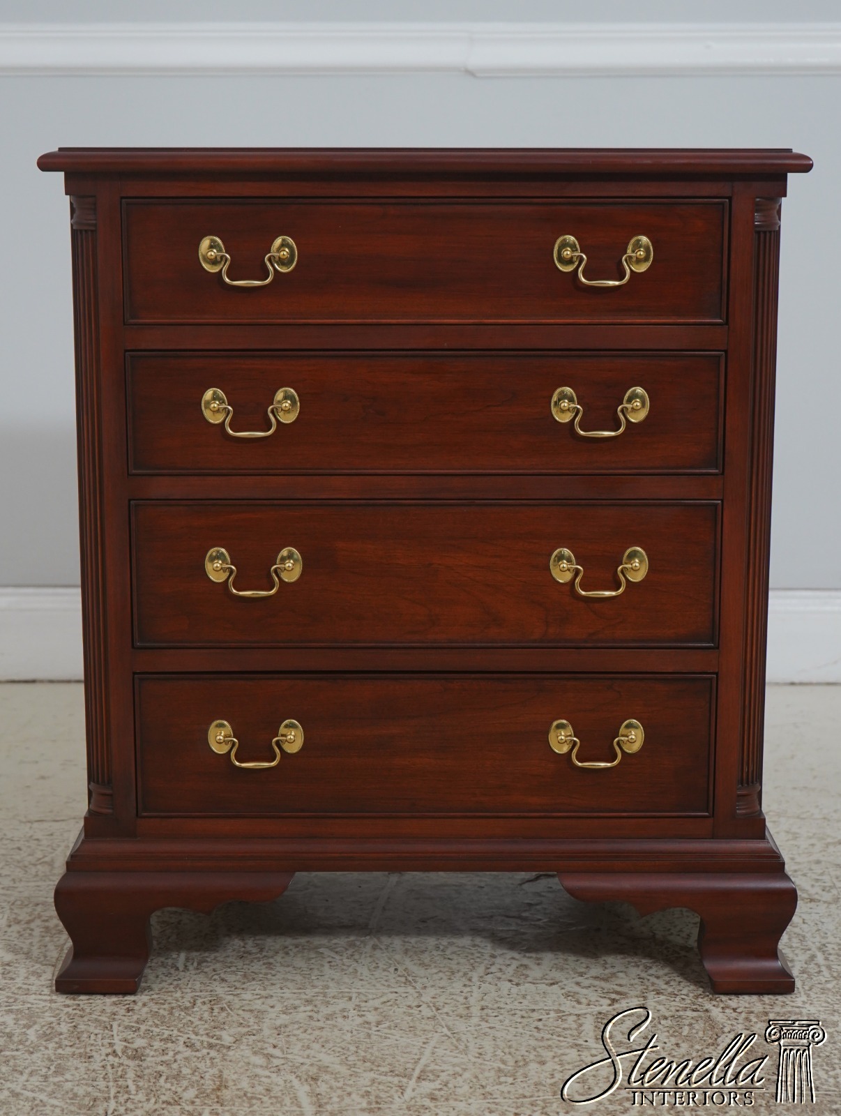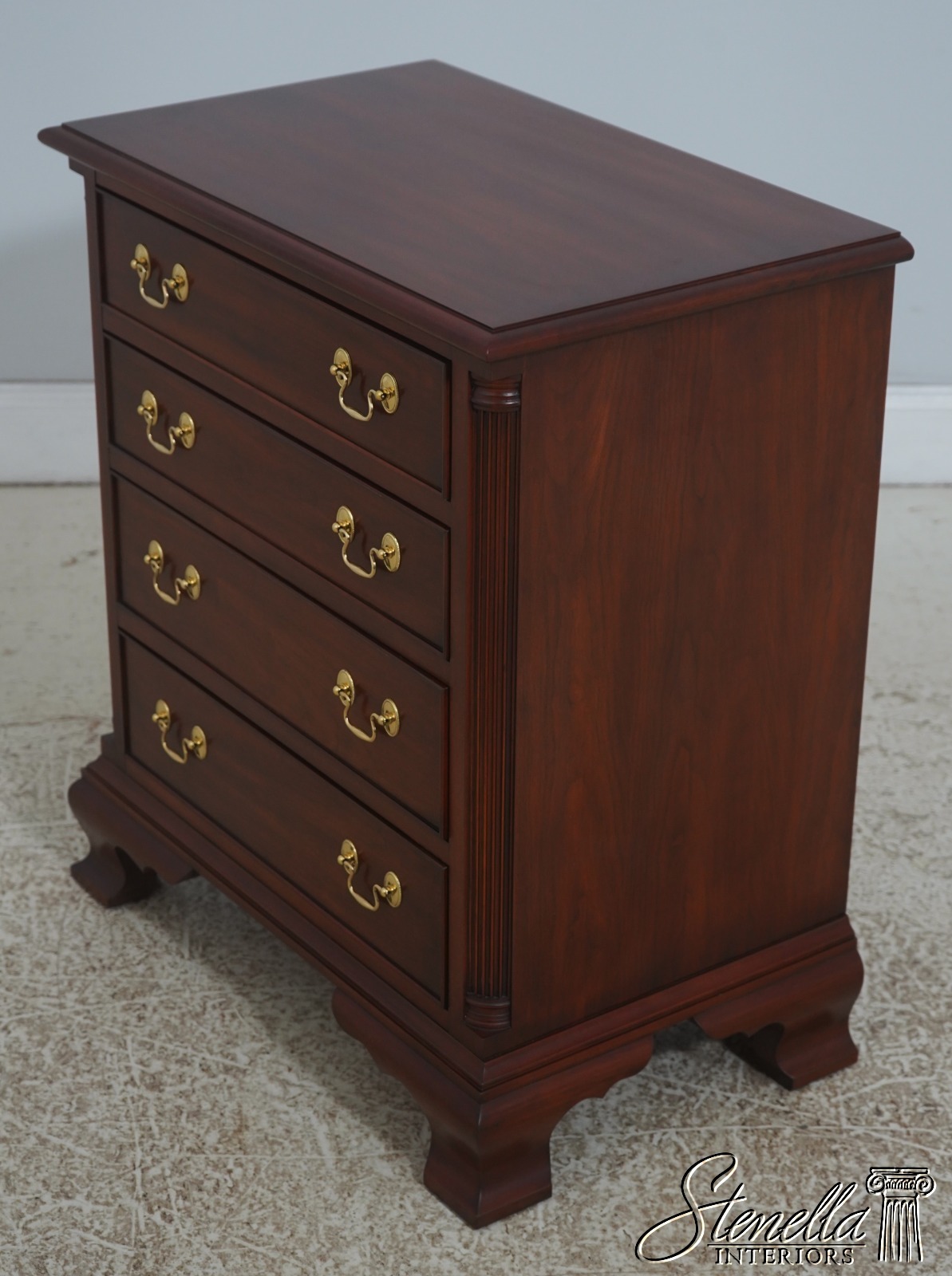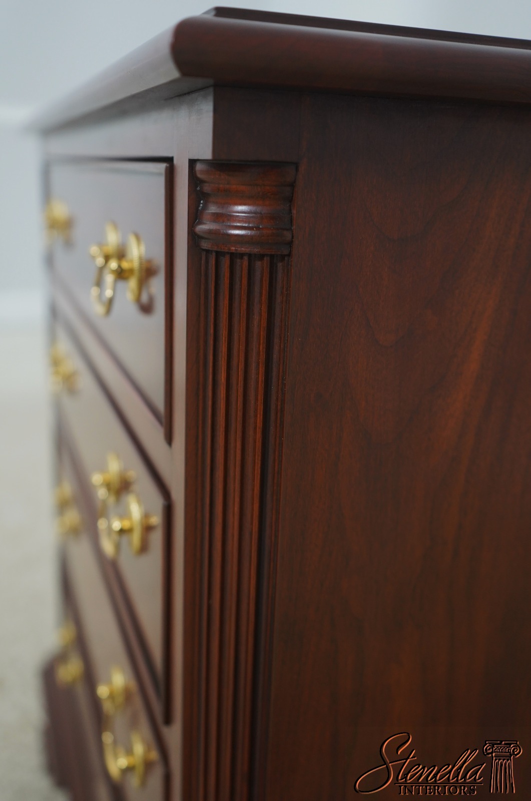 Details: Model 116 Finish no.24 Cherry Bracket Feet Dovetailed Drawer Construction Fine Carved Details High Quality Construction Quarter Column Sides Chippendale Style 4 Drawers Solid Brass Hardaware Fluted Columns Offered @ Fraction Original Retail Cost