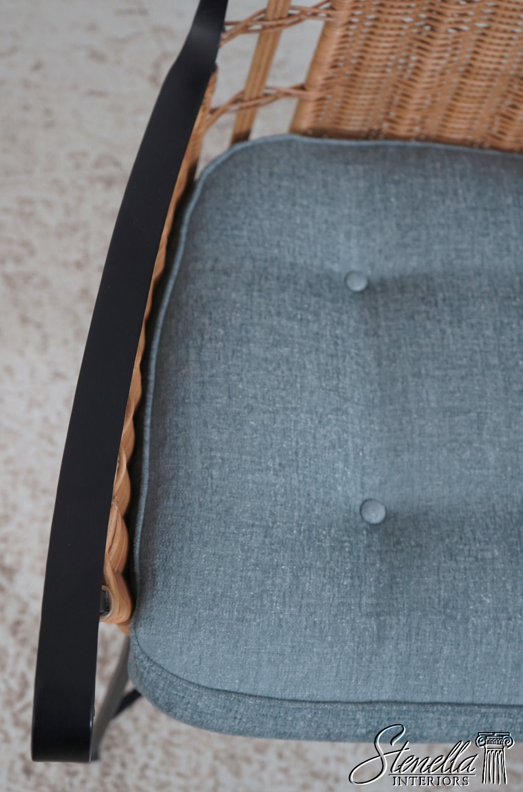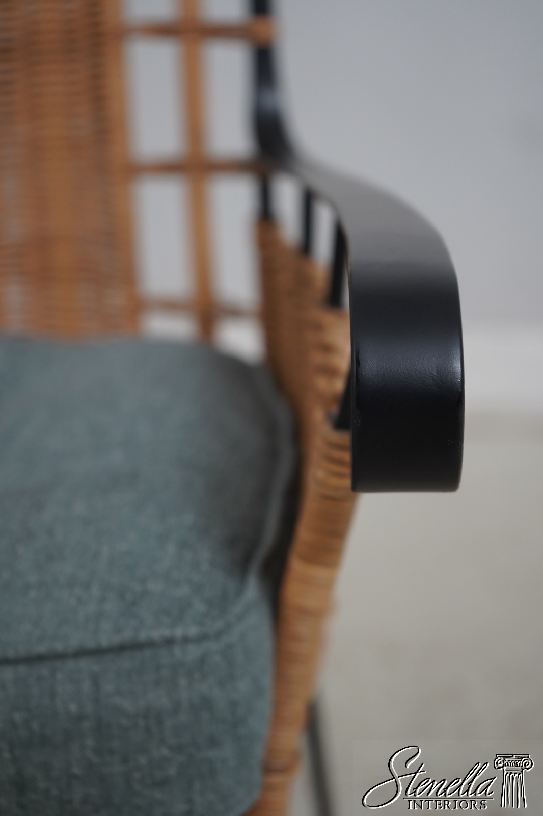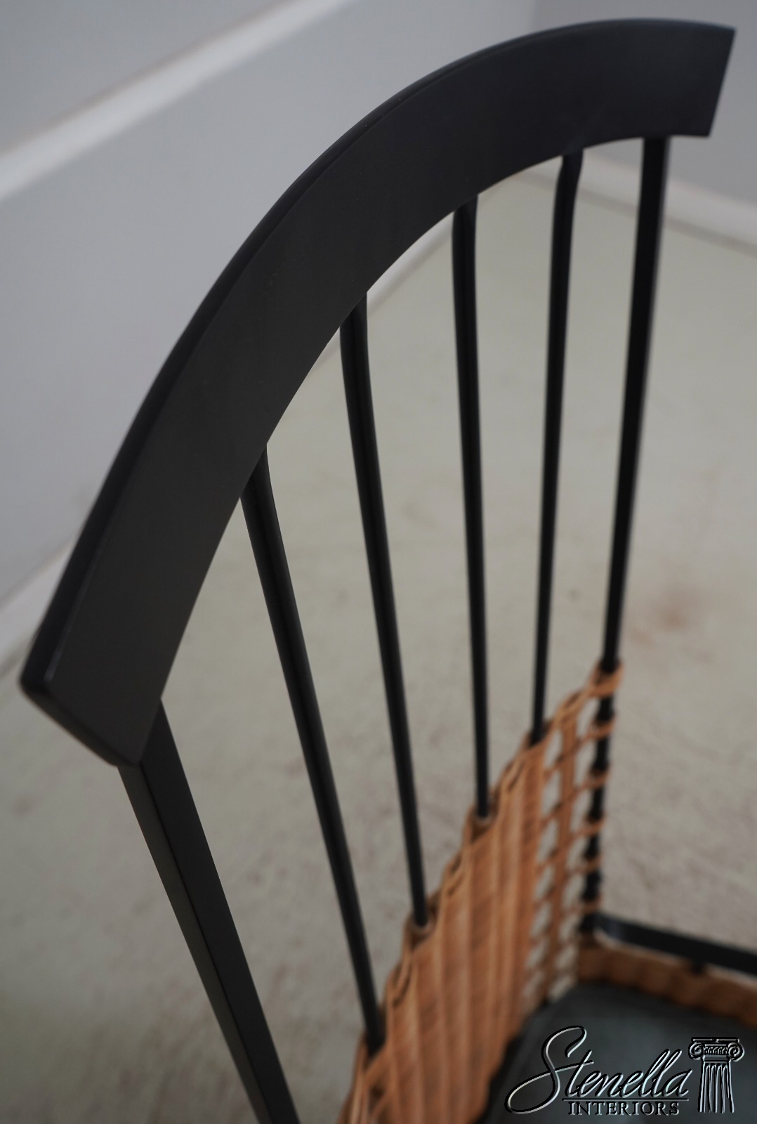 Details: Modern Design Quality Wrought Iron Frame Black Frame w. Woven Wicker/Rattan Spindle Back Un-Marked As To Manufacture Possibly Charleston Forge Offered @ Fraction Original Retail Cost