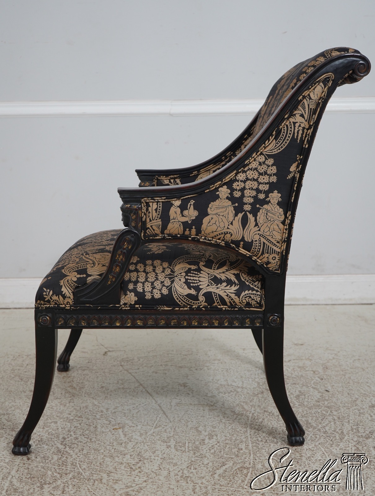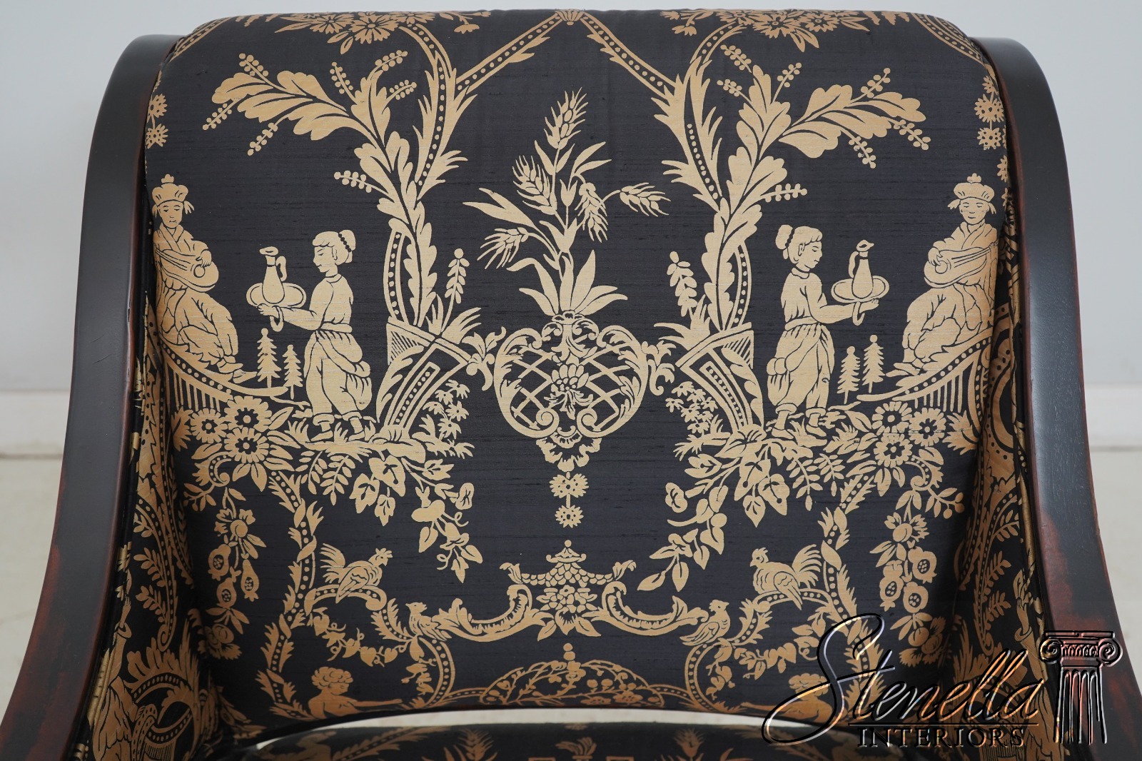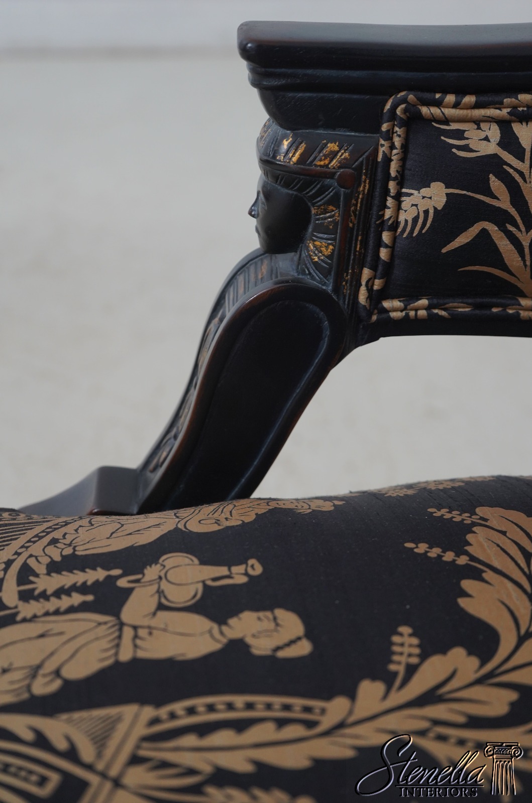 Details: Egyptian Carved Arms Carved Details Quality Construction Subtle Gold Highlights Stunning Chinoiserie Silk Blend Upholstery Hoof Feet Regency Style Un-Marked As To Manufacture Offered @ Fraction Original Retail Cost