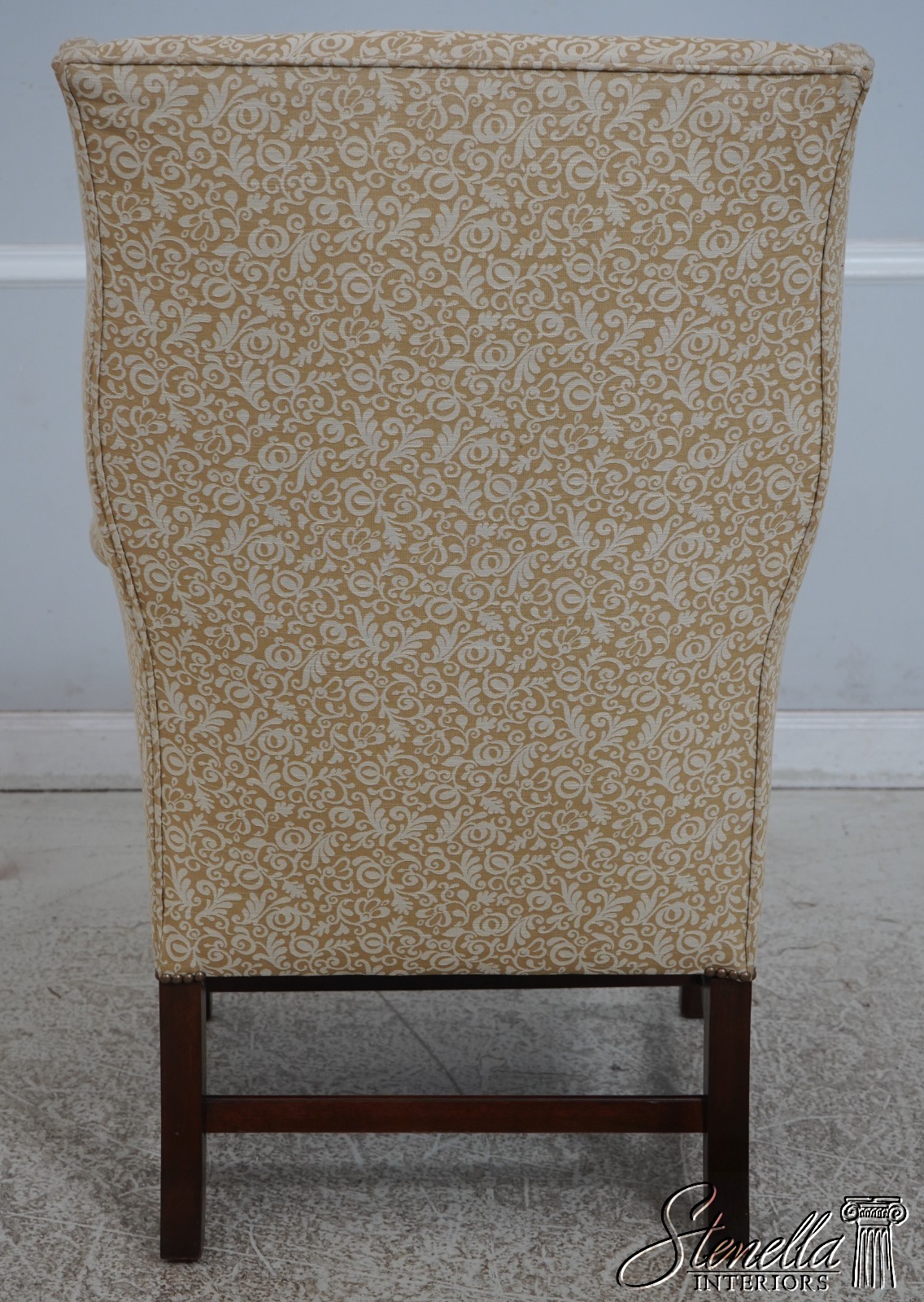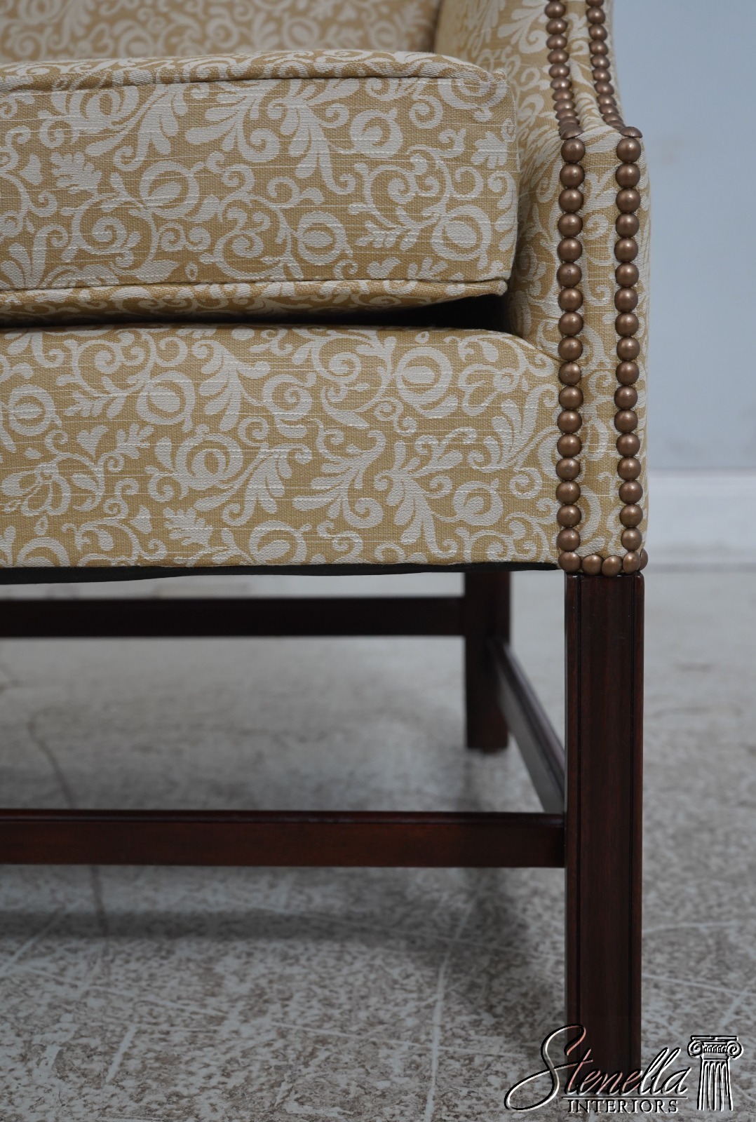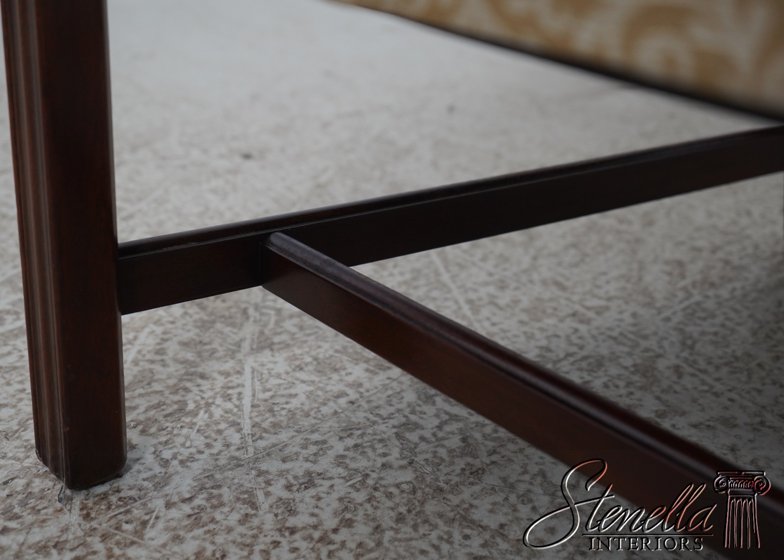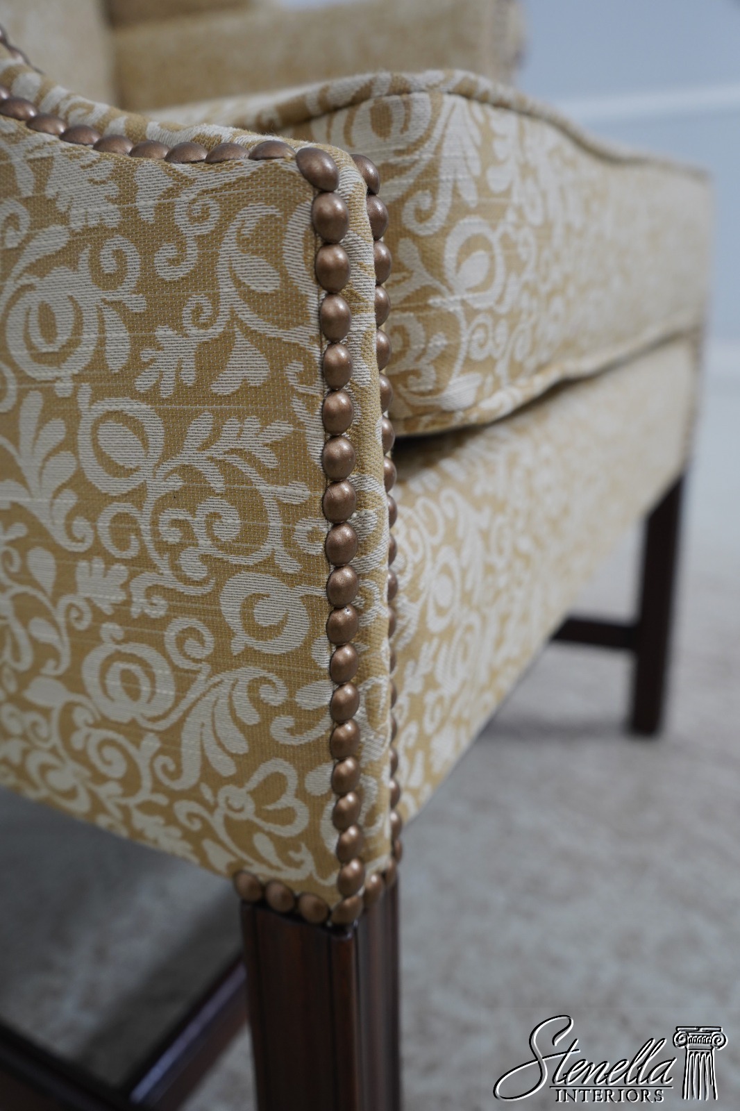 Details: High Quality Construction 18 C. Design Chippendale Style Stretcher Base Frame Tack Head Trim Professionally Reupholstered In Quality Damask Print Upholstery Offered @ Fraction Original Retail Cost