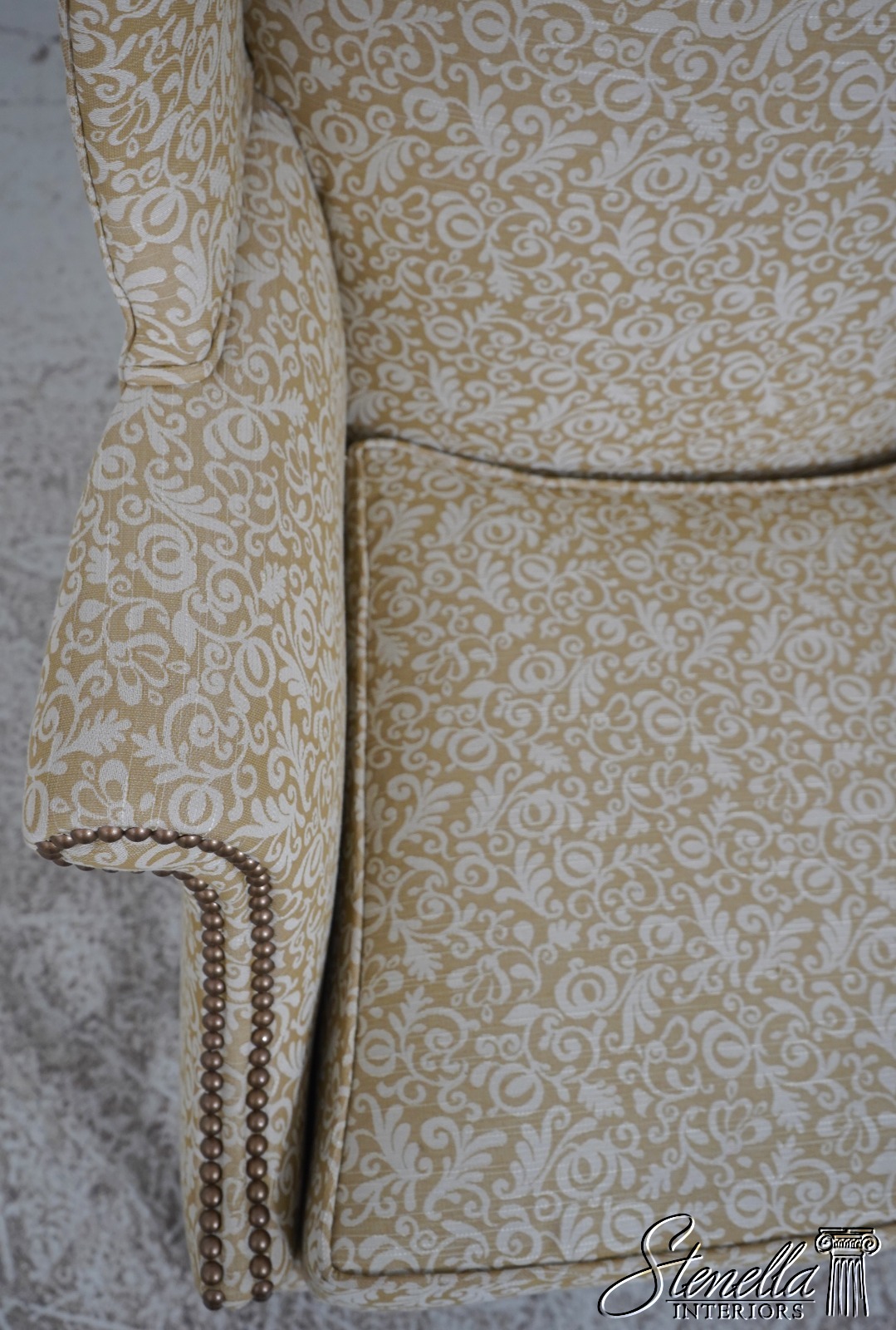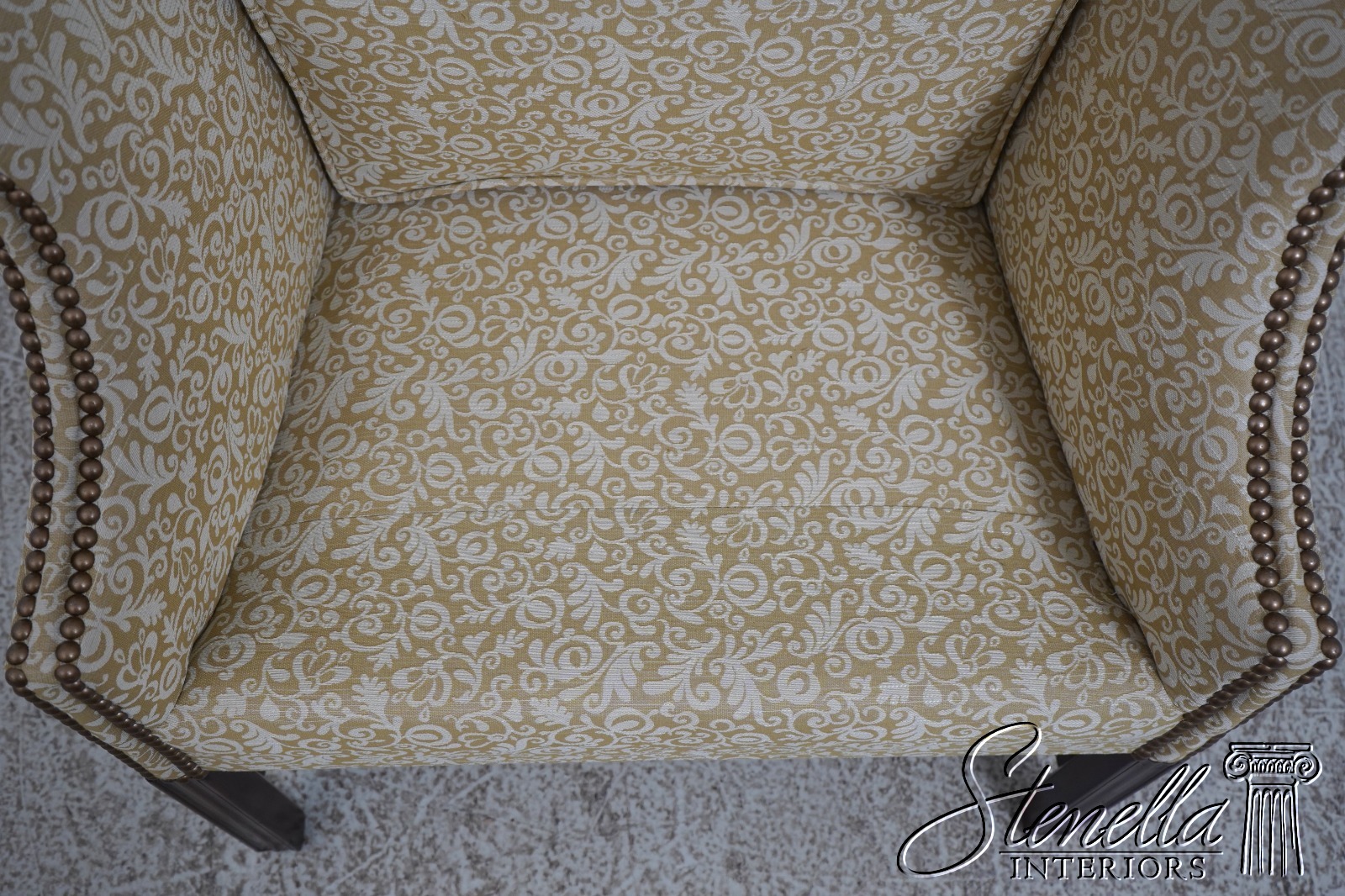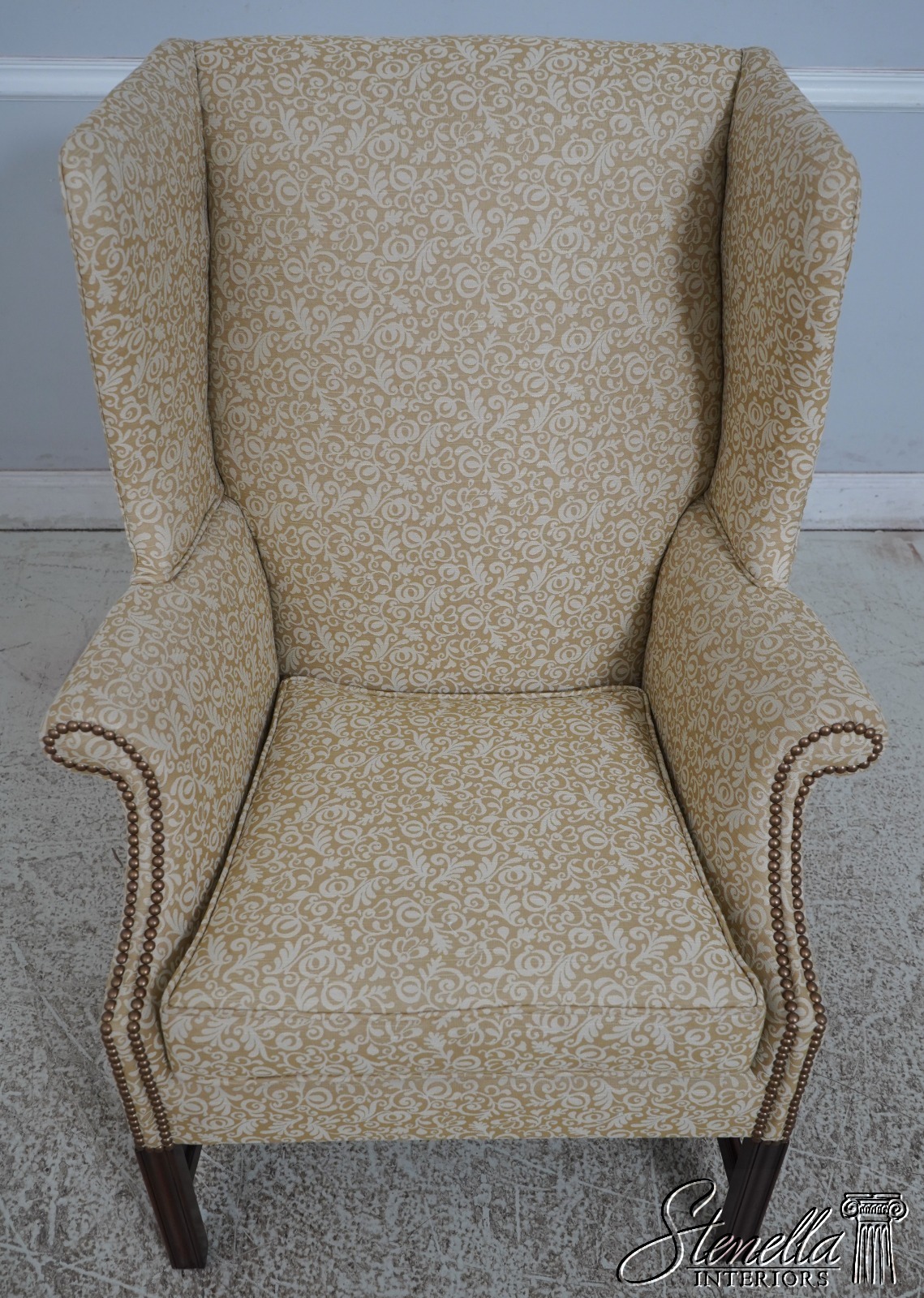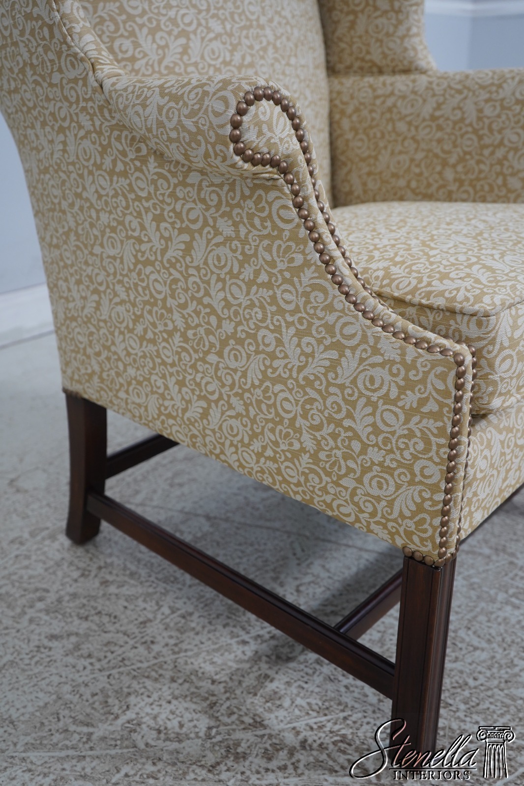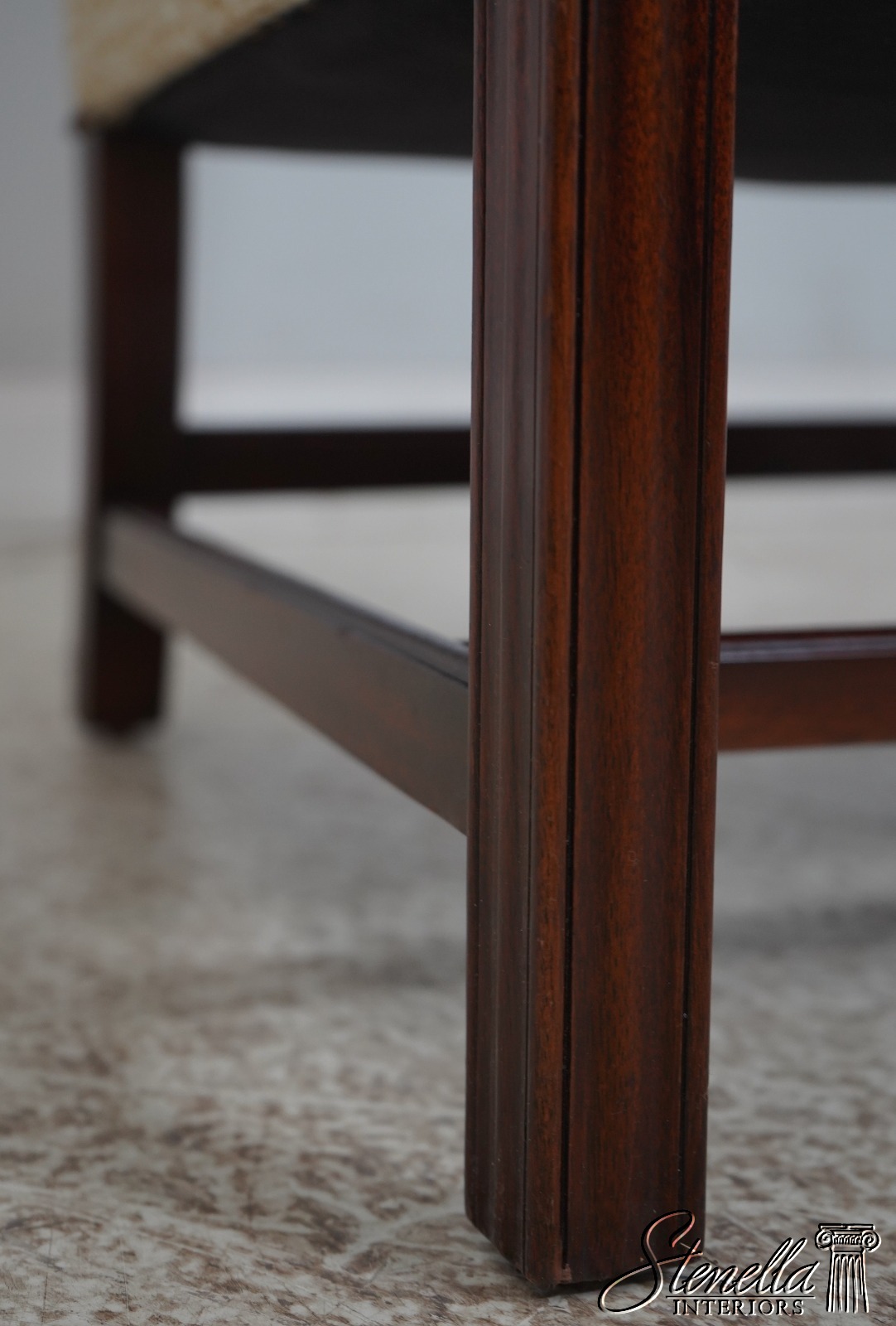 Details: High Quality Construction 18 C. Design Chippendale Style Stretcher Base Frame Tack Head Trim Professionally Reupholstered In Quality Damask Print Upholstery Offered @ Fraction Original Retail Cost