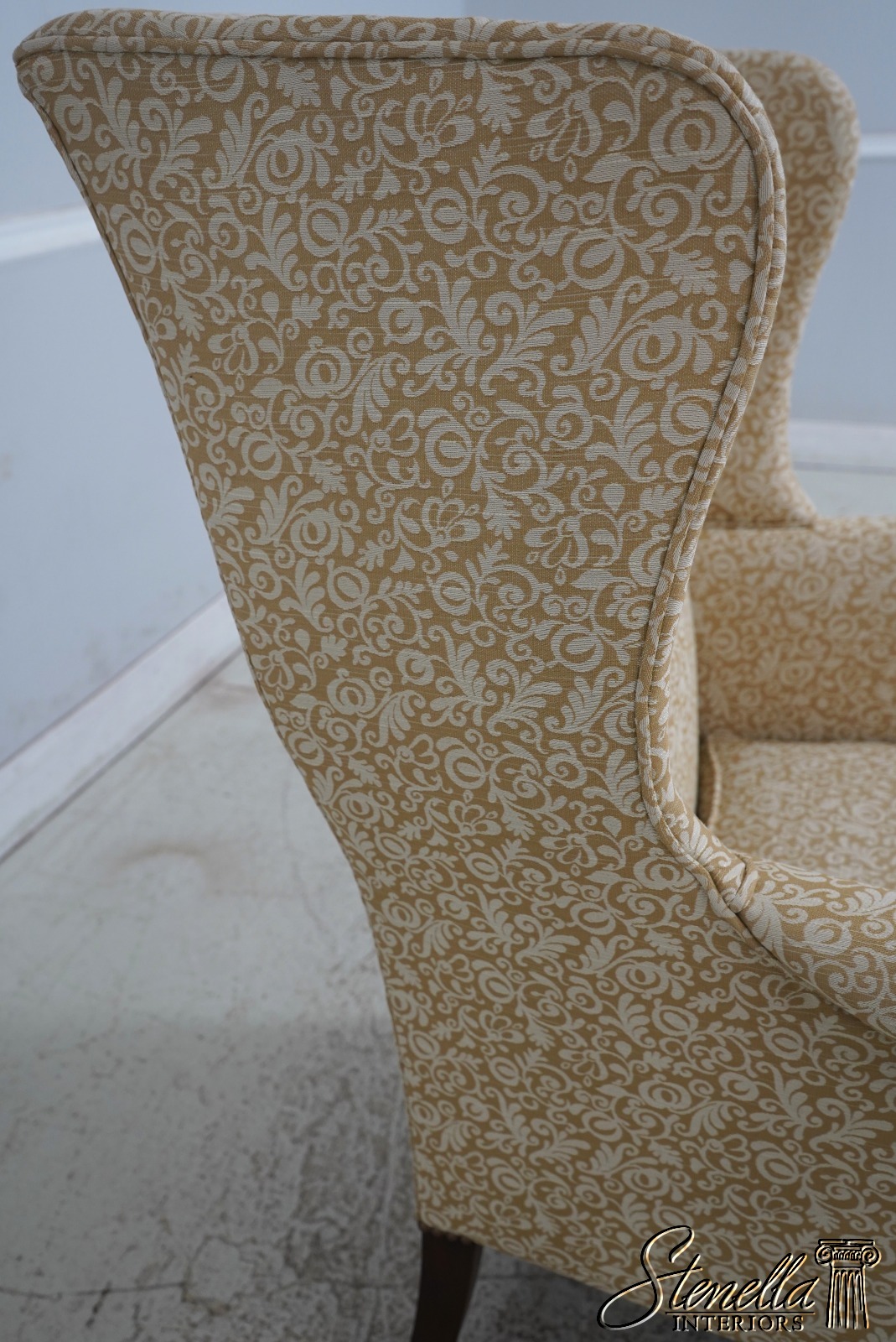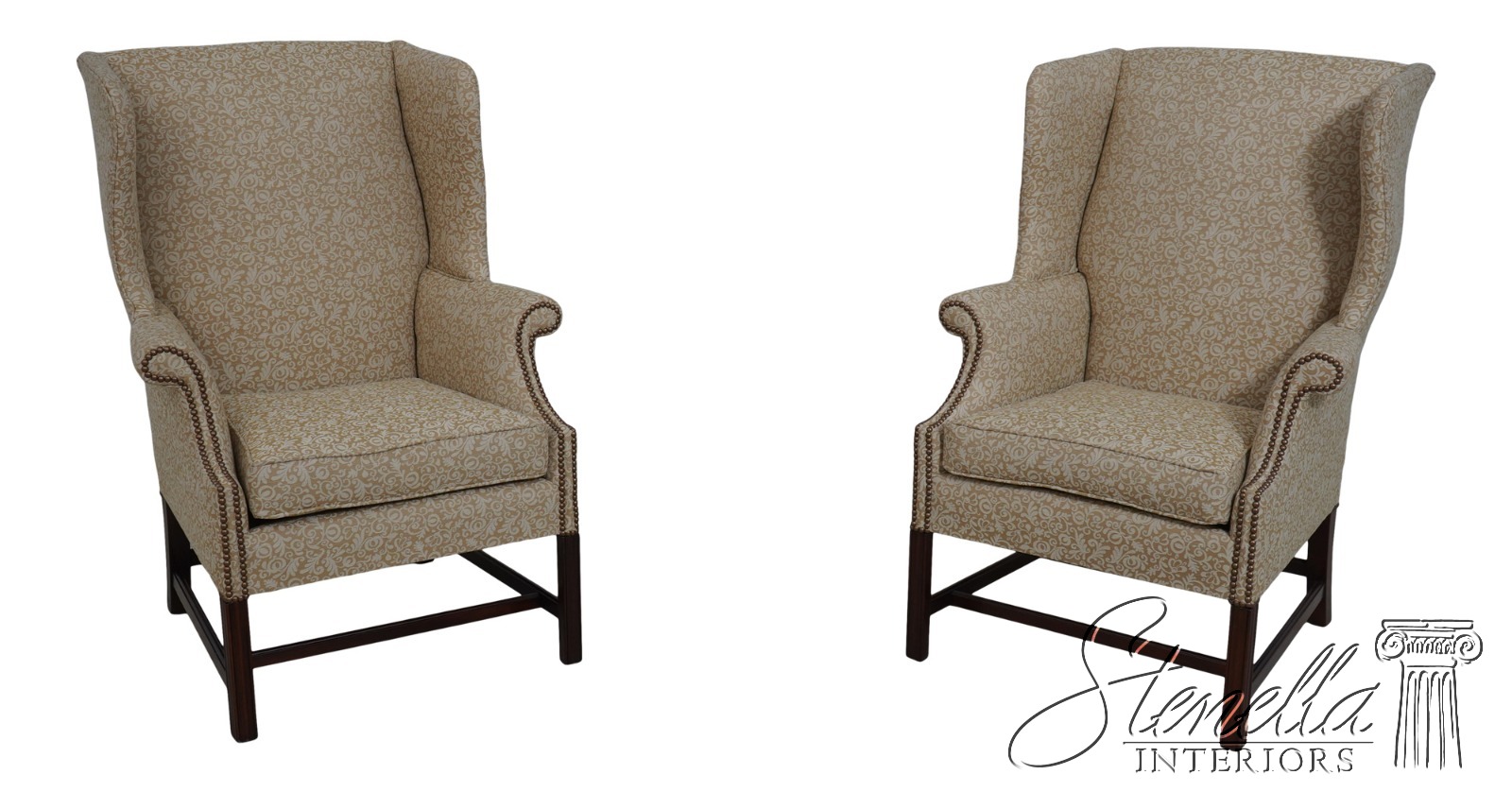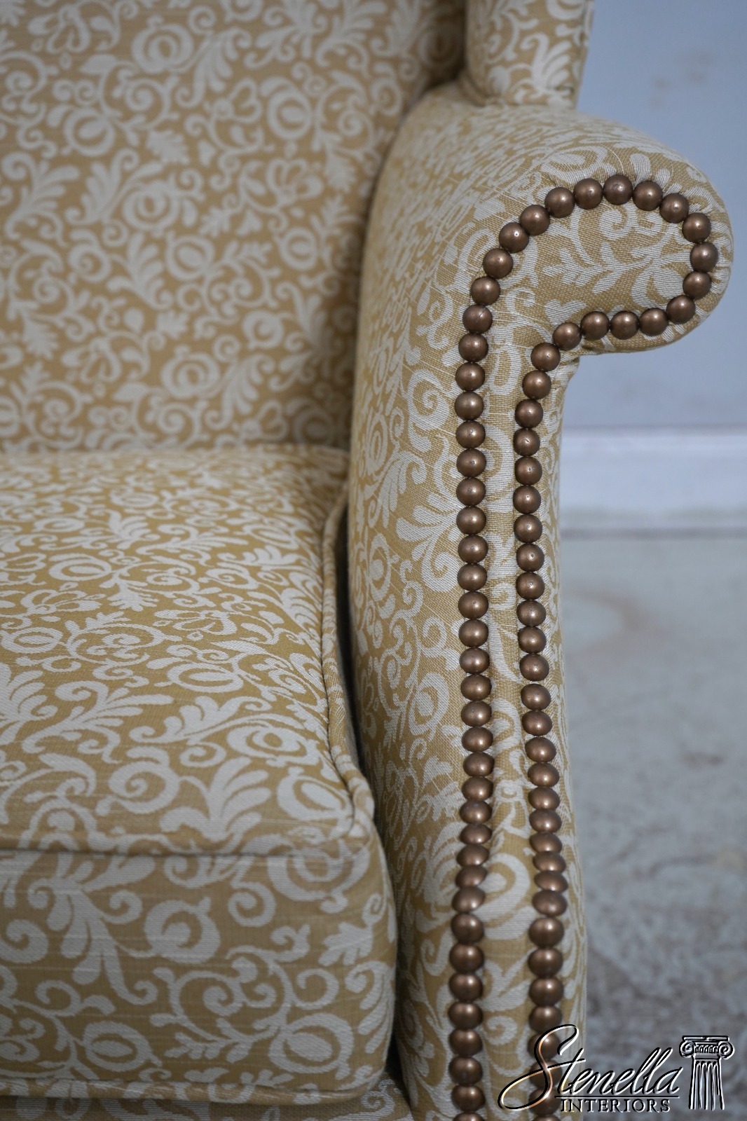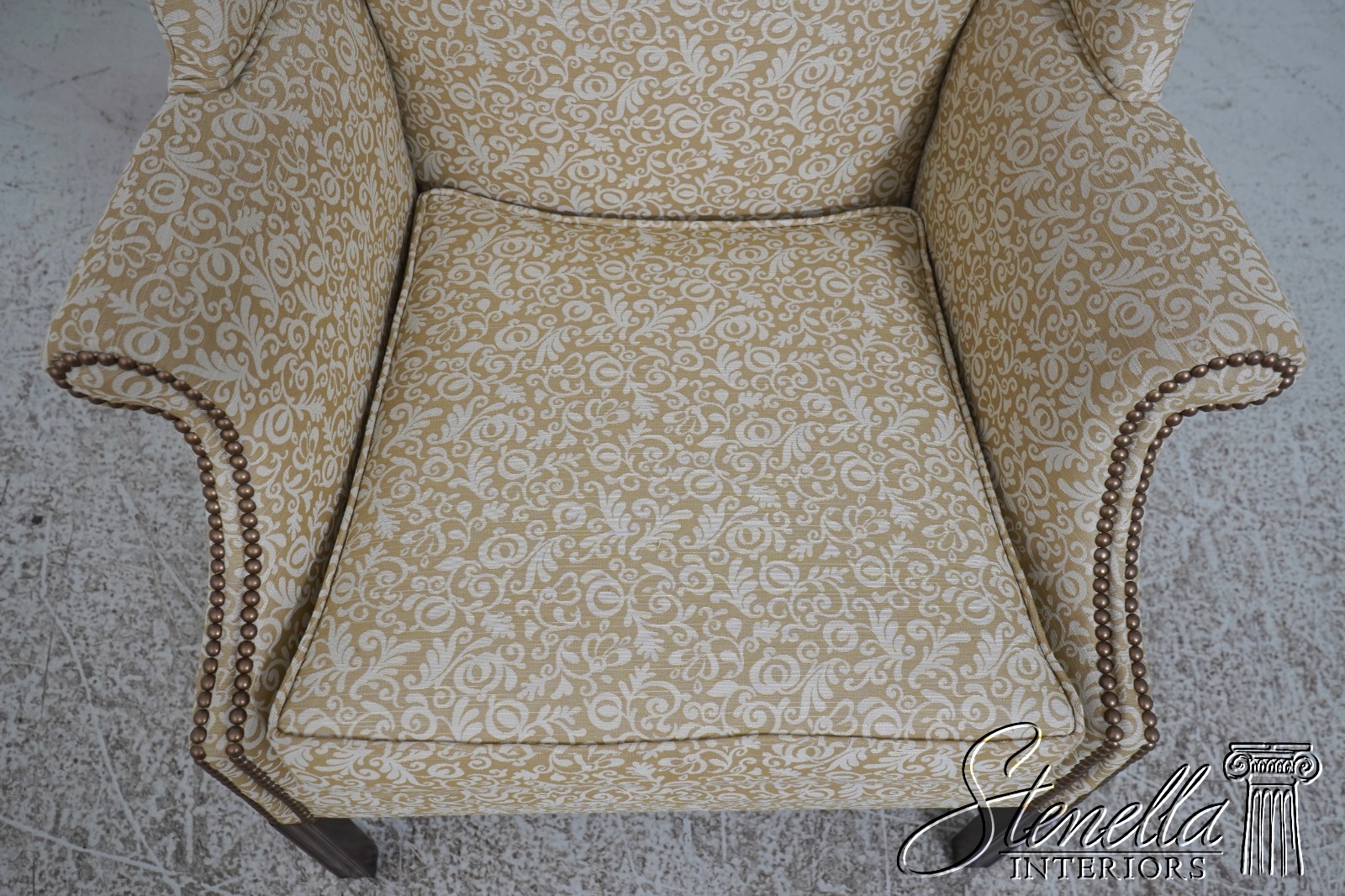 Details: High Quality Construction 18 C. Design Chippendale Style Stretcher Base Frame Tack Head Trim Professionally Reupholstered In Quality Damask Print Upholstery Offered @ Fraction Original Retail Cost