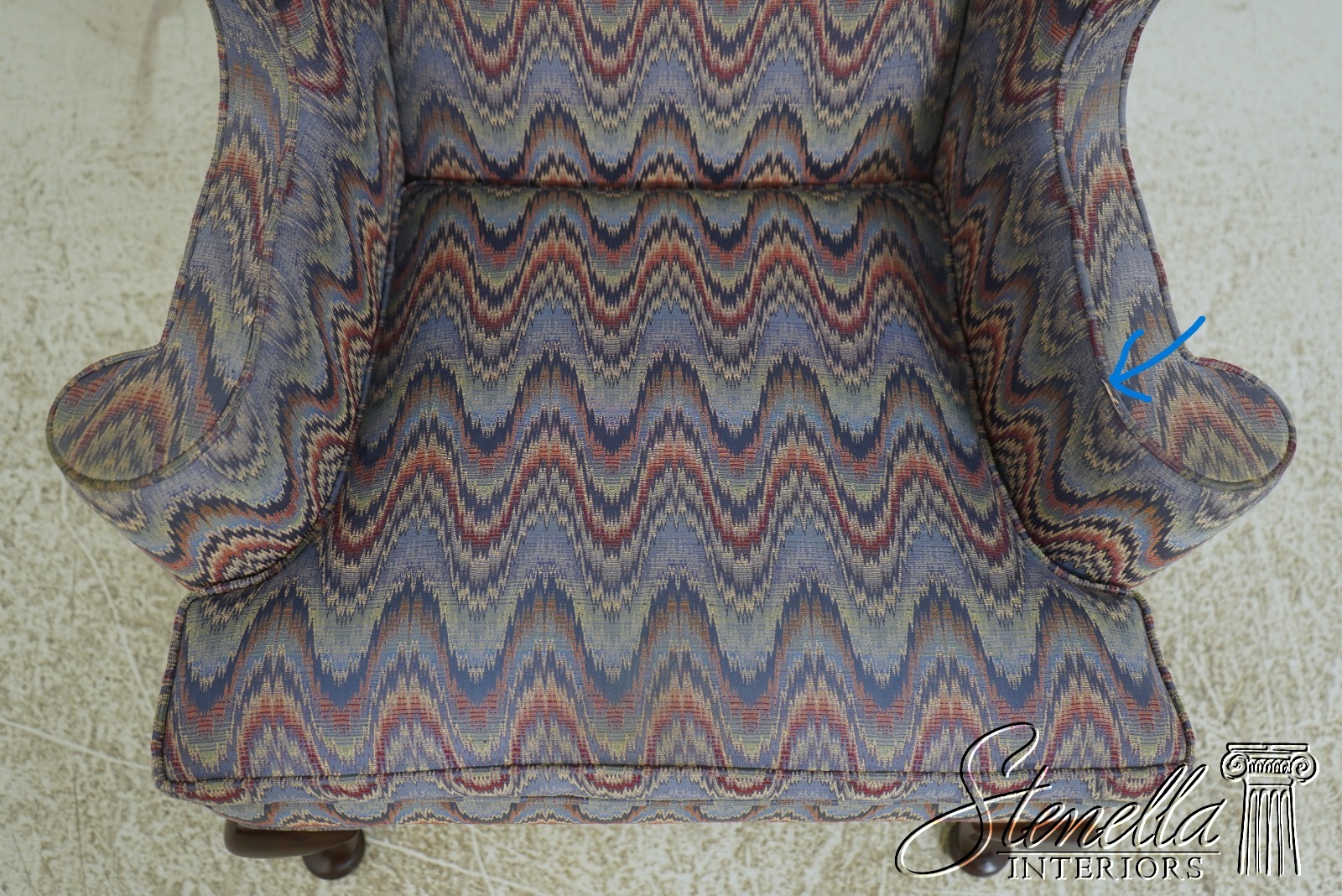 Sometimes upholstered items may show some wear or minor use. Or you may want to have recovered in different upholstery to match your decor’. Please feel free to contact us for information on having this or any of our items professionally re-upholstered in the fabric of your choice. We are able to make recommendations. Size: 30w x 30d x 45h Arm height: 26 Seat height: 20.5