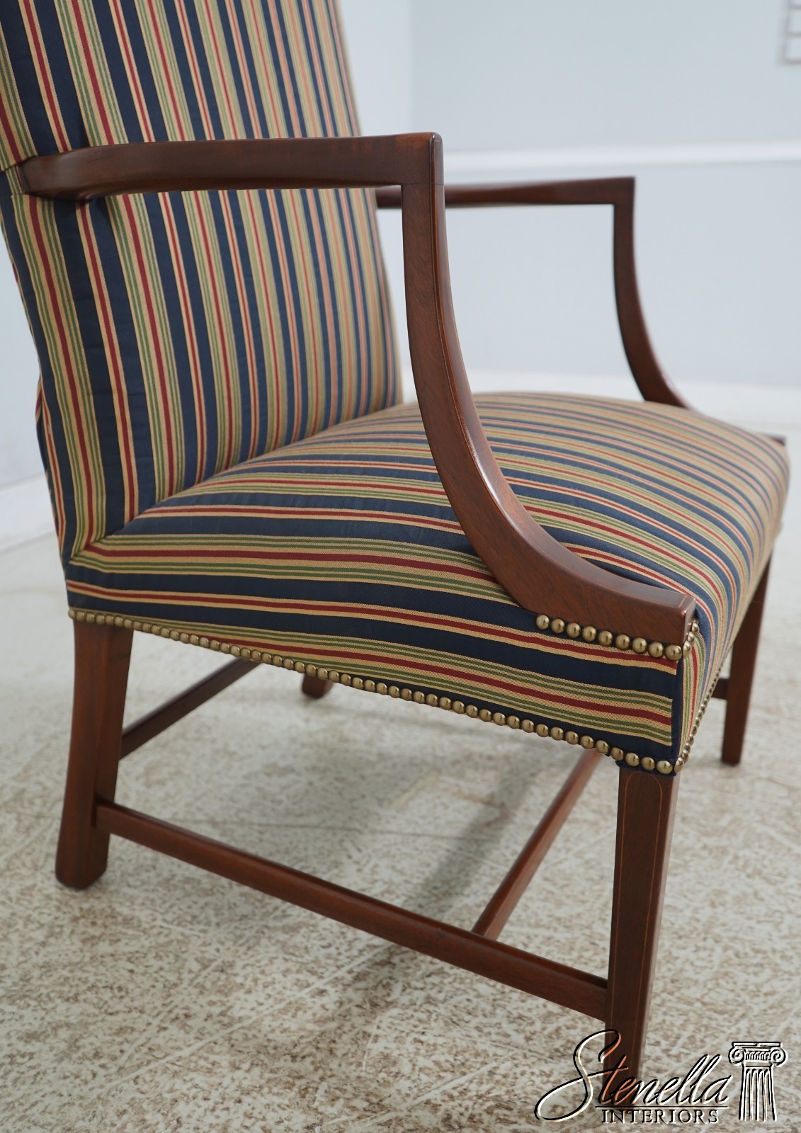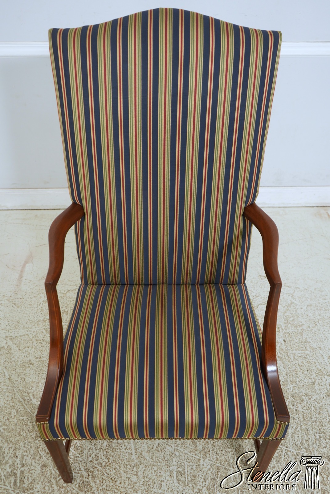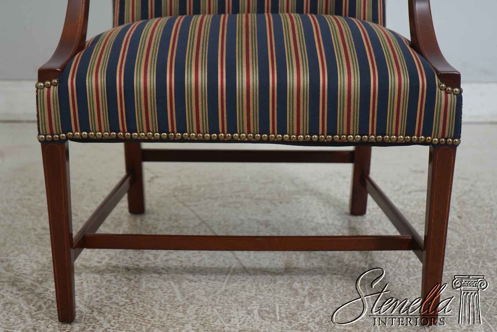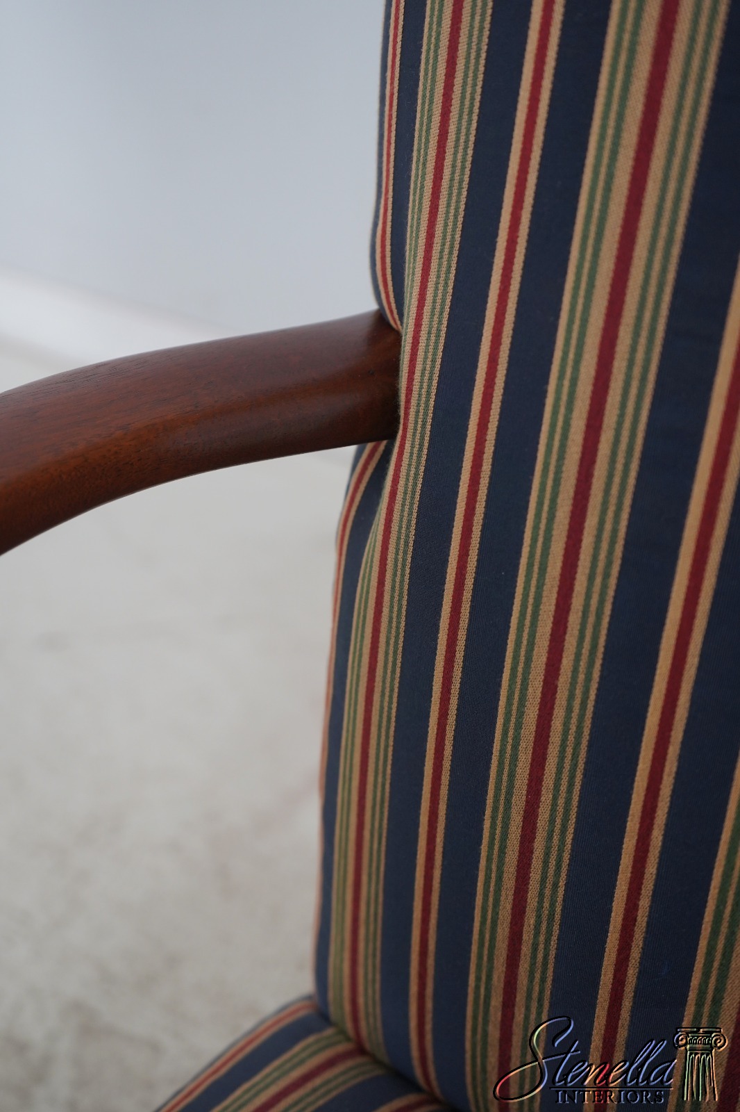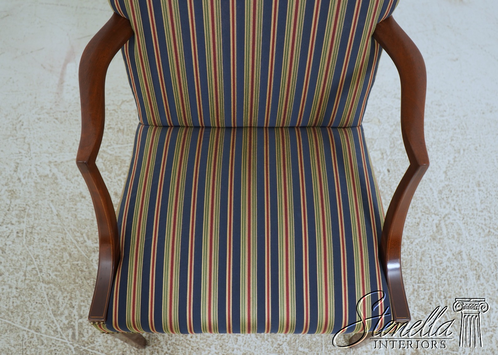 Details: Colonial Williamsburg CW-13 High Quality Construction Nice Inlay Work Professionally Reupholstered Approx. 2 Years Ago In Quality Striped Upholstery