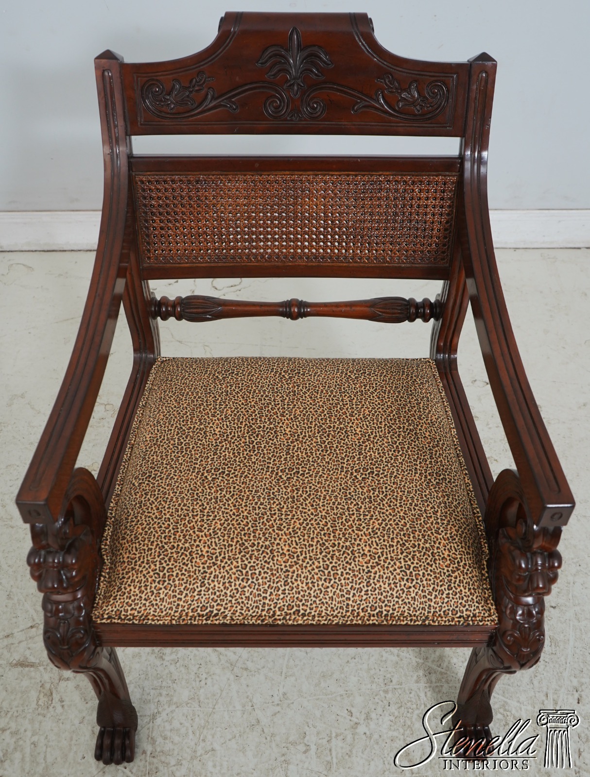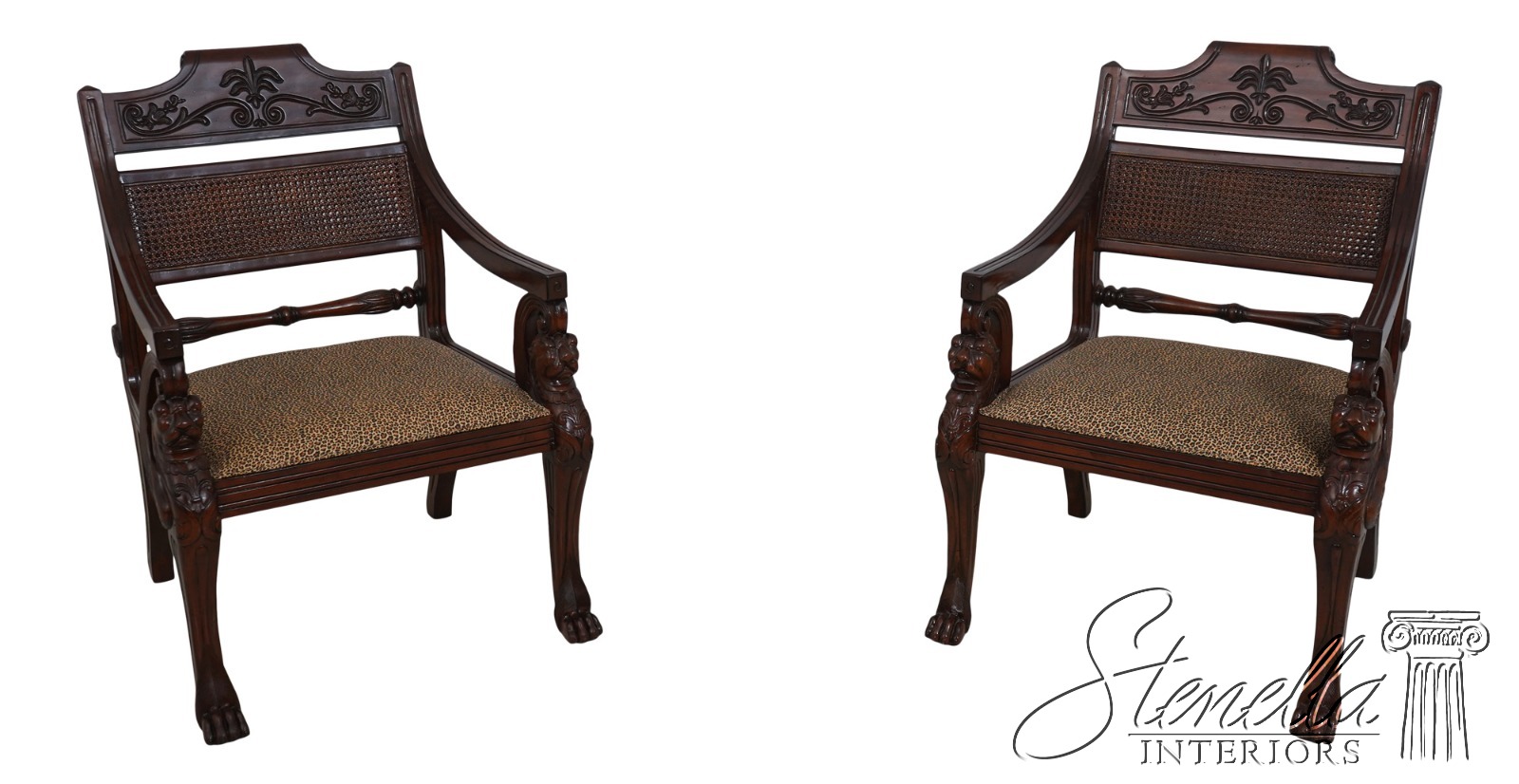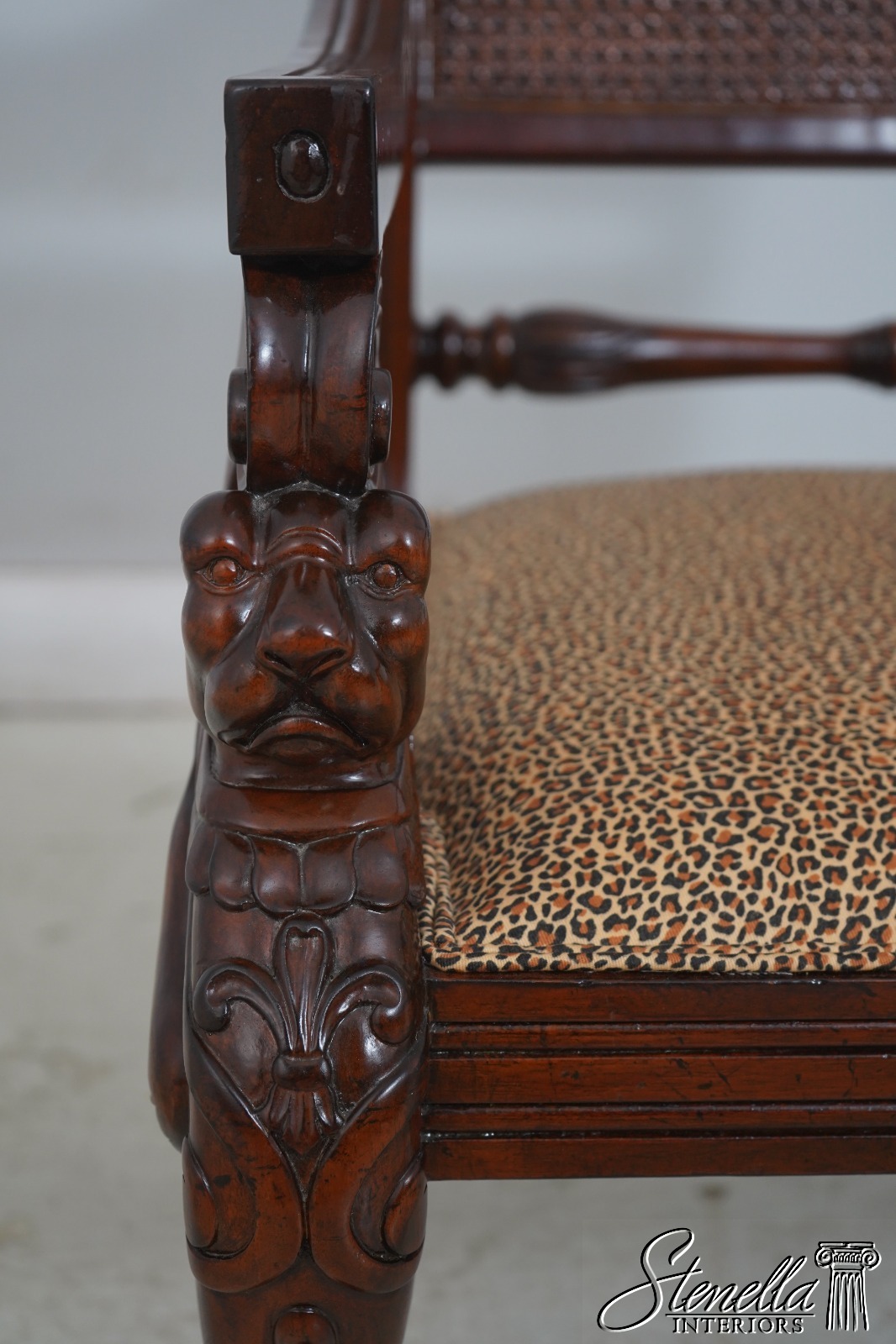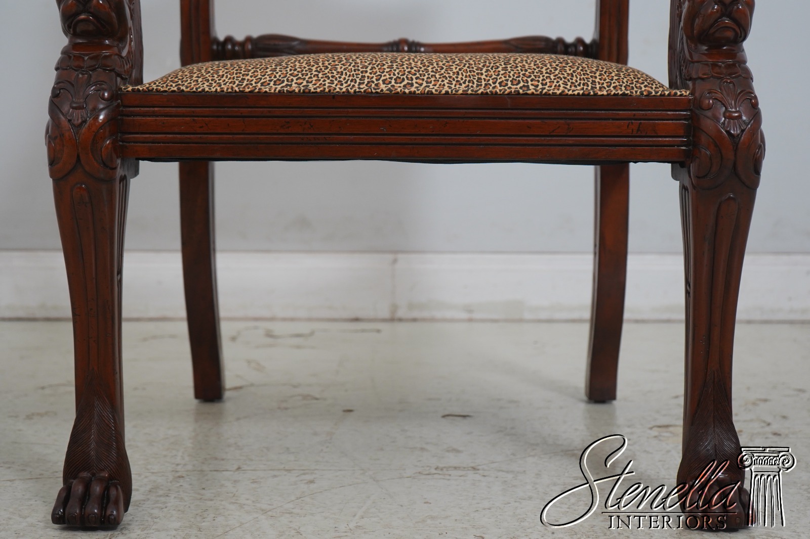 Details: Factory Distressed Solid Mahogany Cane Backs Nice Carved Details Quality Construction Large Impressive Chairs Brand New Cheetah Print Upholstery Lion Head Carved Arms & Paw Feet Offered @ Fraction Original Retail Cost