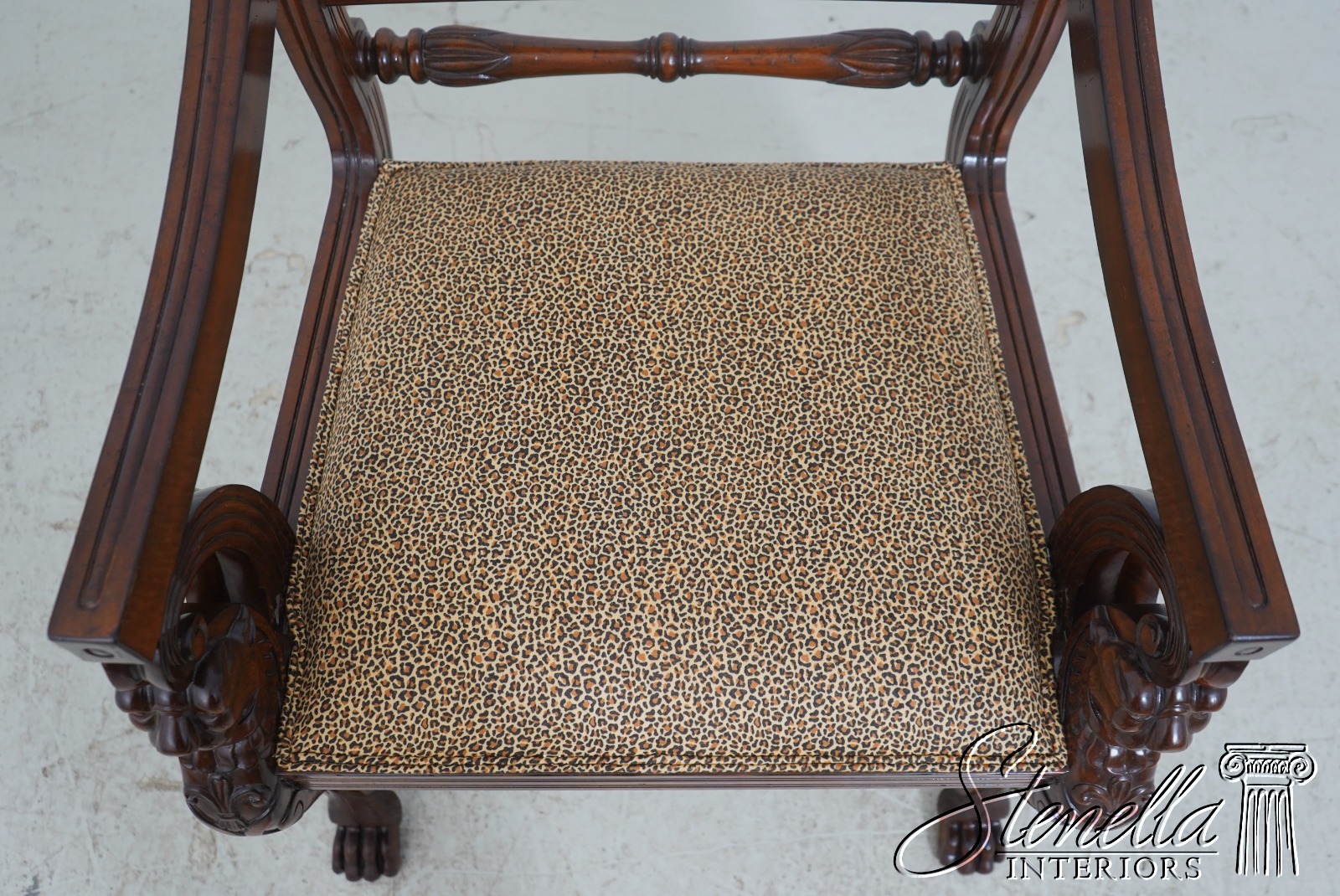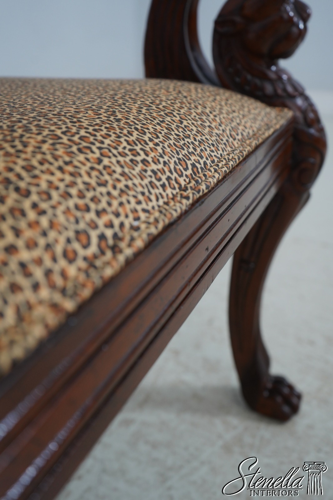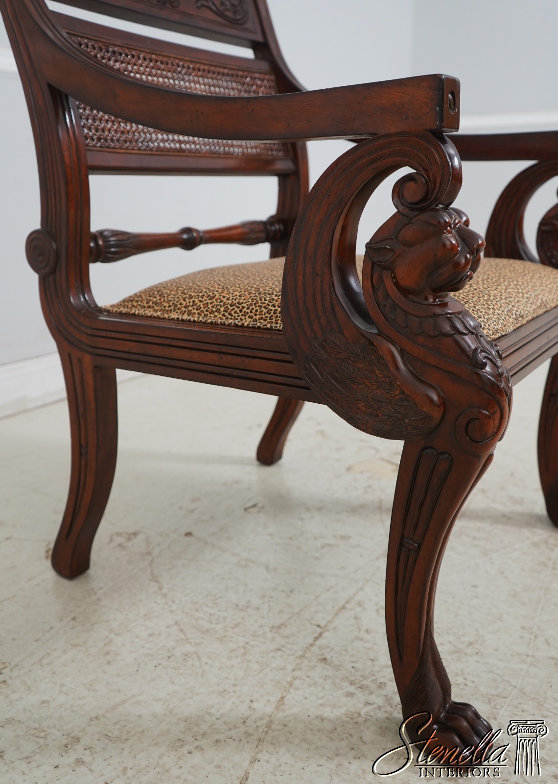 Details: Factory Distressed Solid Mahogany Cane Backs Nice Carved Details Quality Construction Large Impressive Chairs Brand New Cheetah Print Upholstery Lion Head Carved Arms & Paw Feet Offered @ Fraction Original Retail Cost