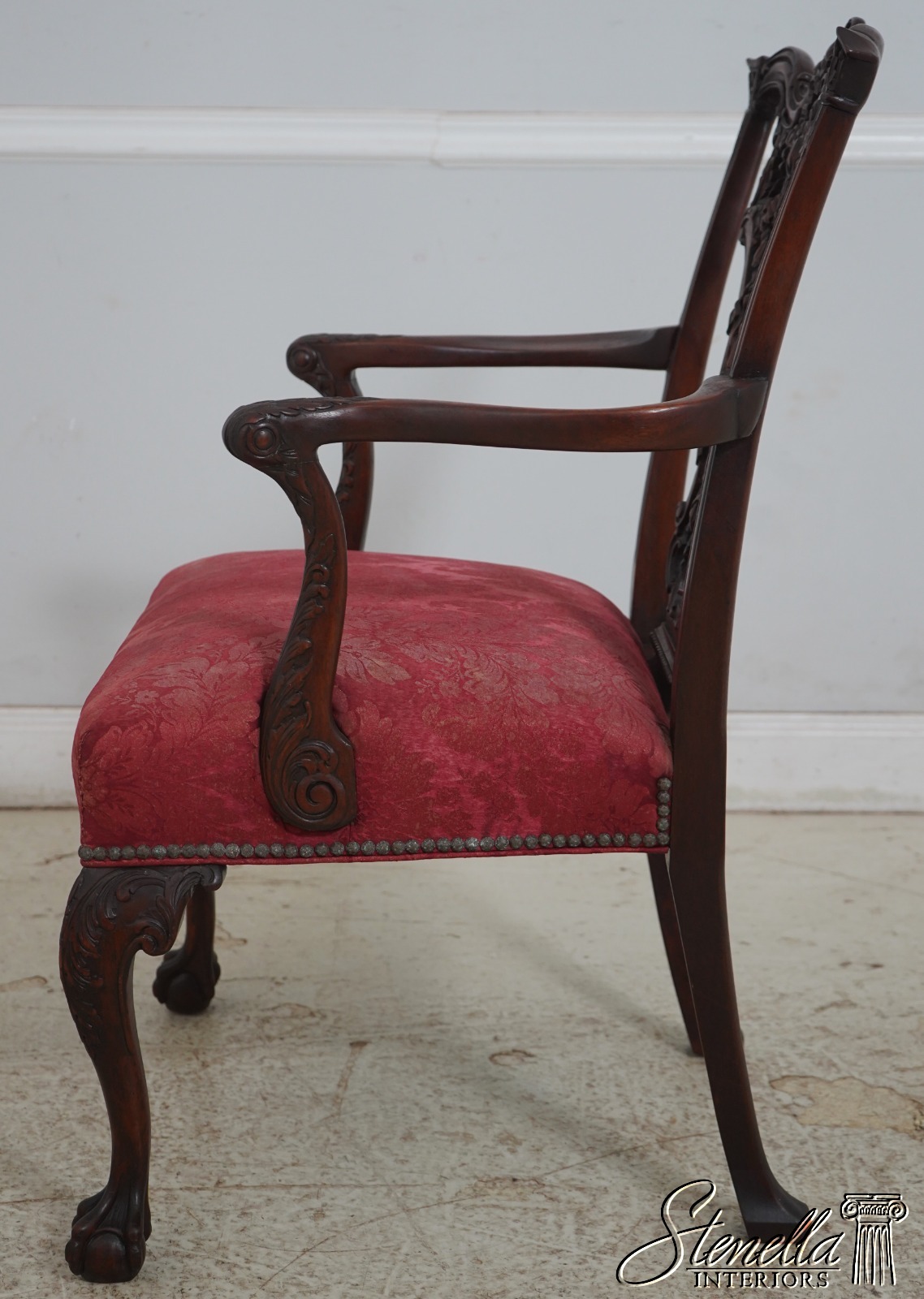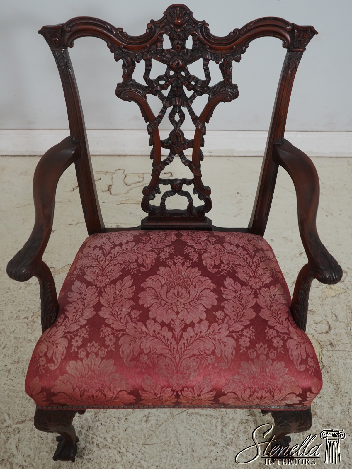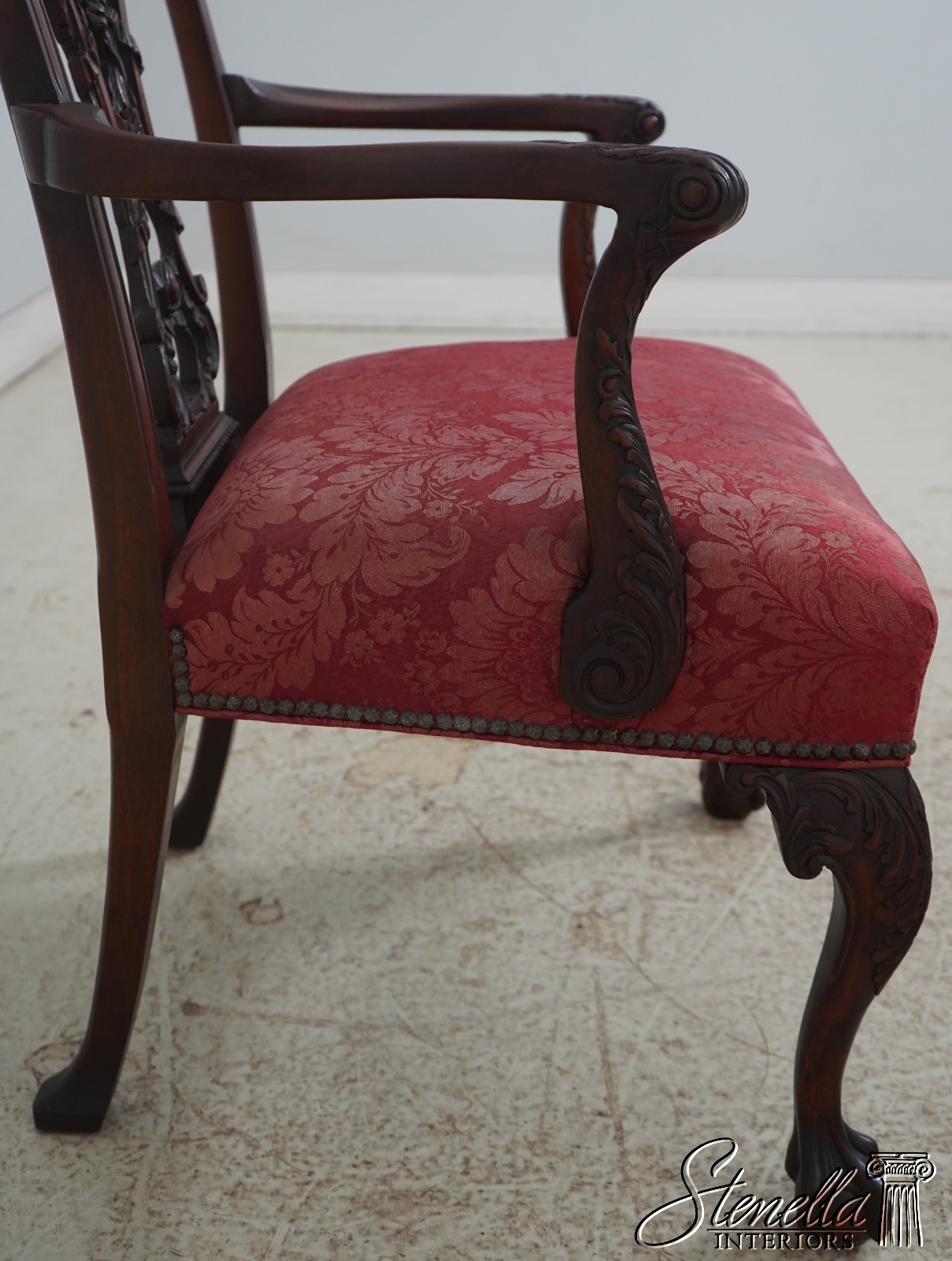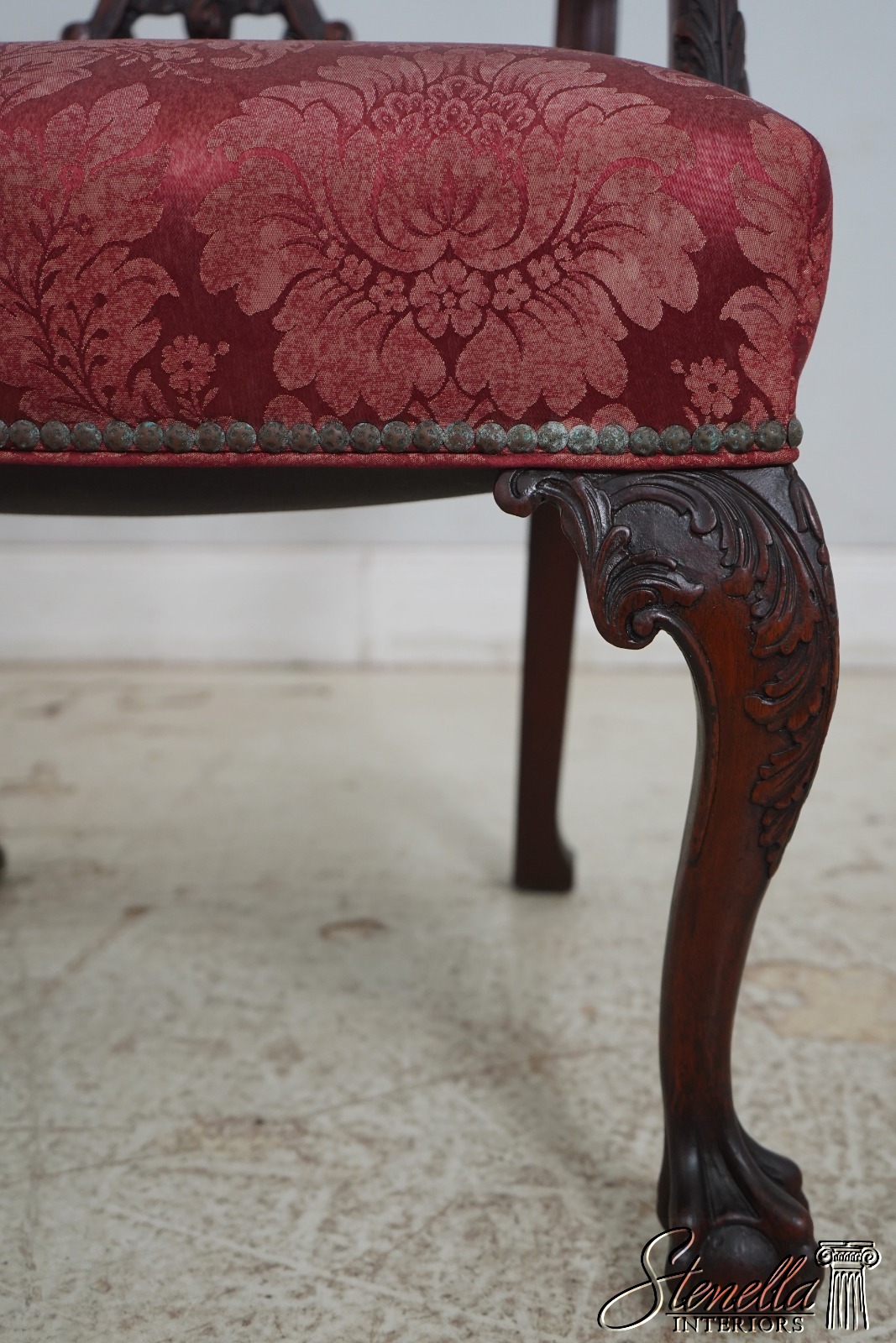Details: Mahogany Ornate Carved Details Ball & Claw Feet Fine Carved Details High Quality Construction Chippendale Style English Style Tack Head Trim Ribbon Backsplat Chinese Chippendale Style Scroll Arms Cabriole Legs Un-Marked As To Manufacture Offered @ Fraction Original Retail Cost