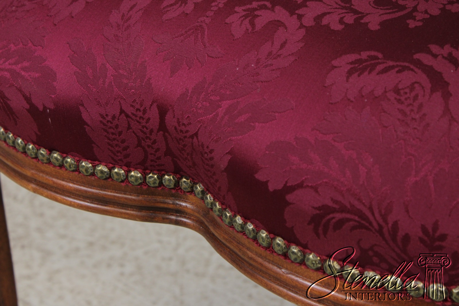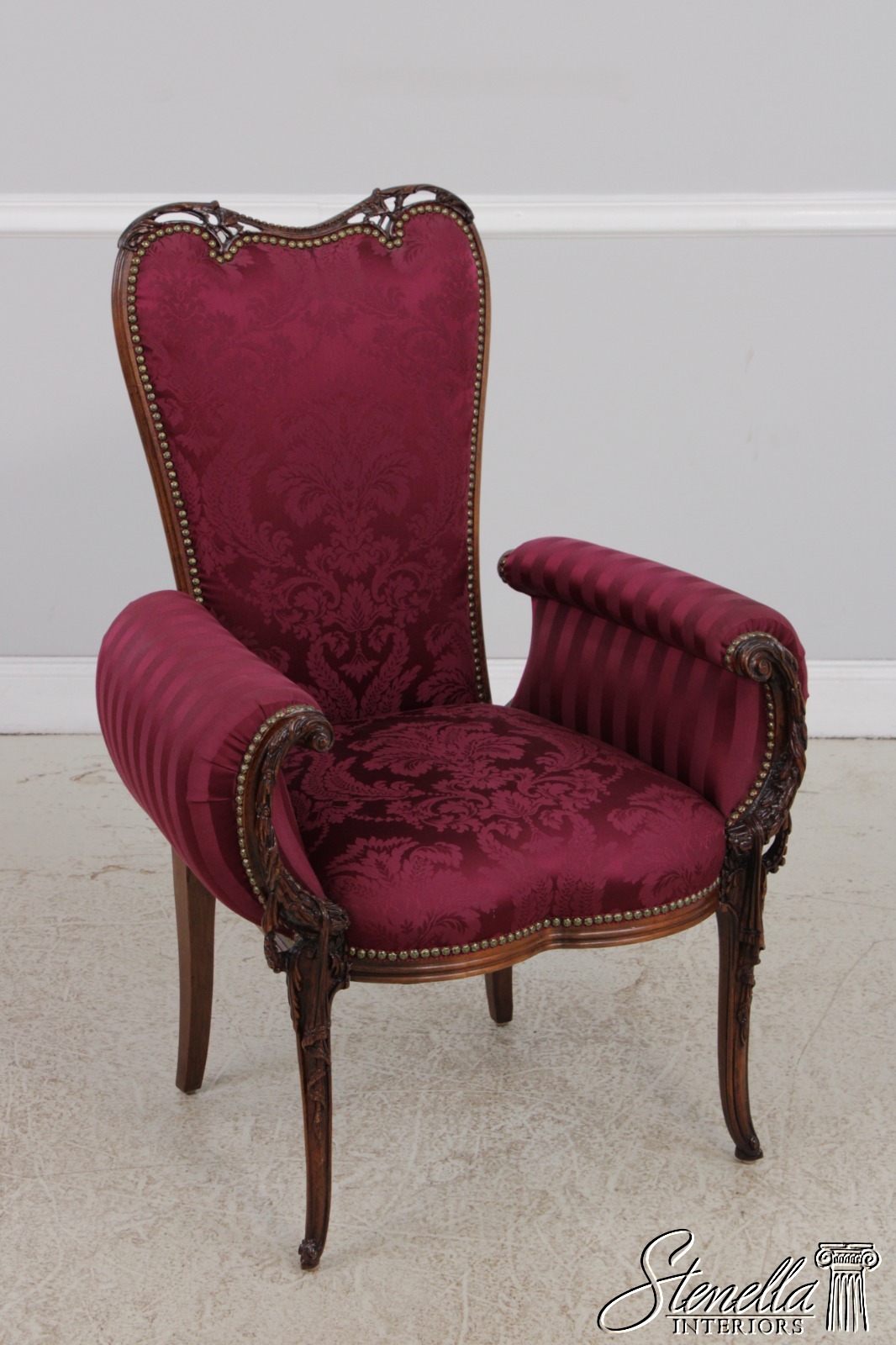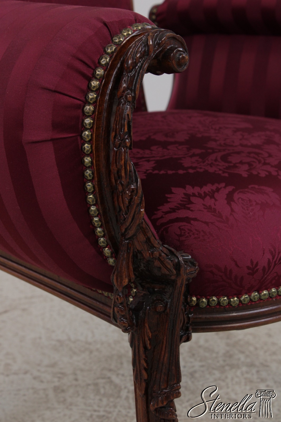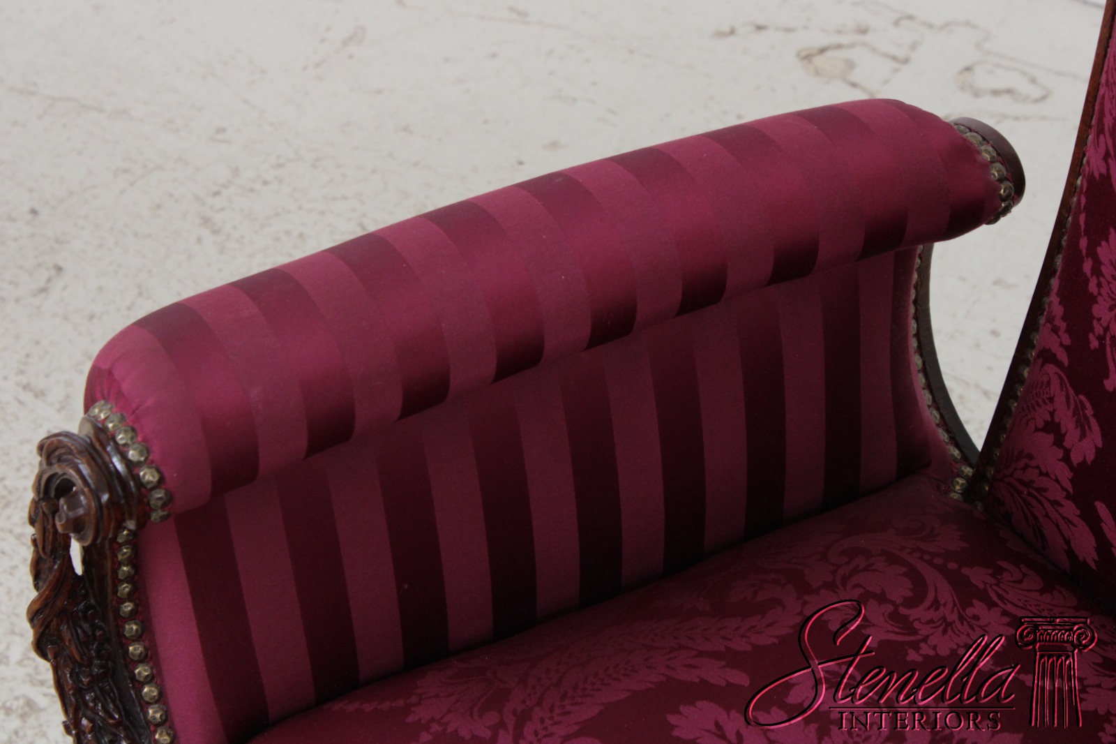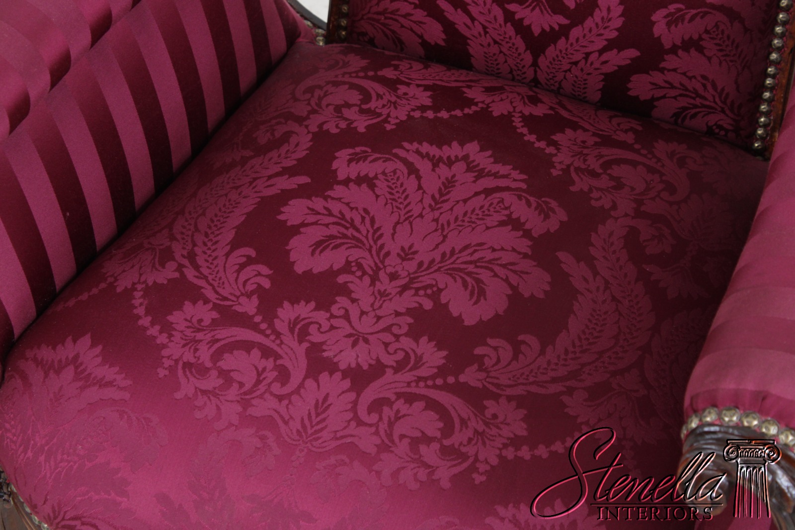 Details: Mahogany Fine Carved Details High Quality Construction Queen Anne Legs & Pad Feet French Style Stunning Damask & Striped Upholstery Floral Motif Tack Head Trim Curved Scroll Arms Saber Legs Professionally Reupholstered Approx. 3 Years Ago Offered @ Fraction Original Retail Cost