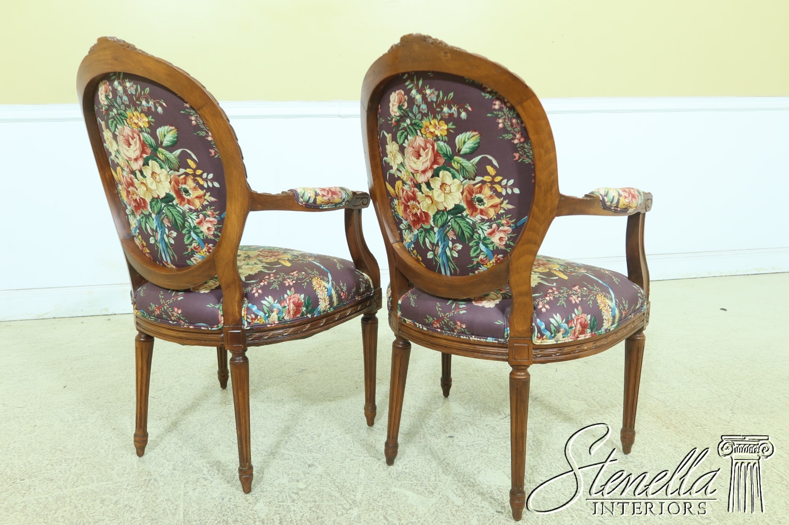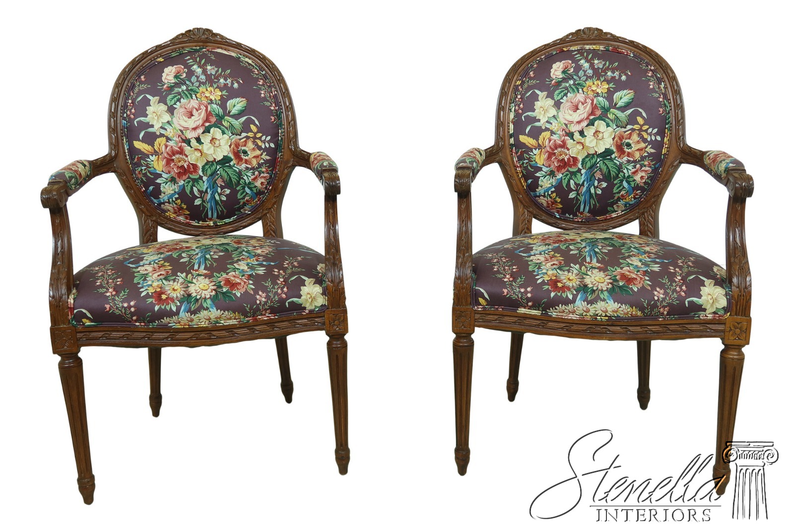 F33324EC: Pair French Louis XV Style Floral Upholstered Armchairs
