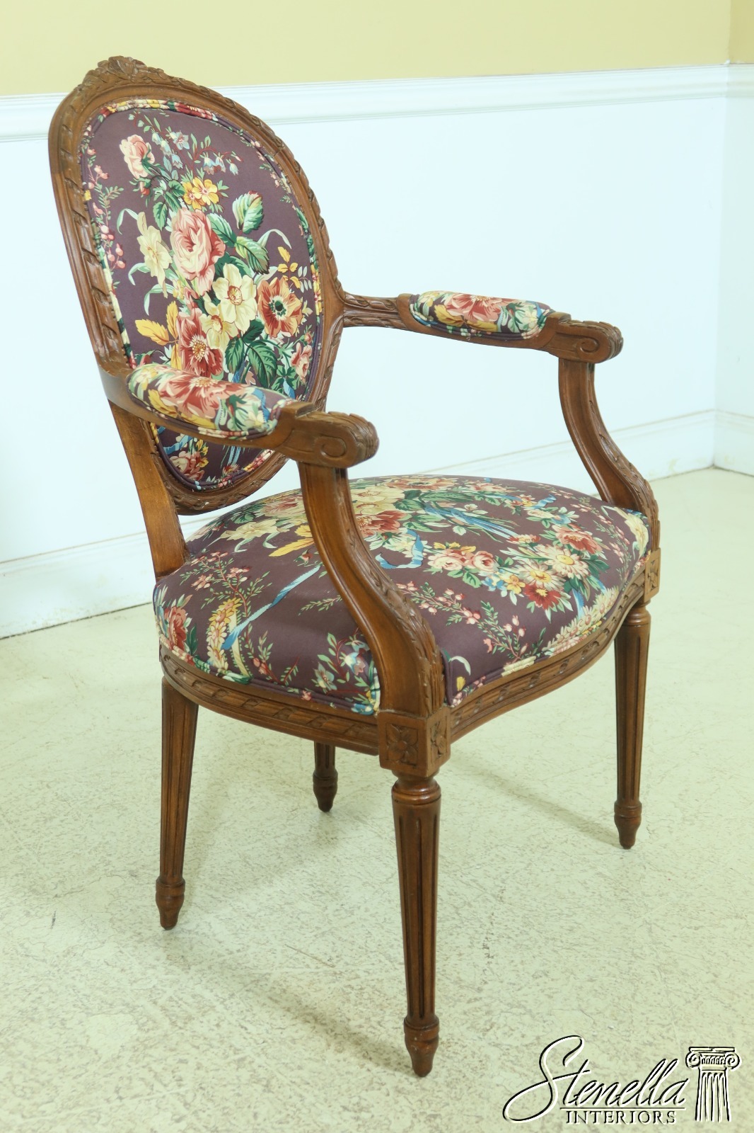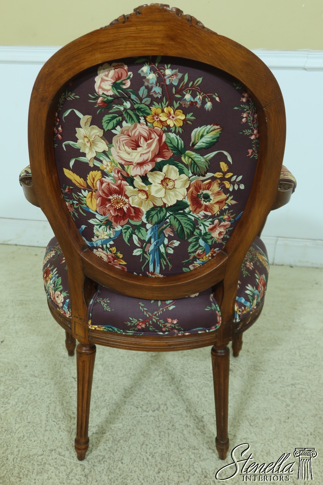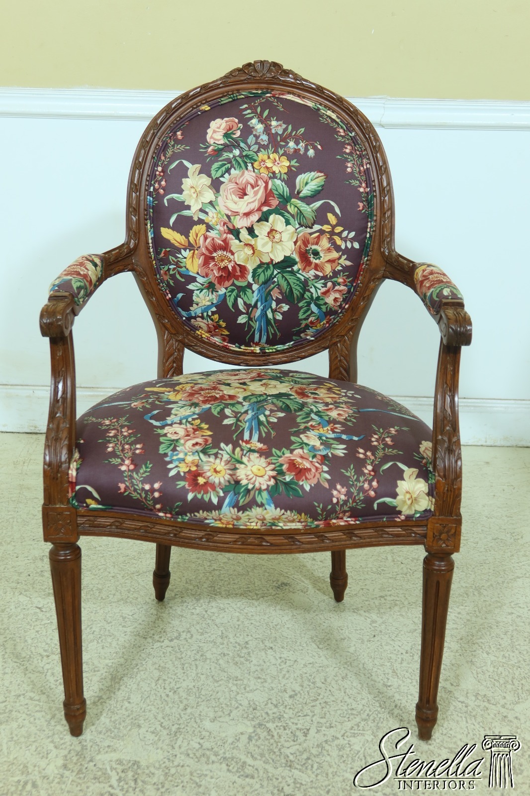 Details: Carved Details 18 C. Design French Style Floral Upholstery Medallion Back Walnut Finish
