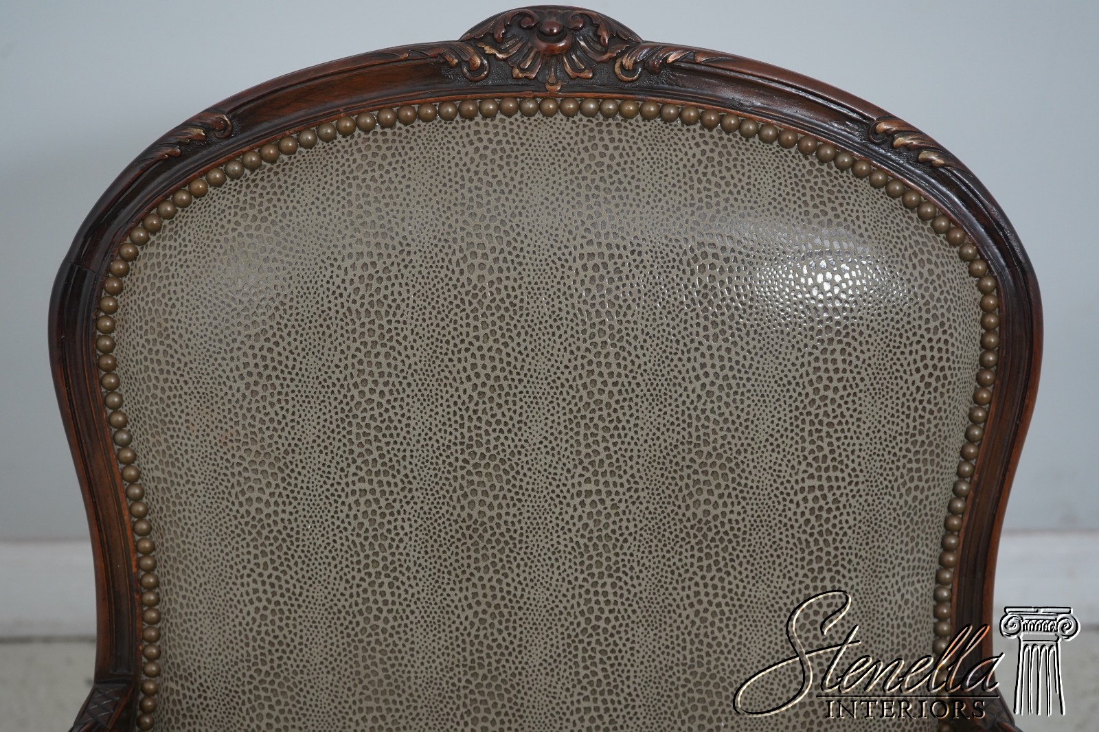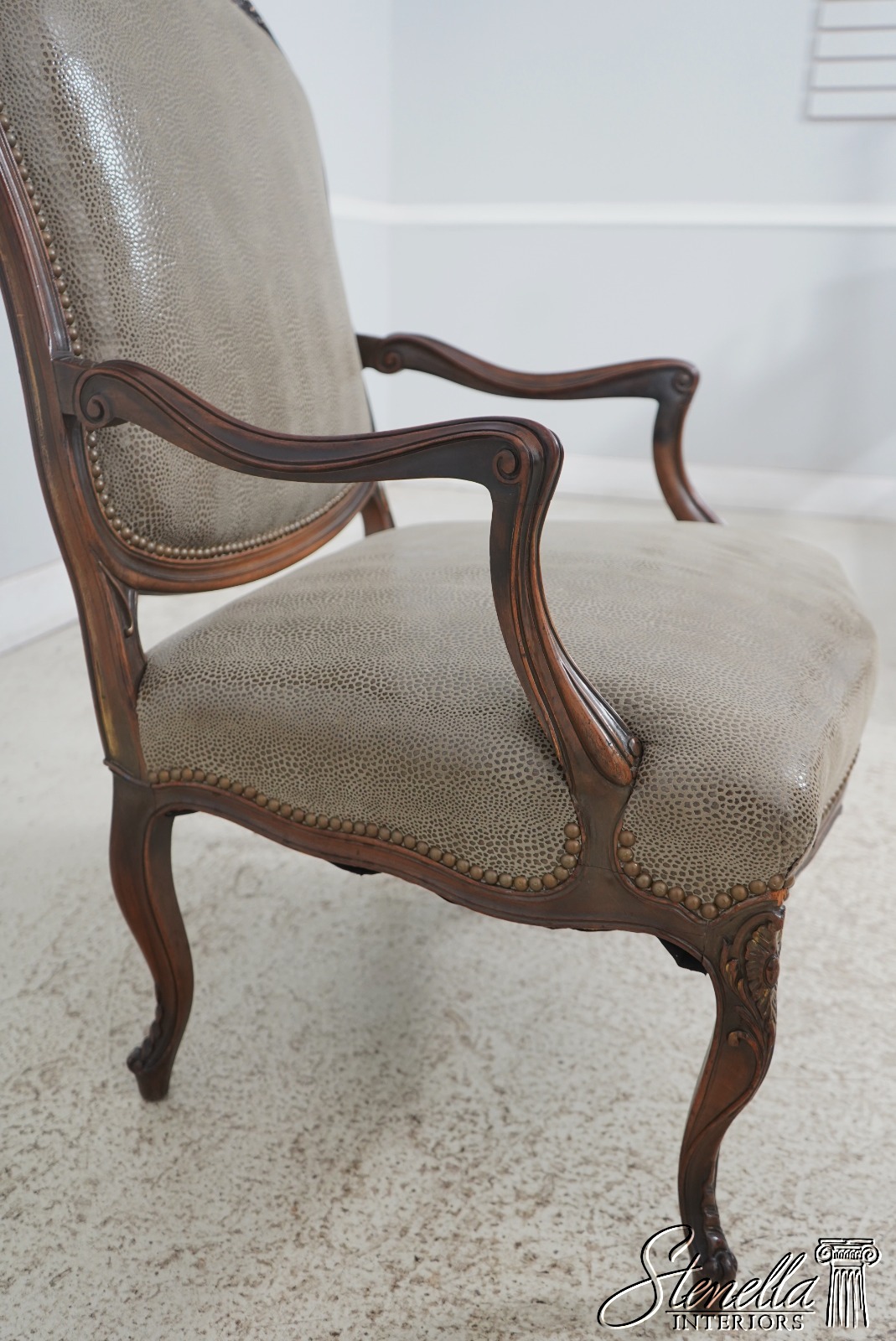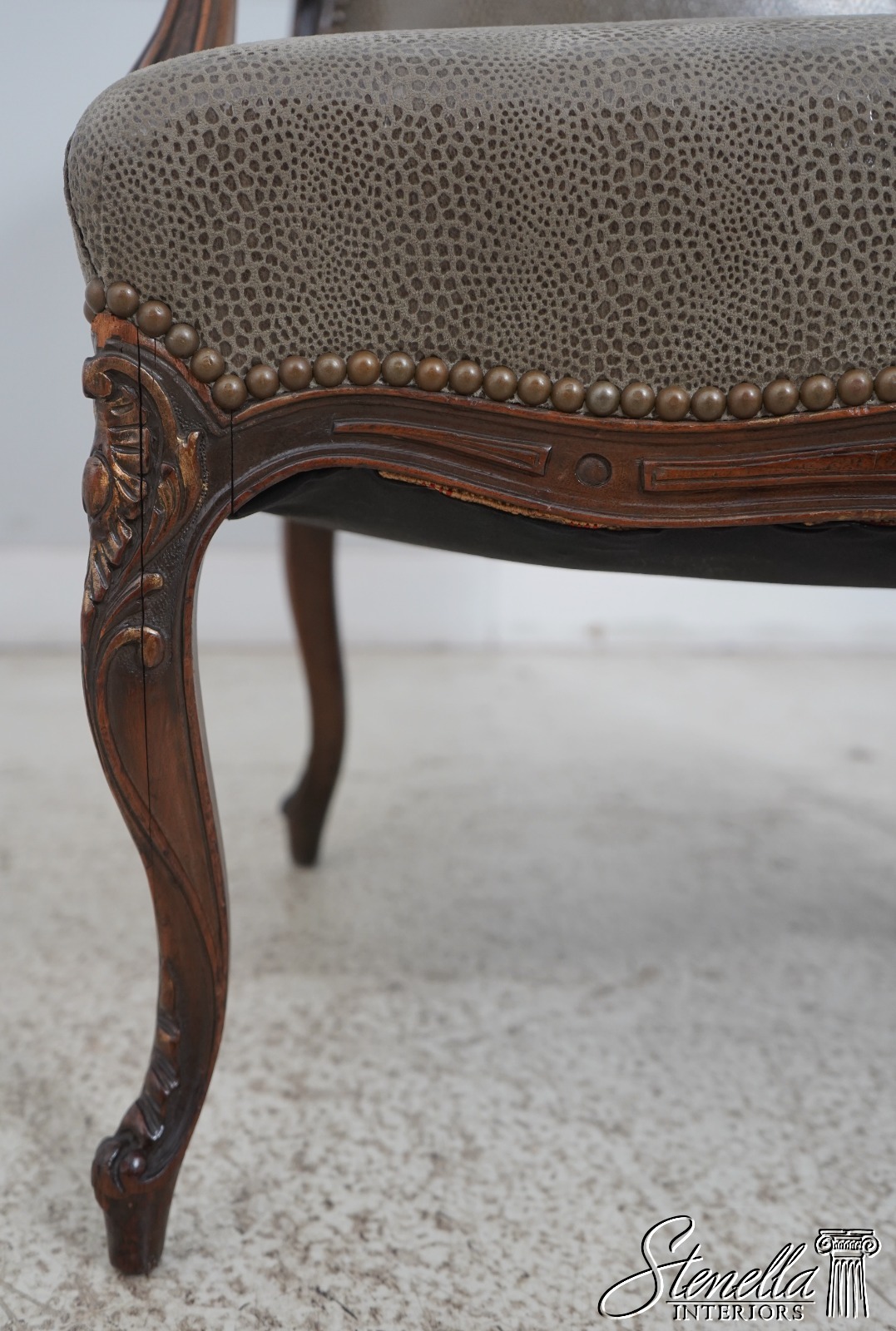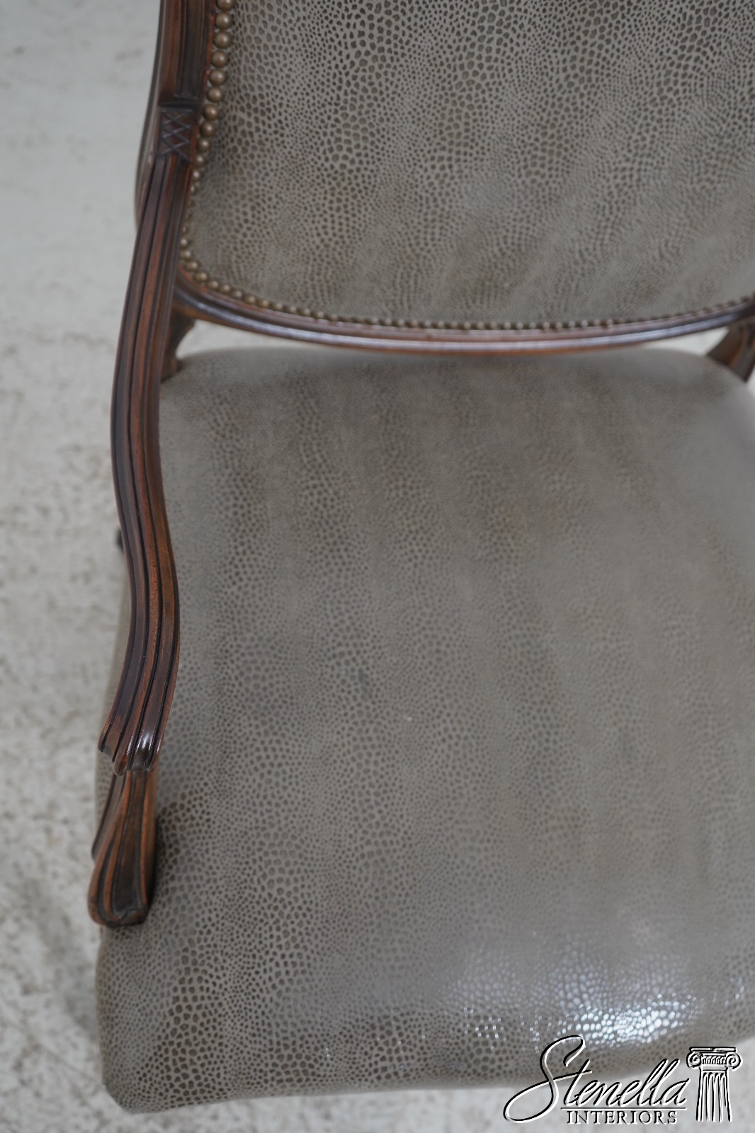 Details: Fine Carved Details High Quality Construction French Style Textured Snake Skin Print Leather Professionally Reupholstered Approx. 10 Years Ago Tack Head Trim Vintage French Style Chair