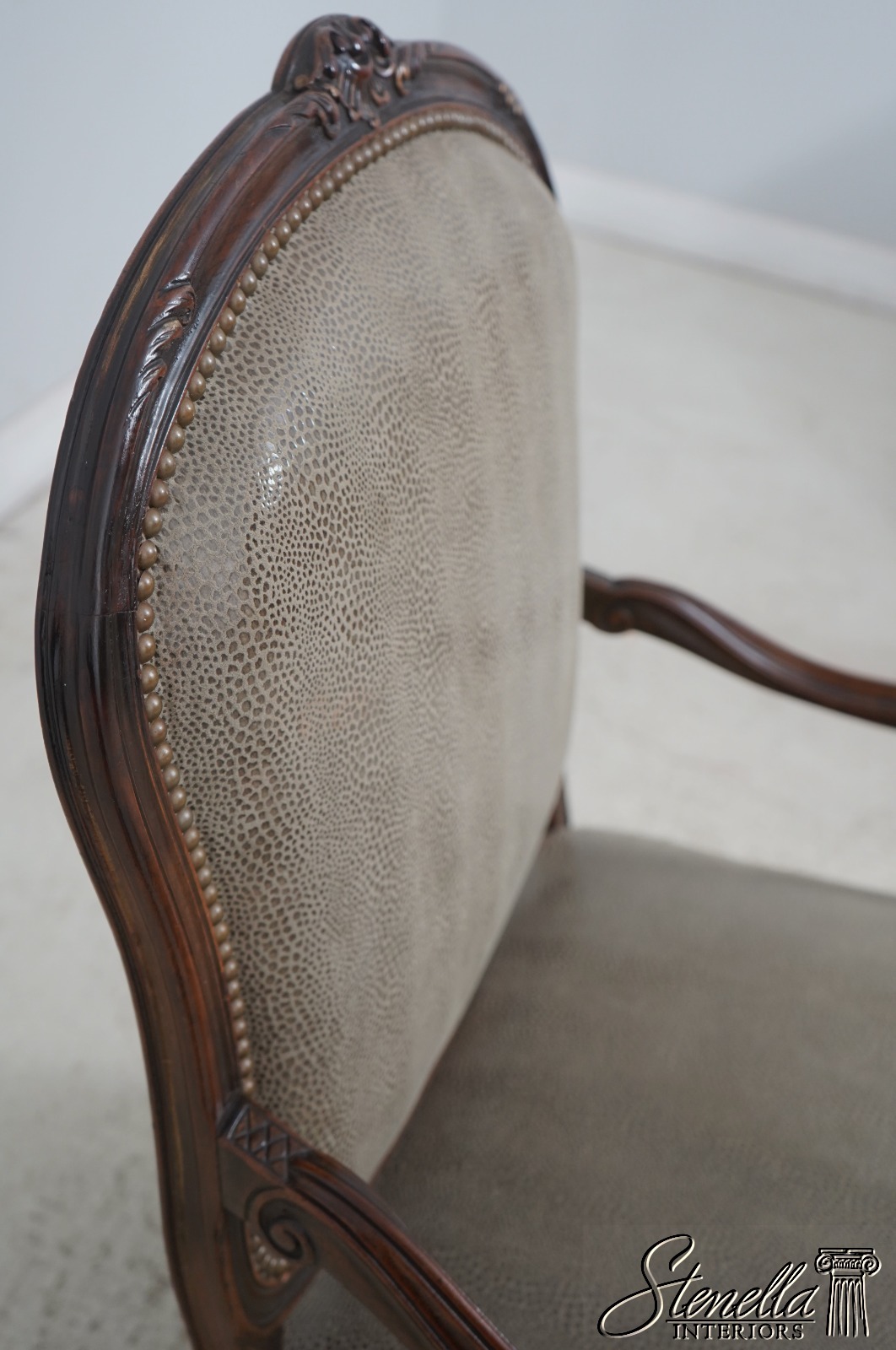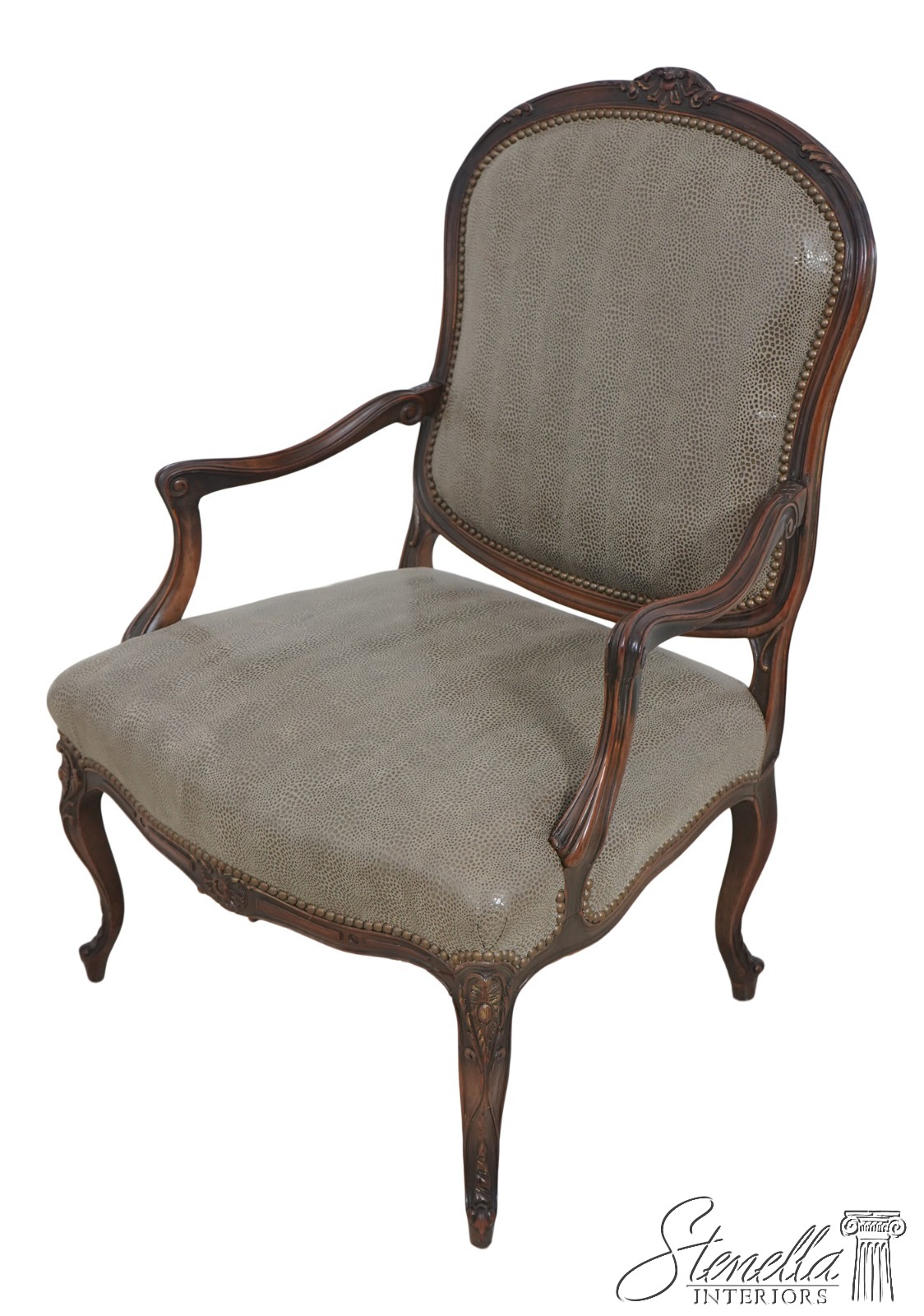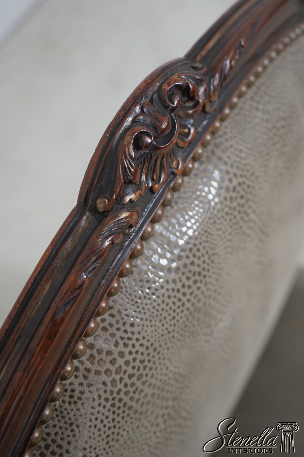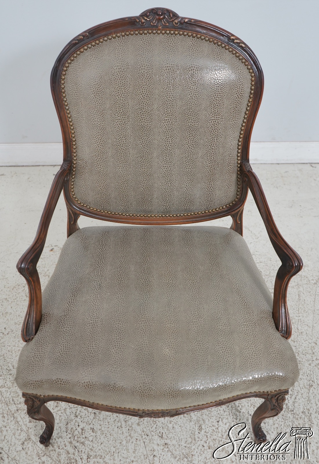 Details: Fine Carved Details High Quality Construction French Style Textured Snake Skin Print Leather Professionally Reupholstered Approx. 10 Years Ago Tack Head Trim Vintage French Style Chair