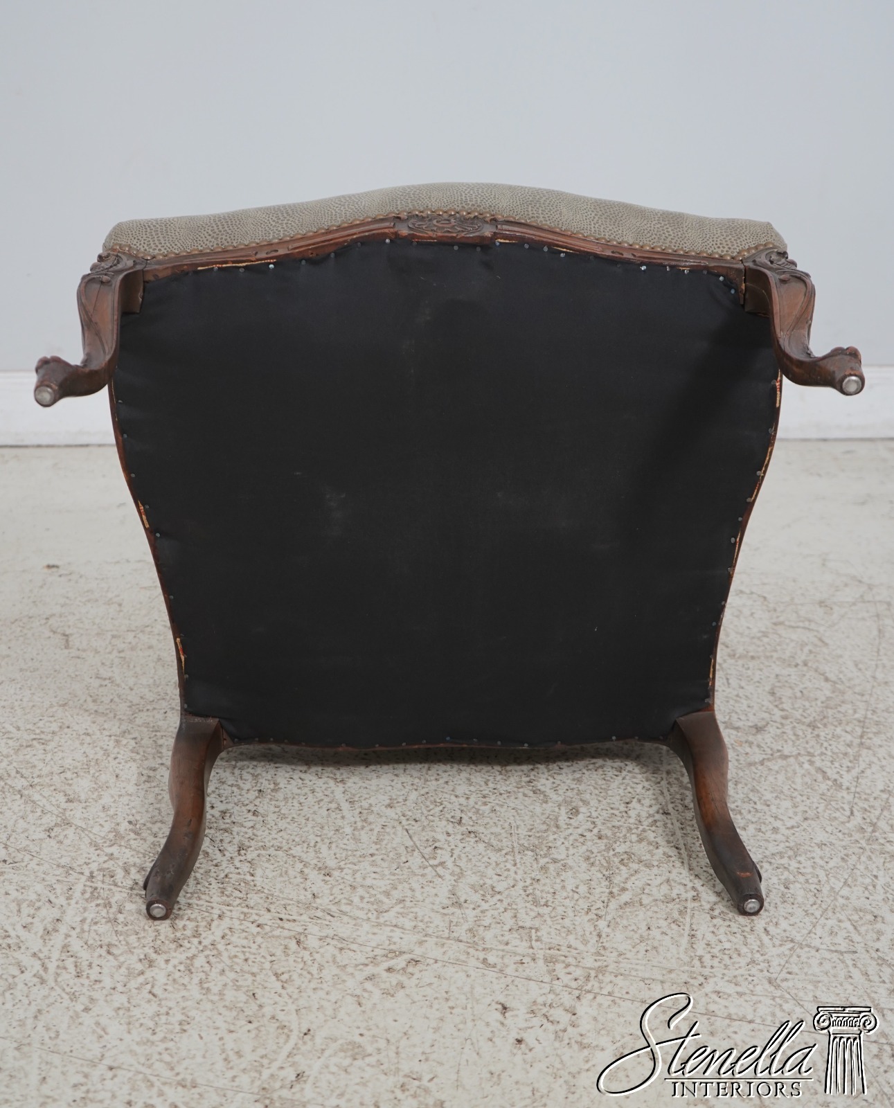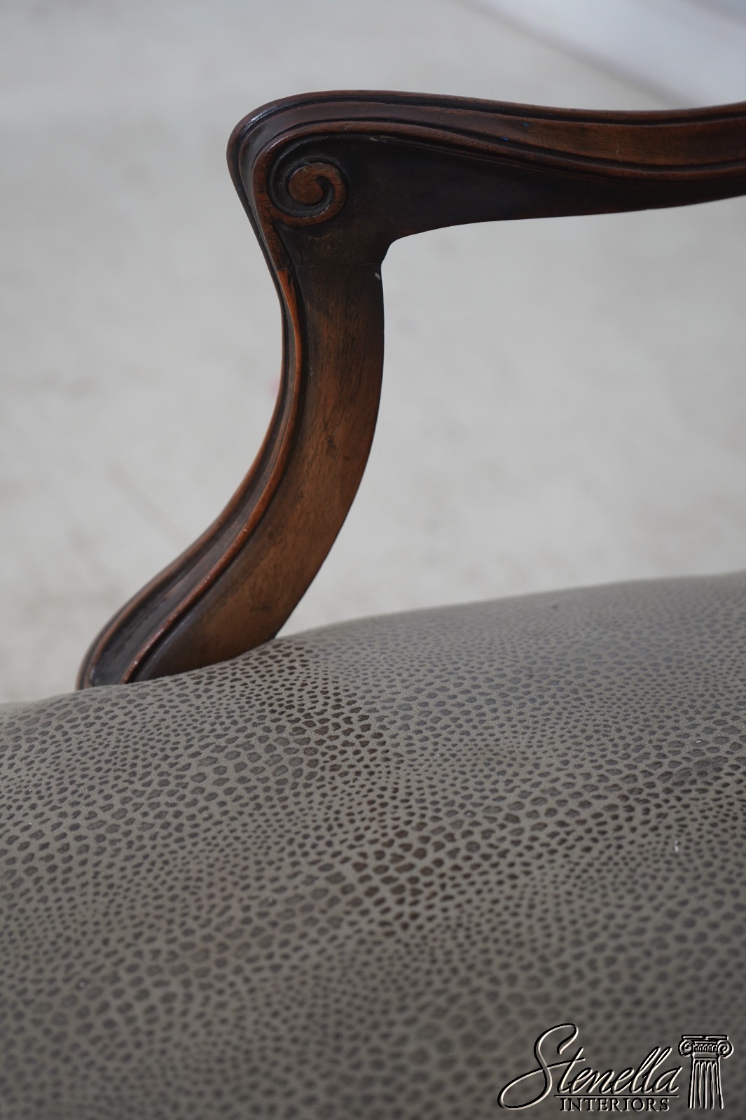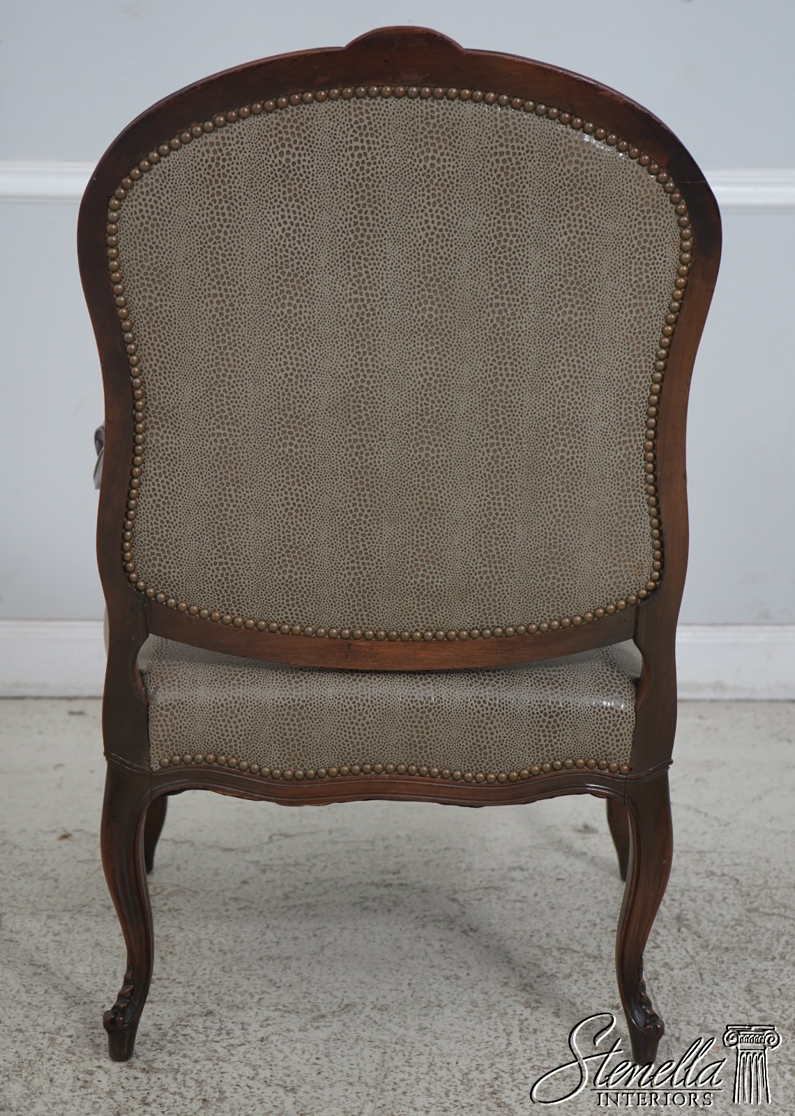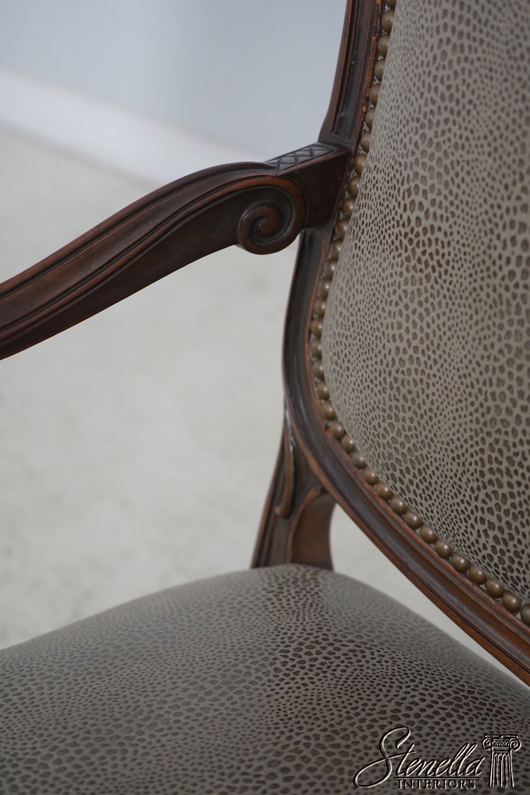 Details: Fine Carved Details High Quality Construction French Style Textured Snake Skin Print Leather Professionally Reupholstered Approx. 10 Years Ago Tack Head Trim Vintage French Style Chair