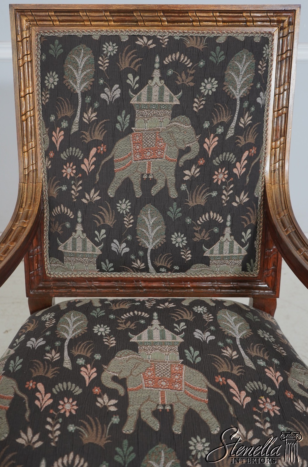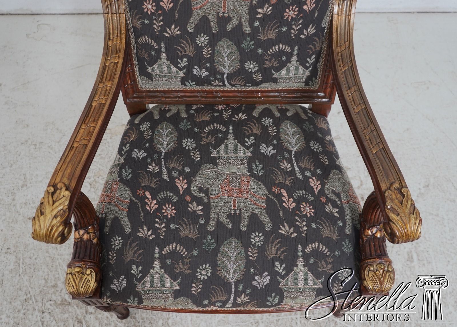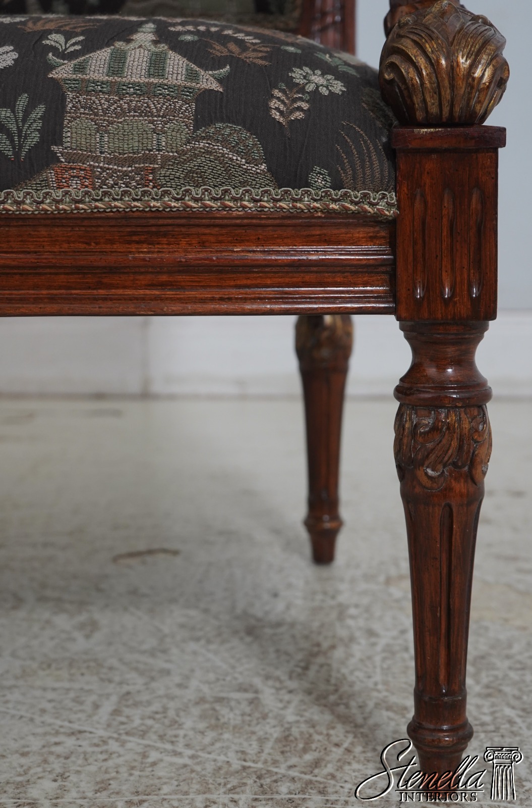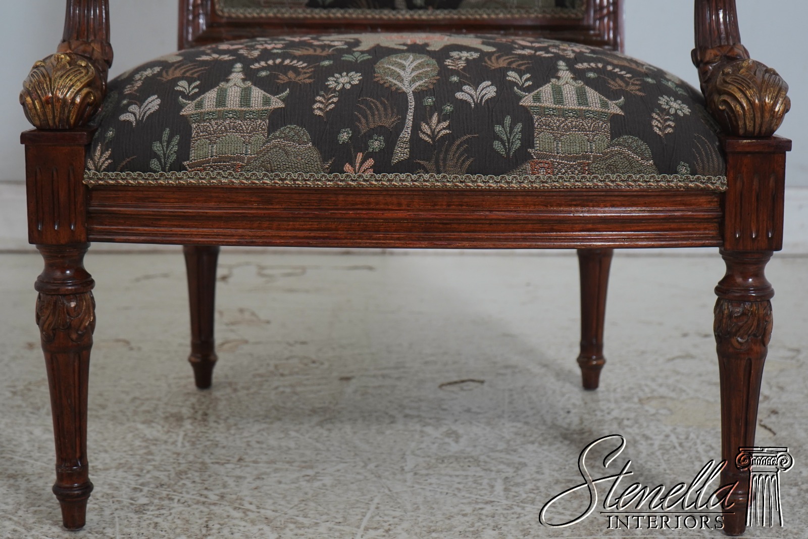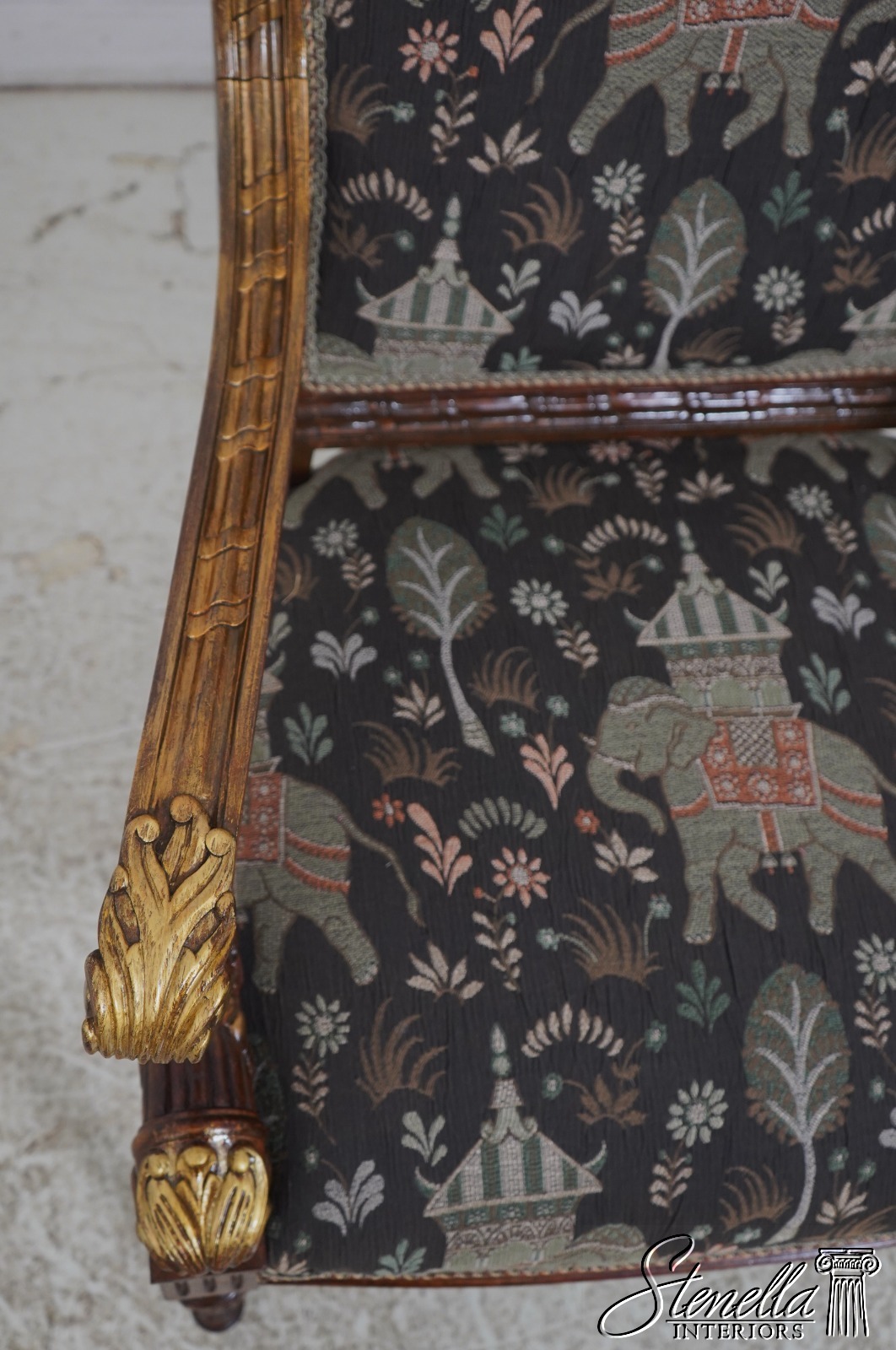 Details: French Louis XVI Style Fine Carved Details Quality Construction Quality Upholstery Professionally Redone Scroll Arms Impressive Elegant Design Gold Gilt Accents New Upholstery w. Elephant & Palanquin Motif Tapered & Fluted Legs Leaf Carvings w. Gold Highlights Un-Marked As To Manufacture Offered @ Fraction Original Retail Cost
