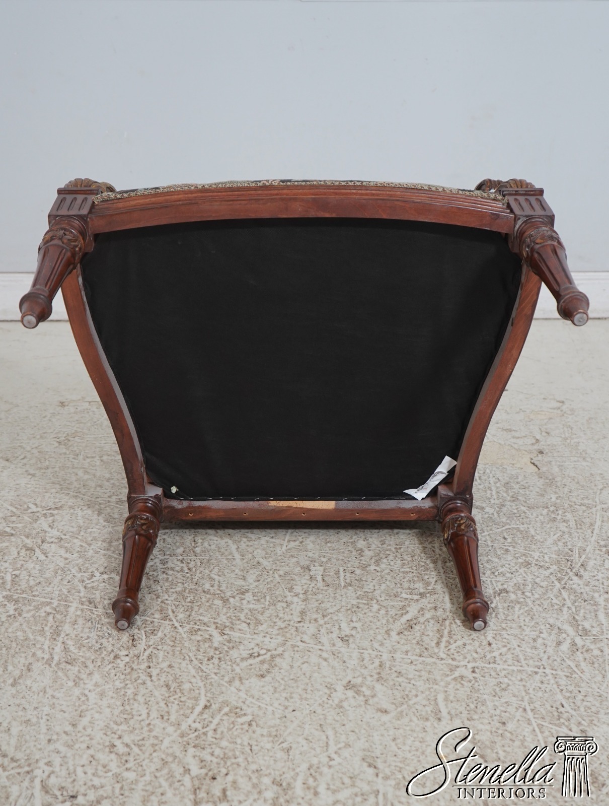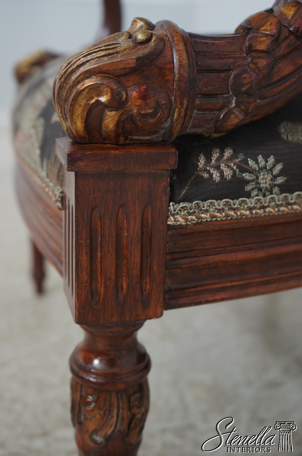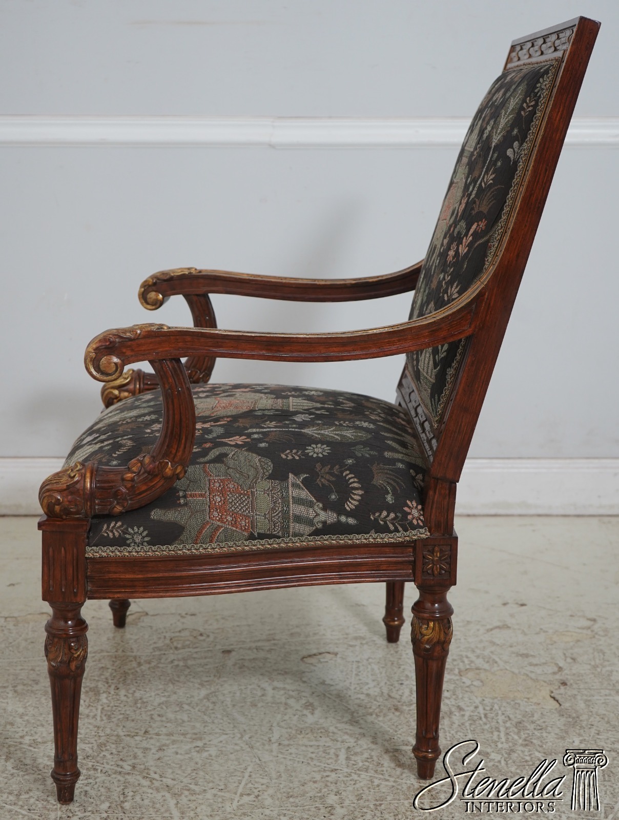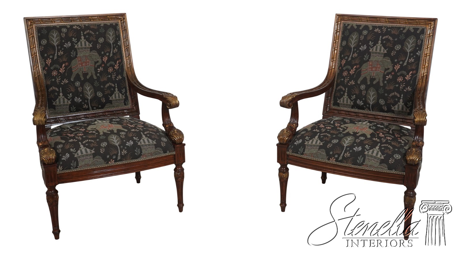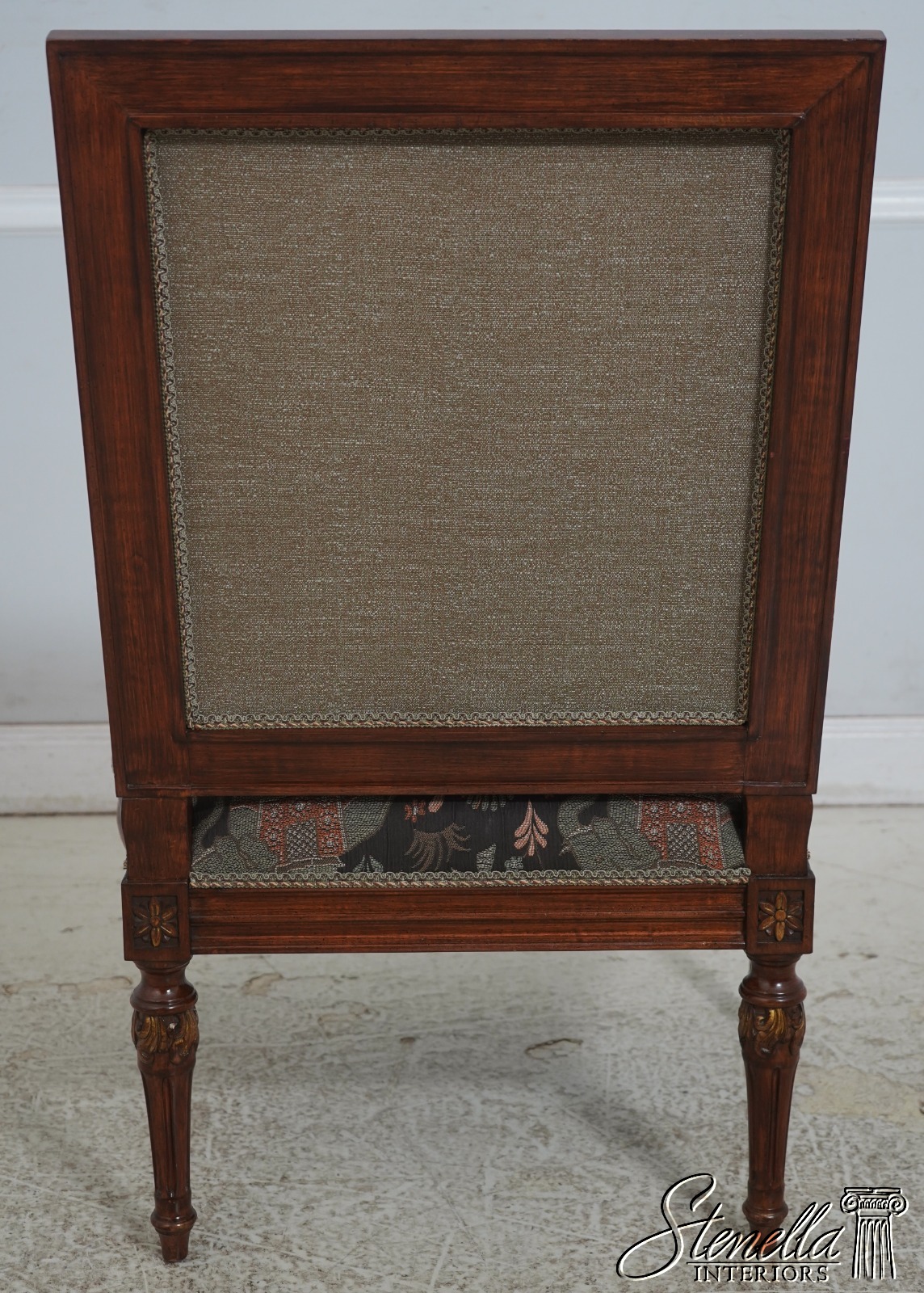 Details: French Louis XVI Style Fine Carved Details Quality Construction Quality Upholstery Professionally Redone Scroll Arms Impressive Elegant Design Gold Gilt Accents New Upholstery w. Elephant & Palanquin Motif Tapered & Fluted Legs Leaf Carvings w. Gold Highlights Un-Marked As To Manufacture Offered @ Fraction Original Retail Cost