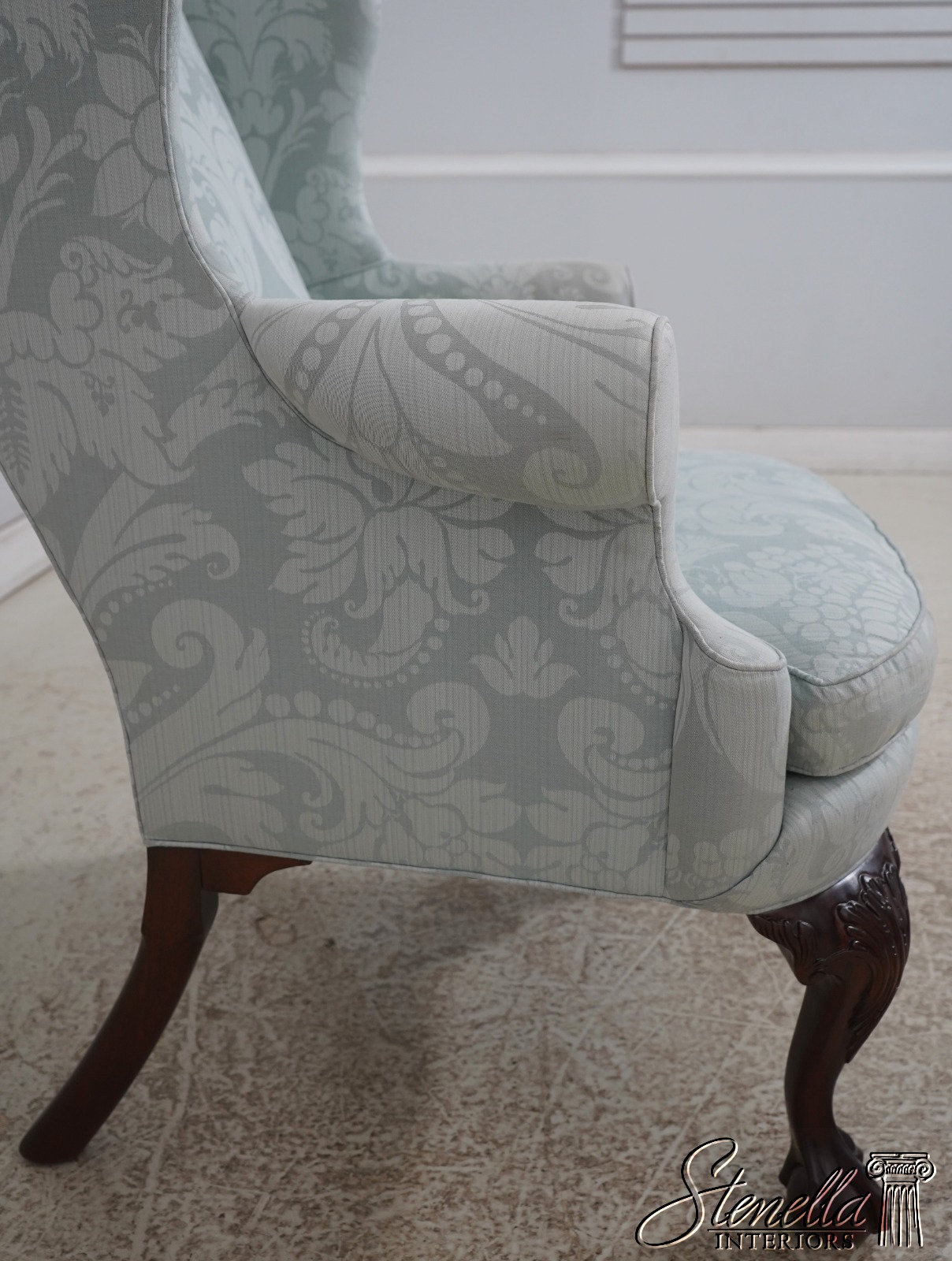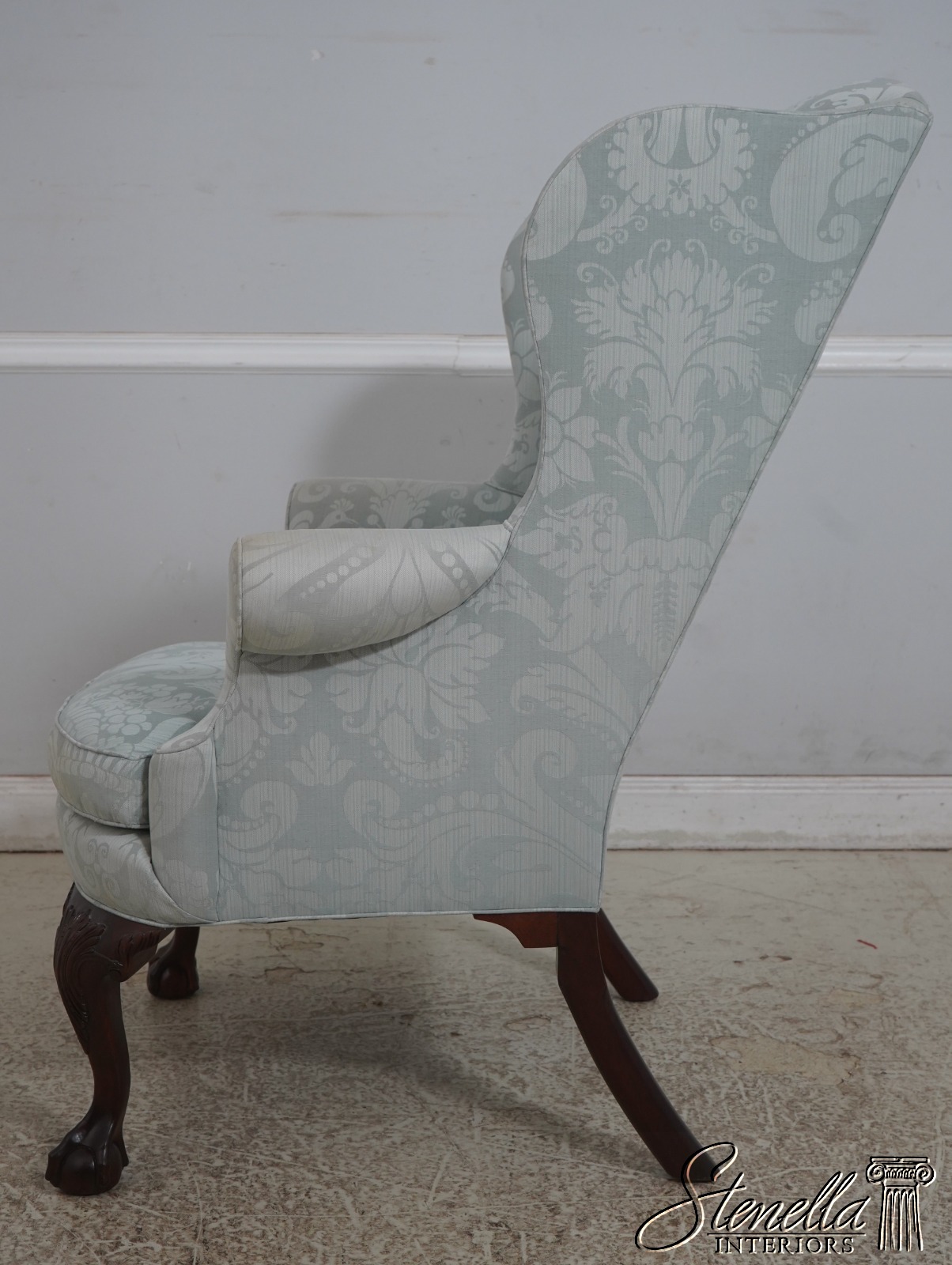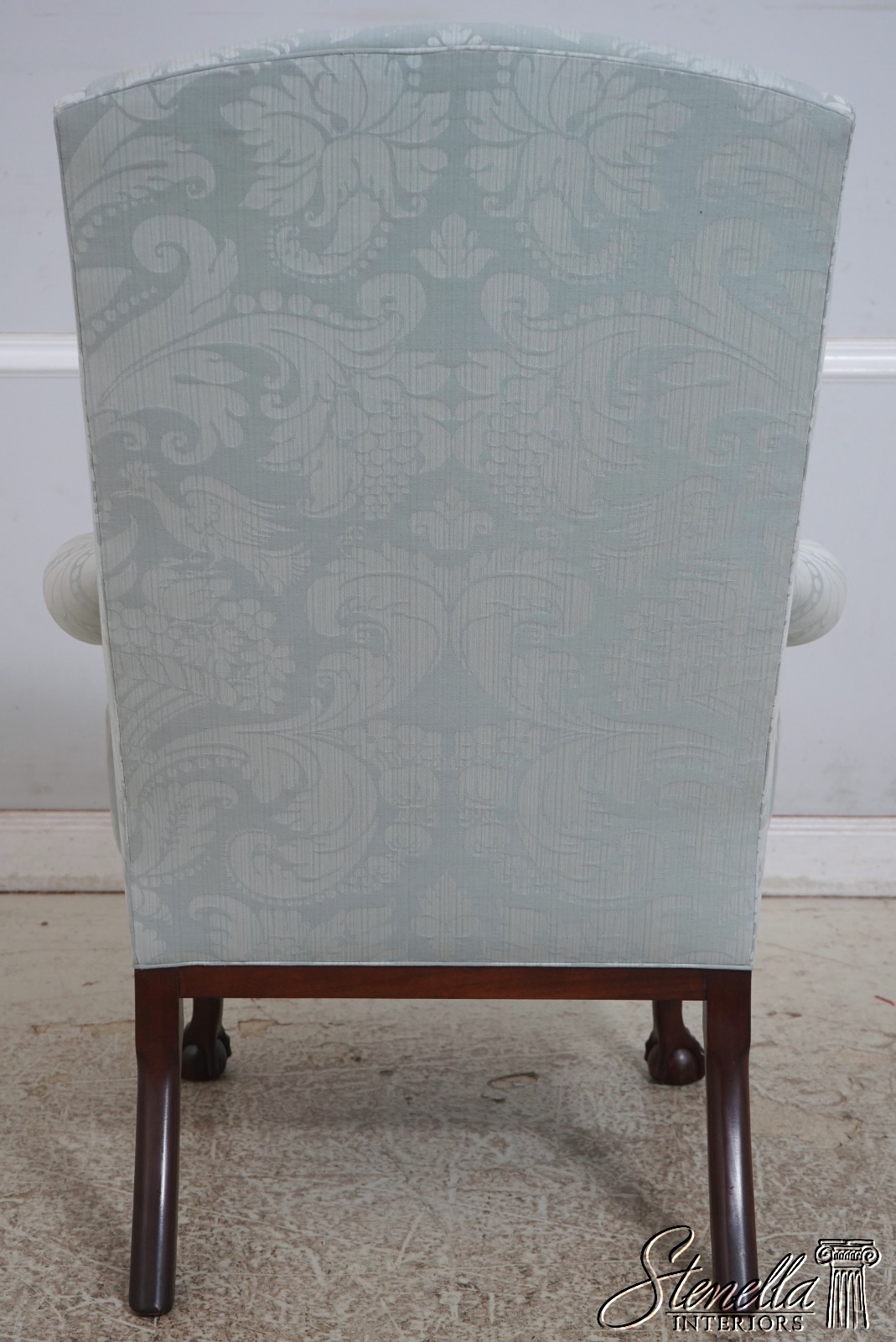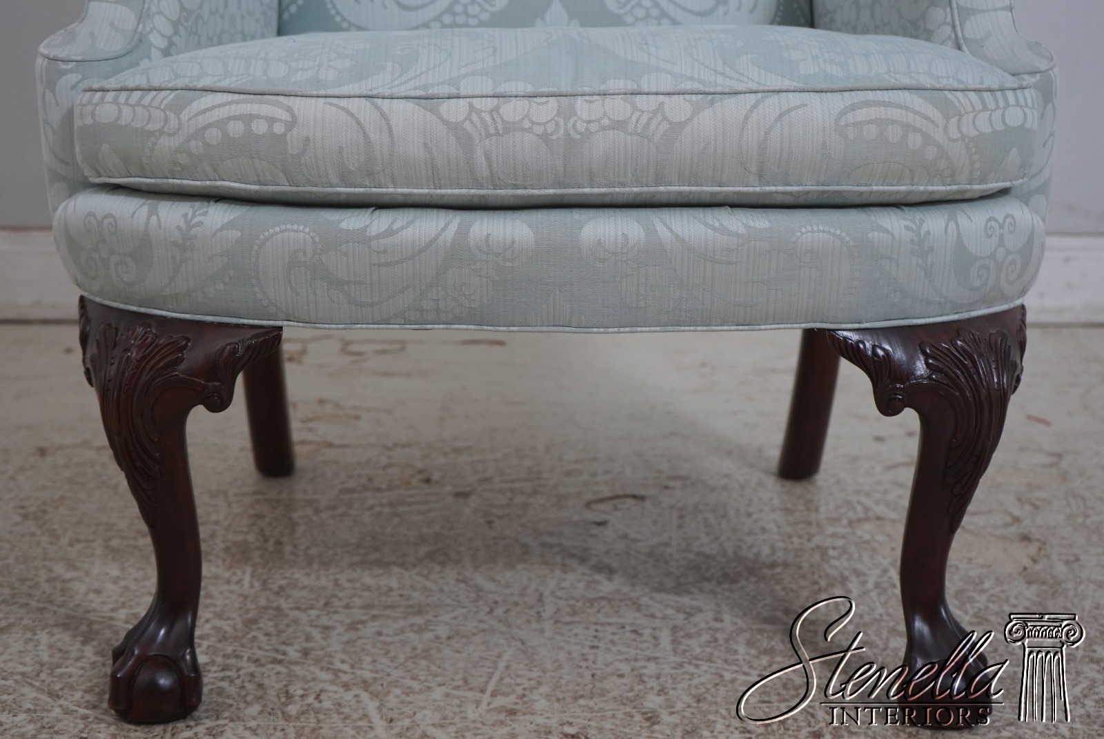 Details: Model WA-2013 Solid Mahogany Legs Ball & Claw Feet High Quality Construction See Other Offerings For Matching Ottoman 18 C. Design Chippendale Style Traditional Style Chairs Appears To Have Been Rarely Used If Ever Quality Original Light Blue Damask Upholstery Offered @ Fraction Original Retail Cost