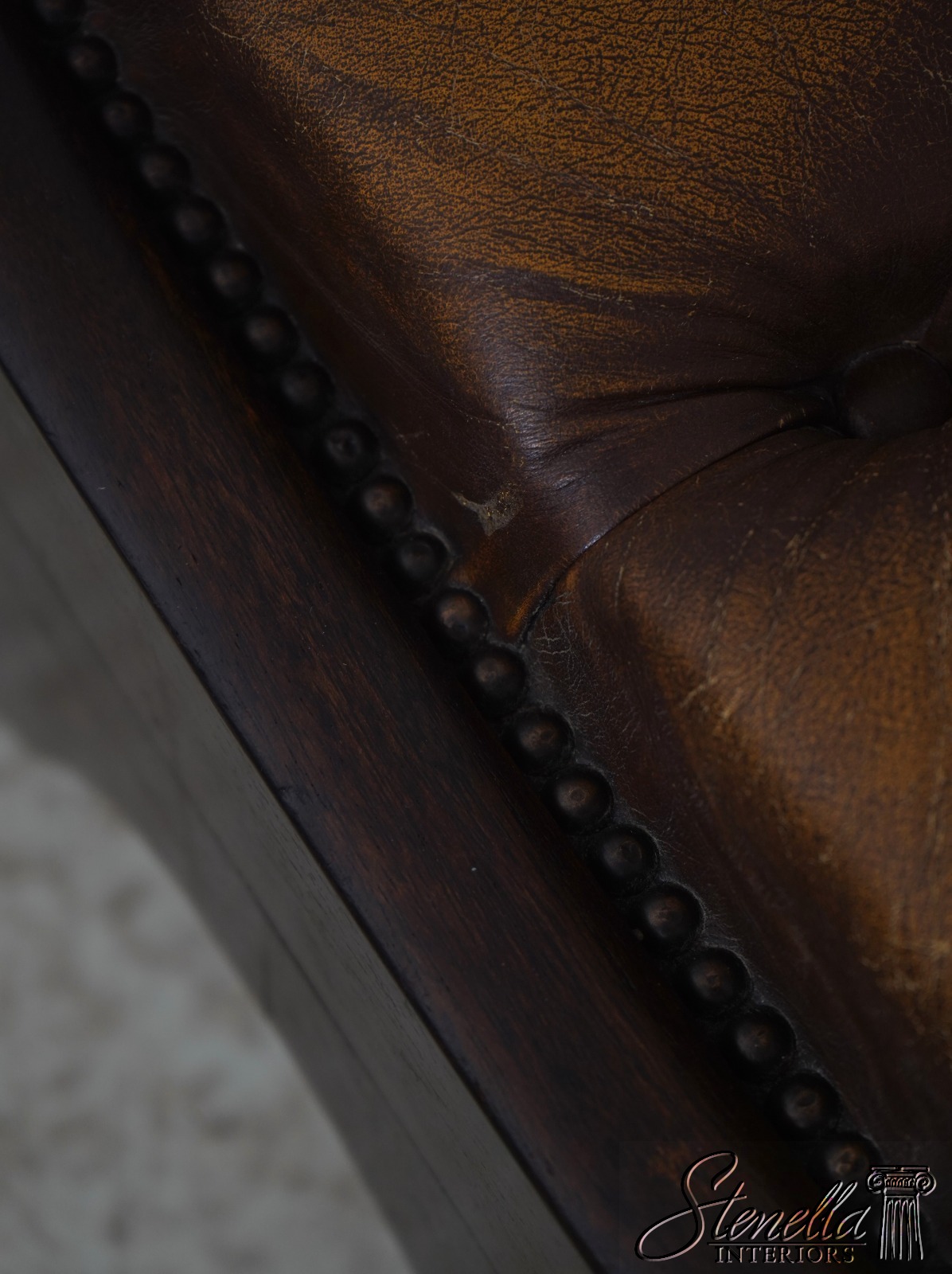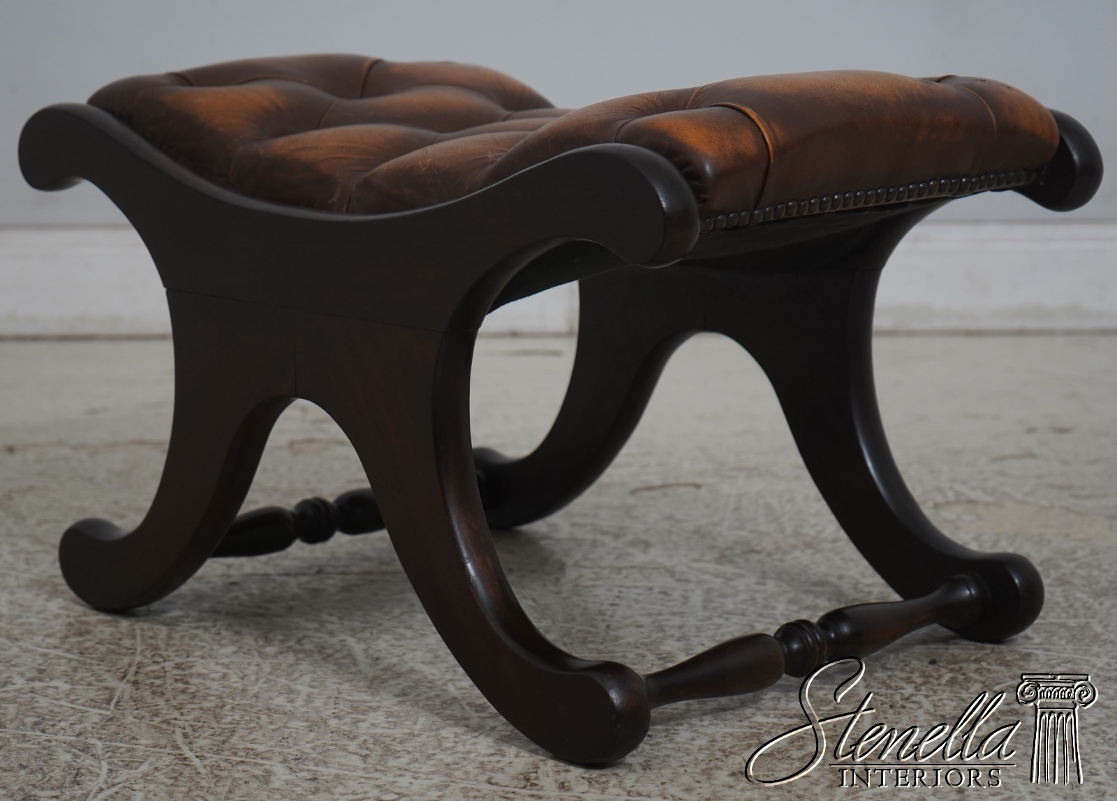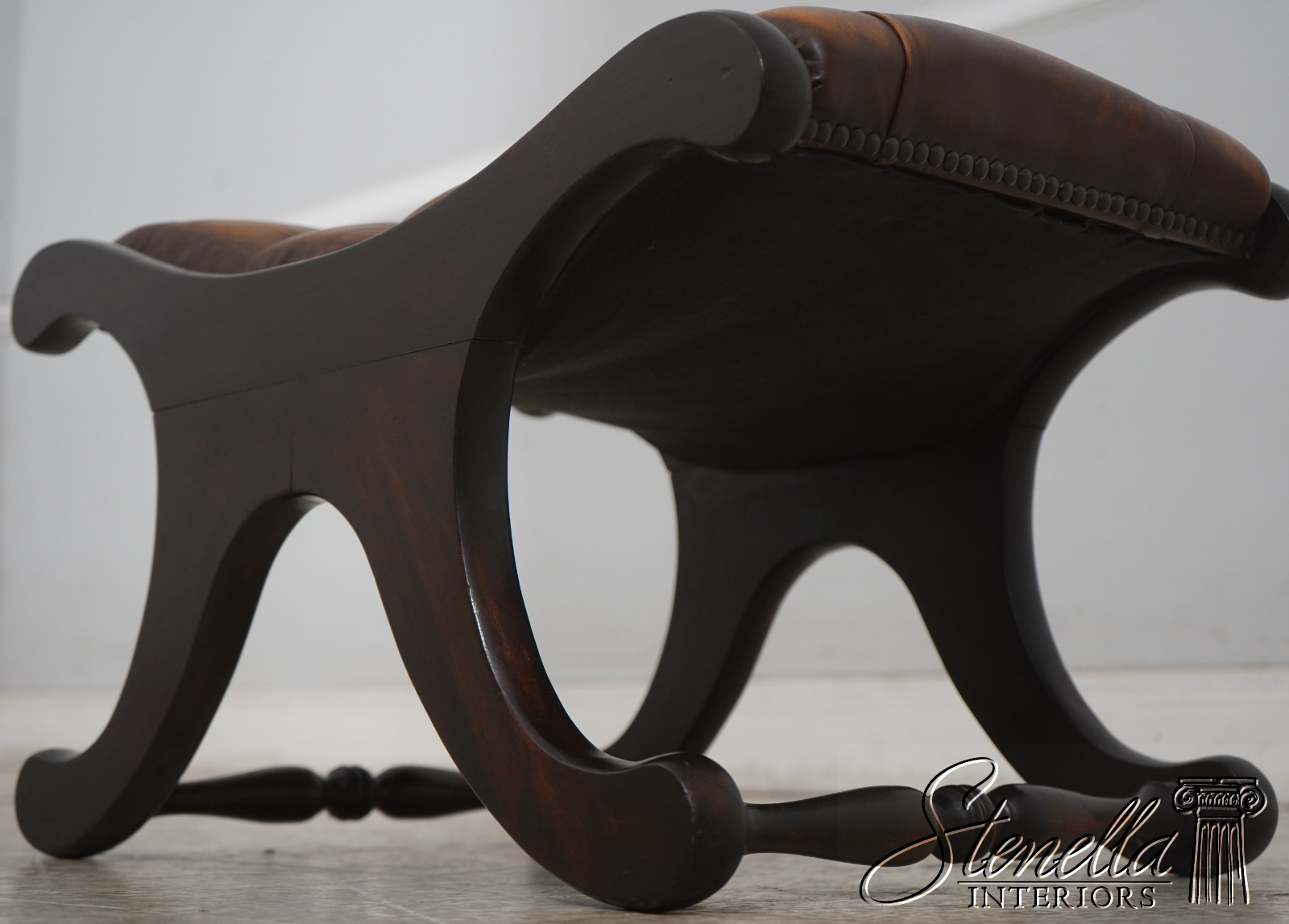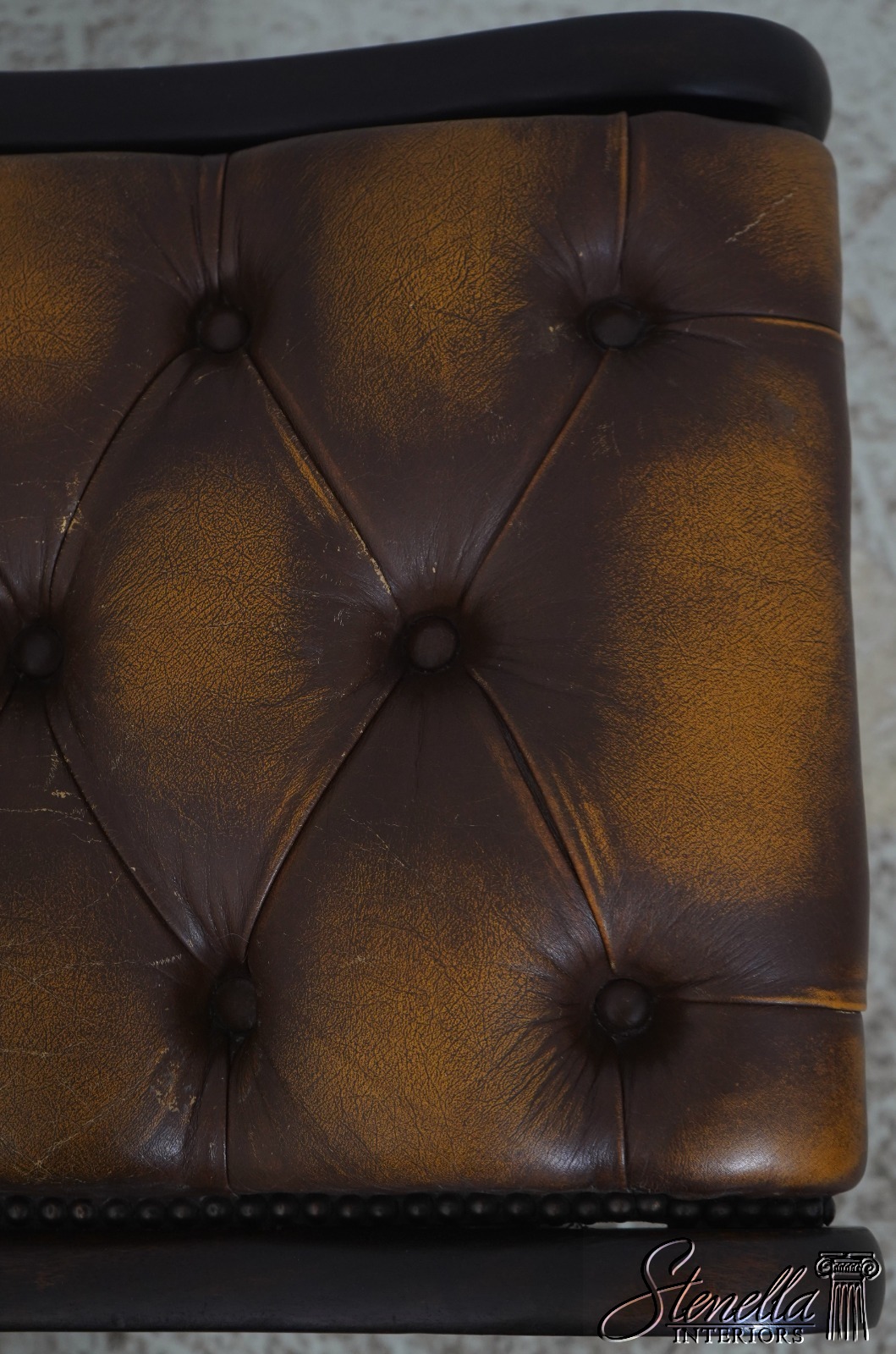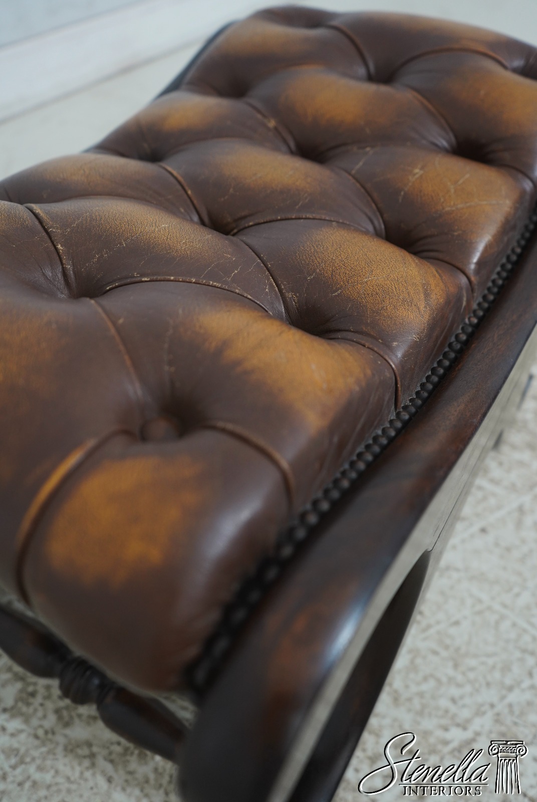 Details: Mahogany Brass Capped Feet & Casters High Quality Construction Nice Tooled Leather English Style Traditional Style Quality Brown Leather Stretcher Base Frame Ottoman Nice Turned Legs Tack Head Trim Offered @ Fraction Original Retail Cost