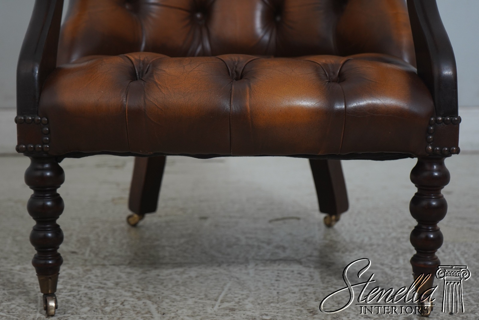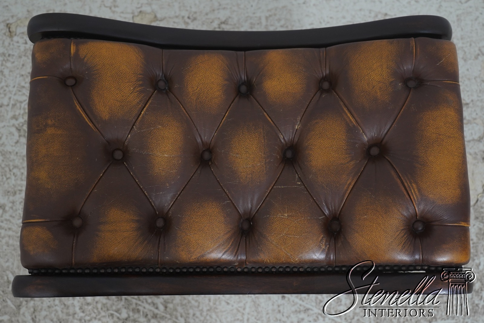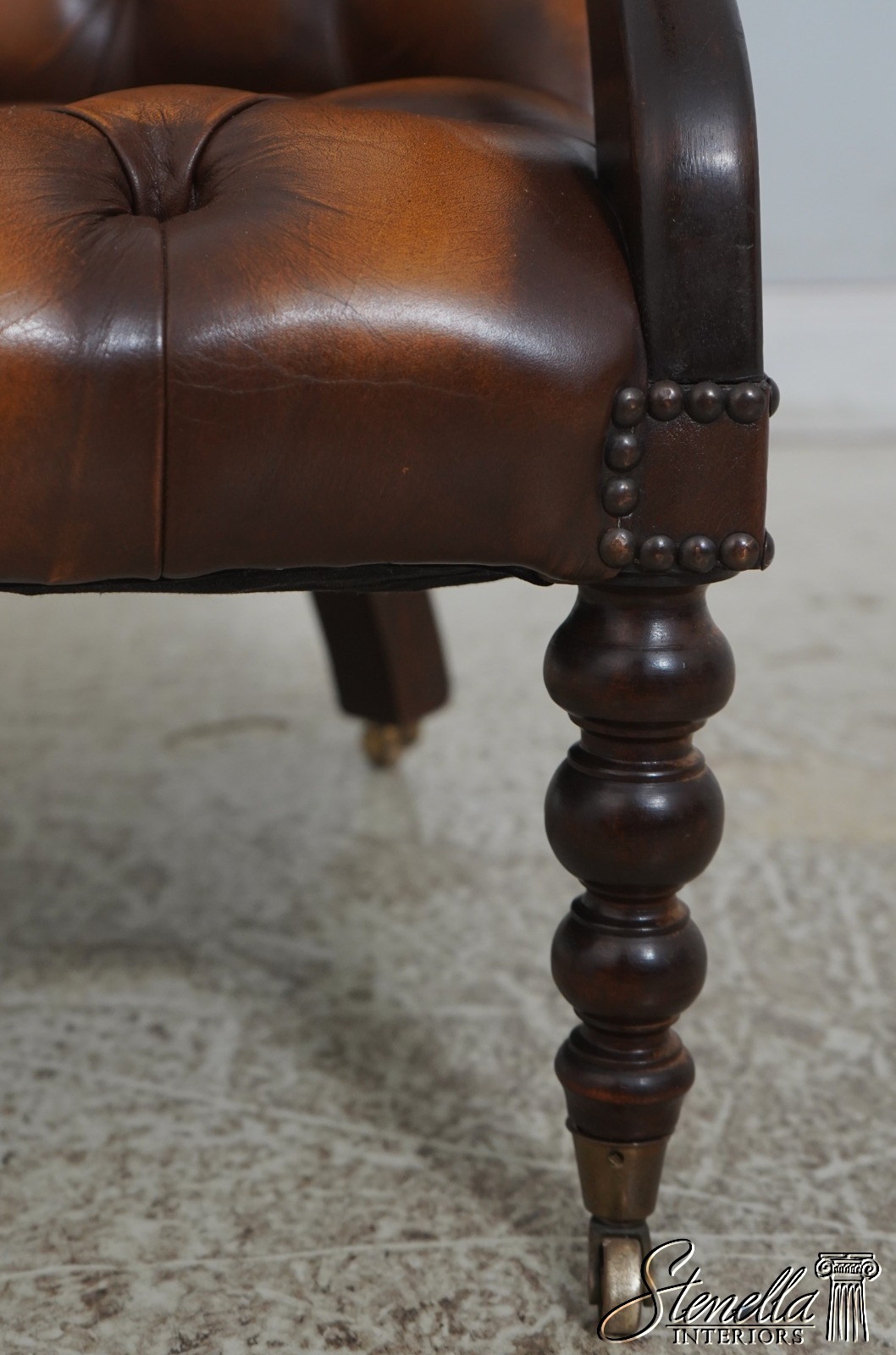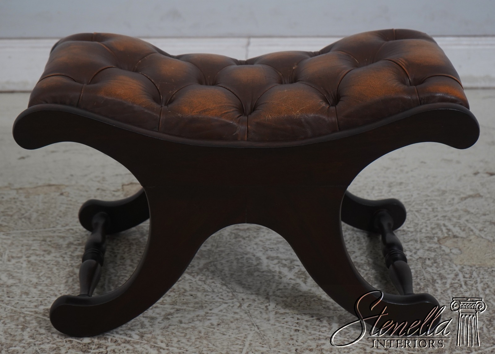 Details: Mahogany Brass Capped Feet & Casters High Quality Construction Nice Tooled Leather English Style Traditional Style Quality Brown Leather Stretcher Base Frame Ottoman Nice Turned Legs Tack Head Trim Offered @ Fraction Original Retail Cost