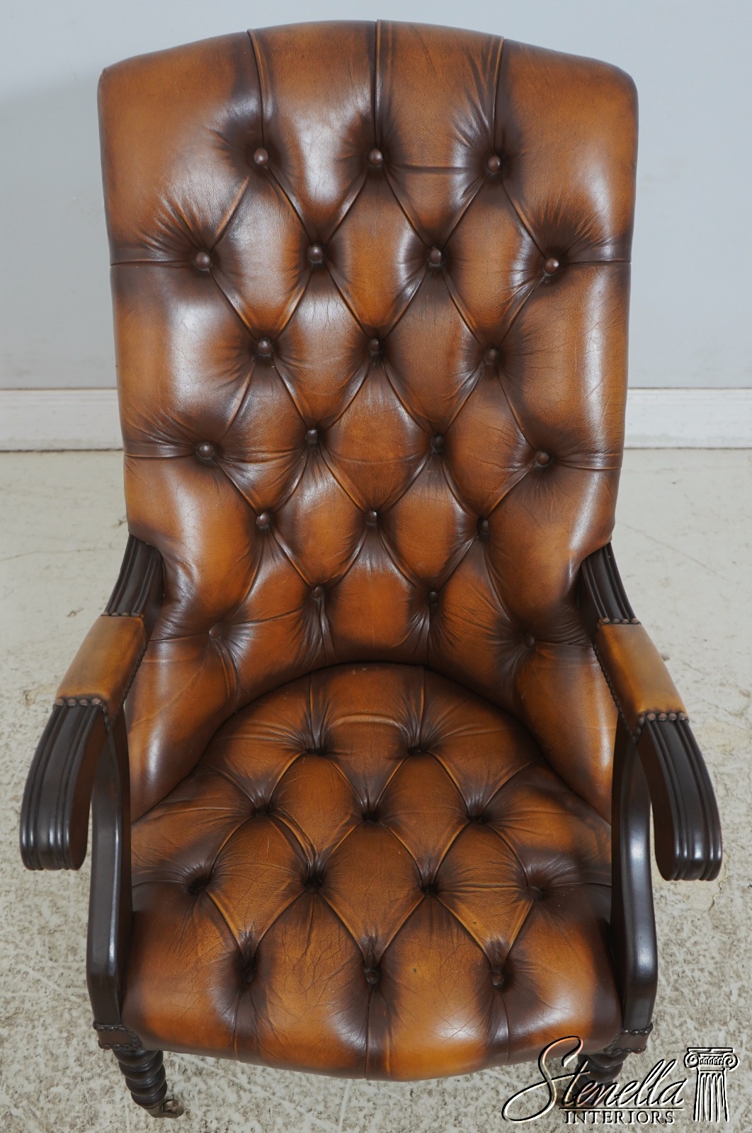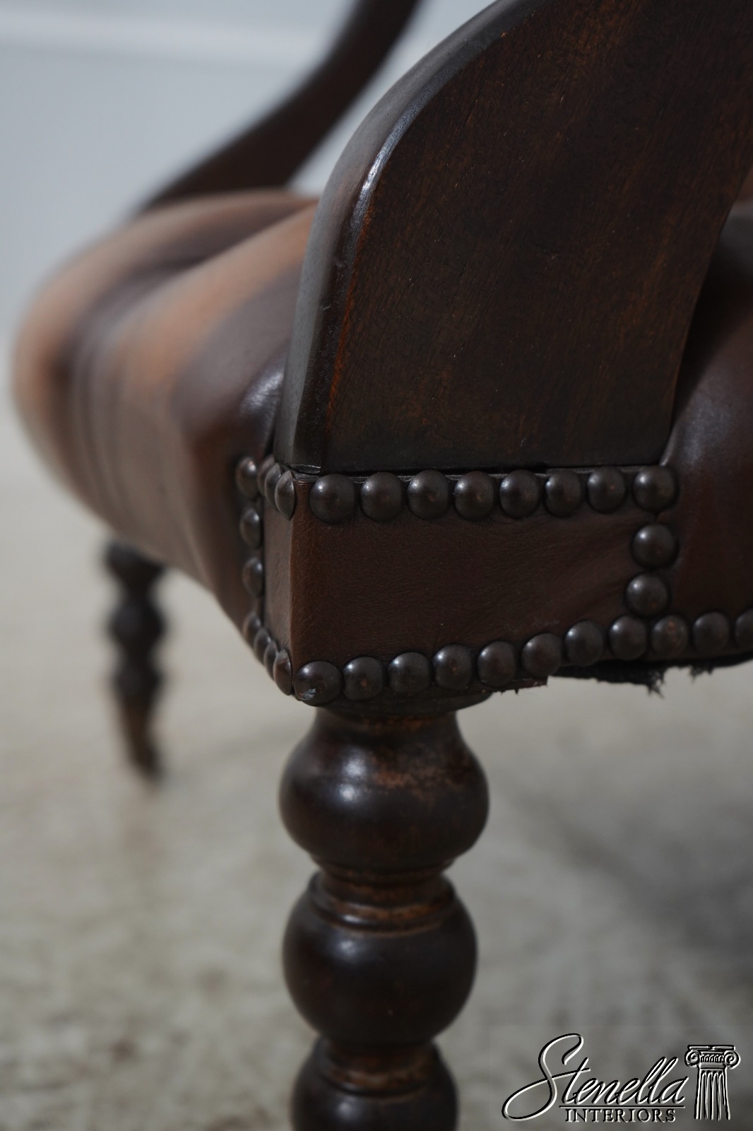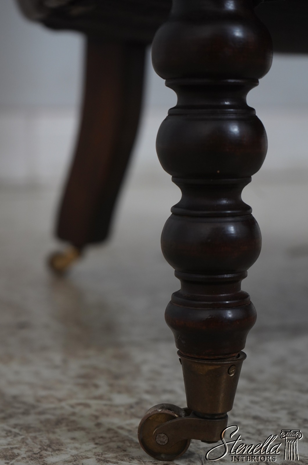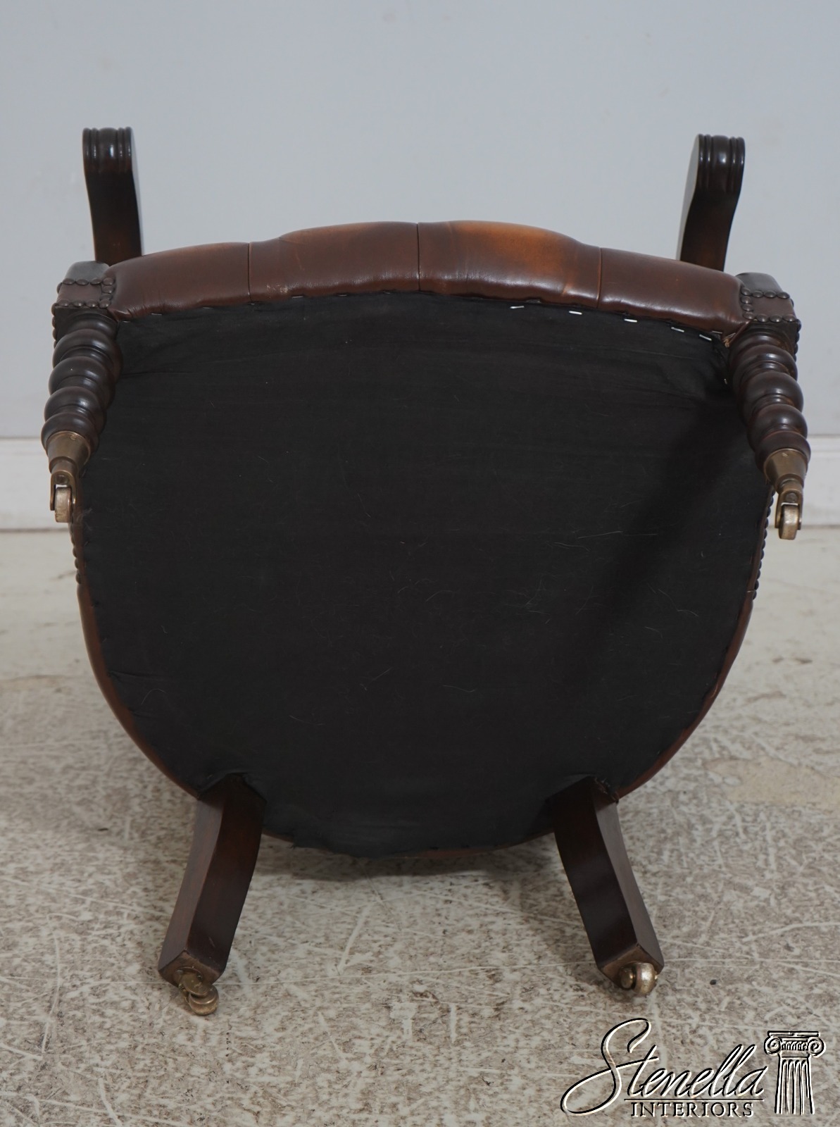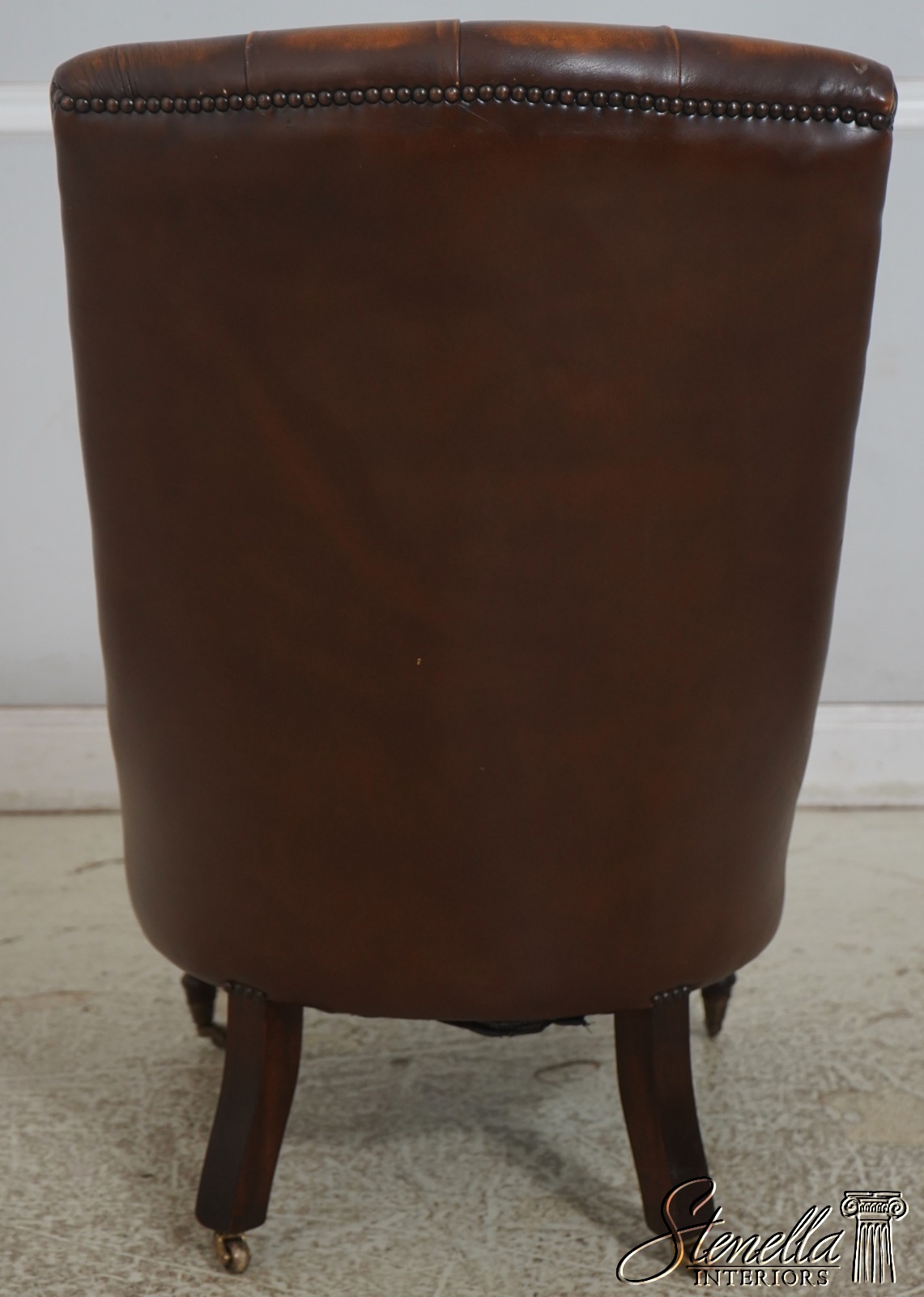 Details: Mahogany Brass Capped Feet & Casters High Quality Construction Nice Tooled Leather English Style Traditional Style Quality Brown Leather Stretcher Base Frame Ottoman Nice Turned Legs Tack Head Trim Offered @ Fraction Original Retail Cost